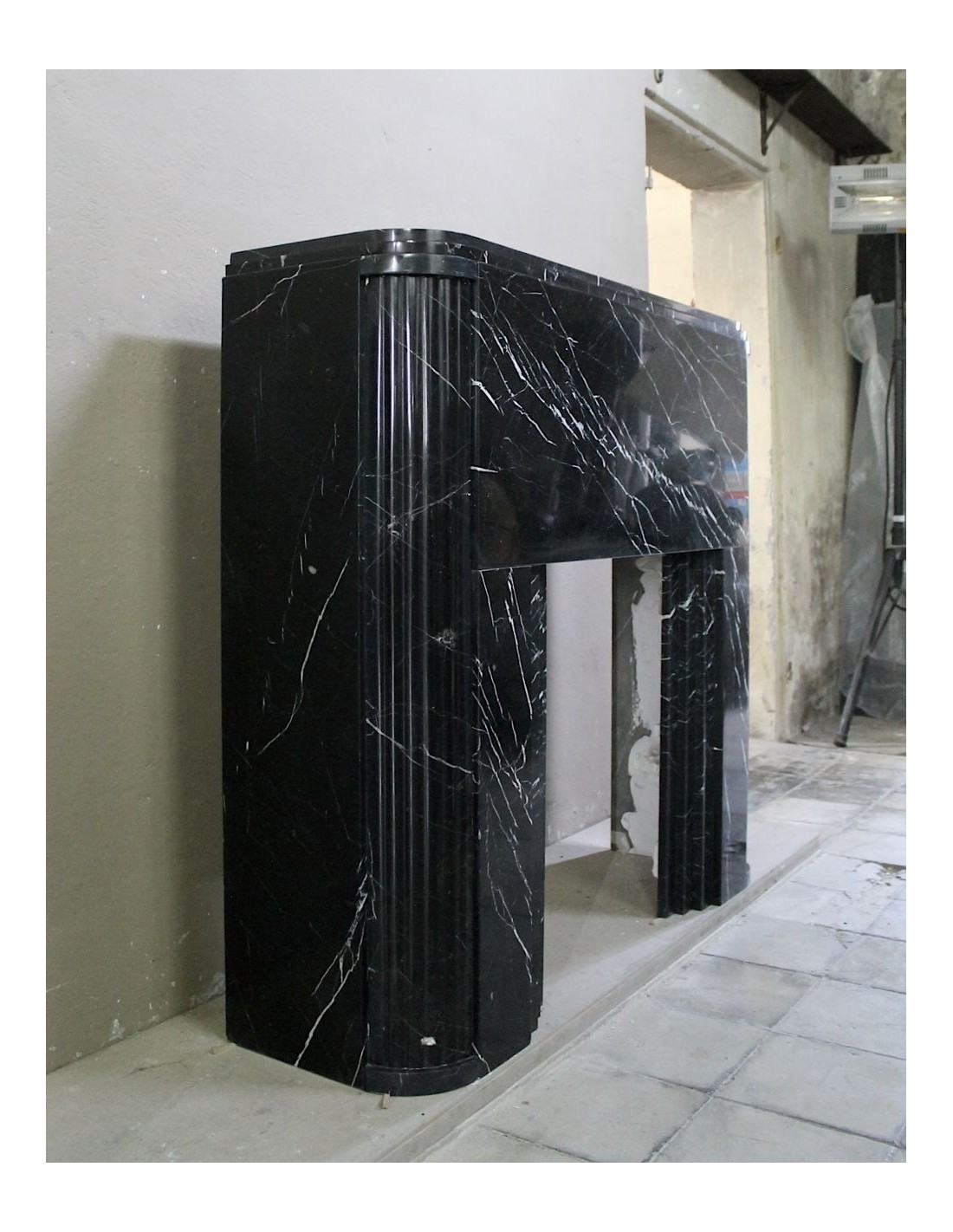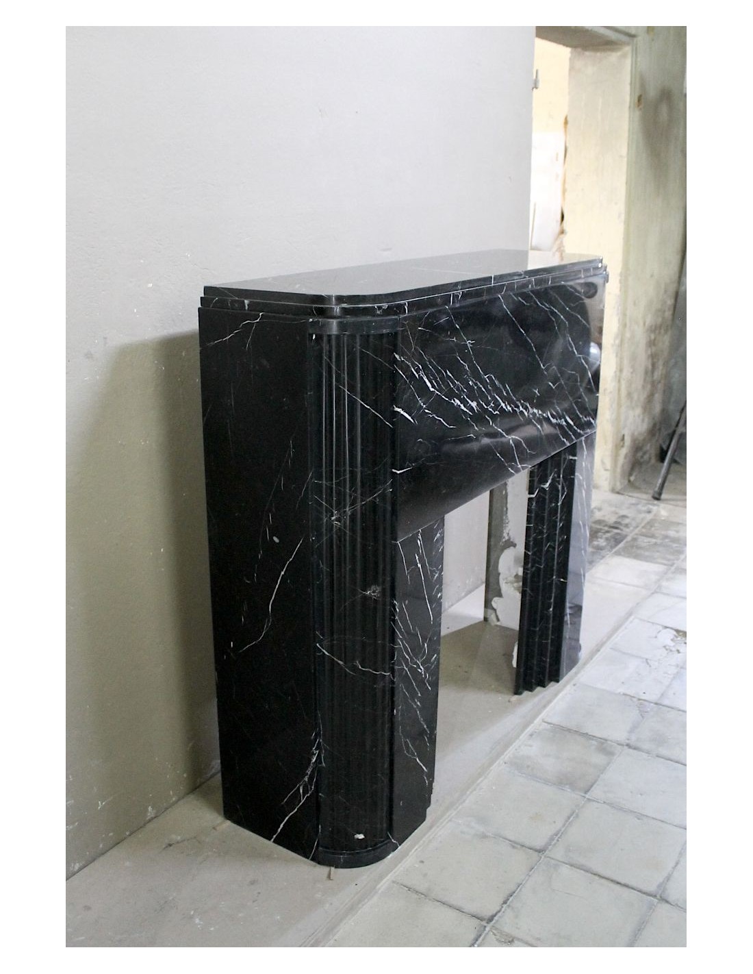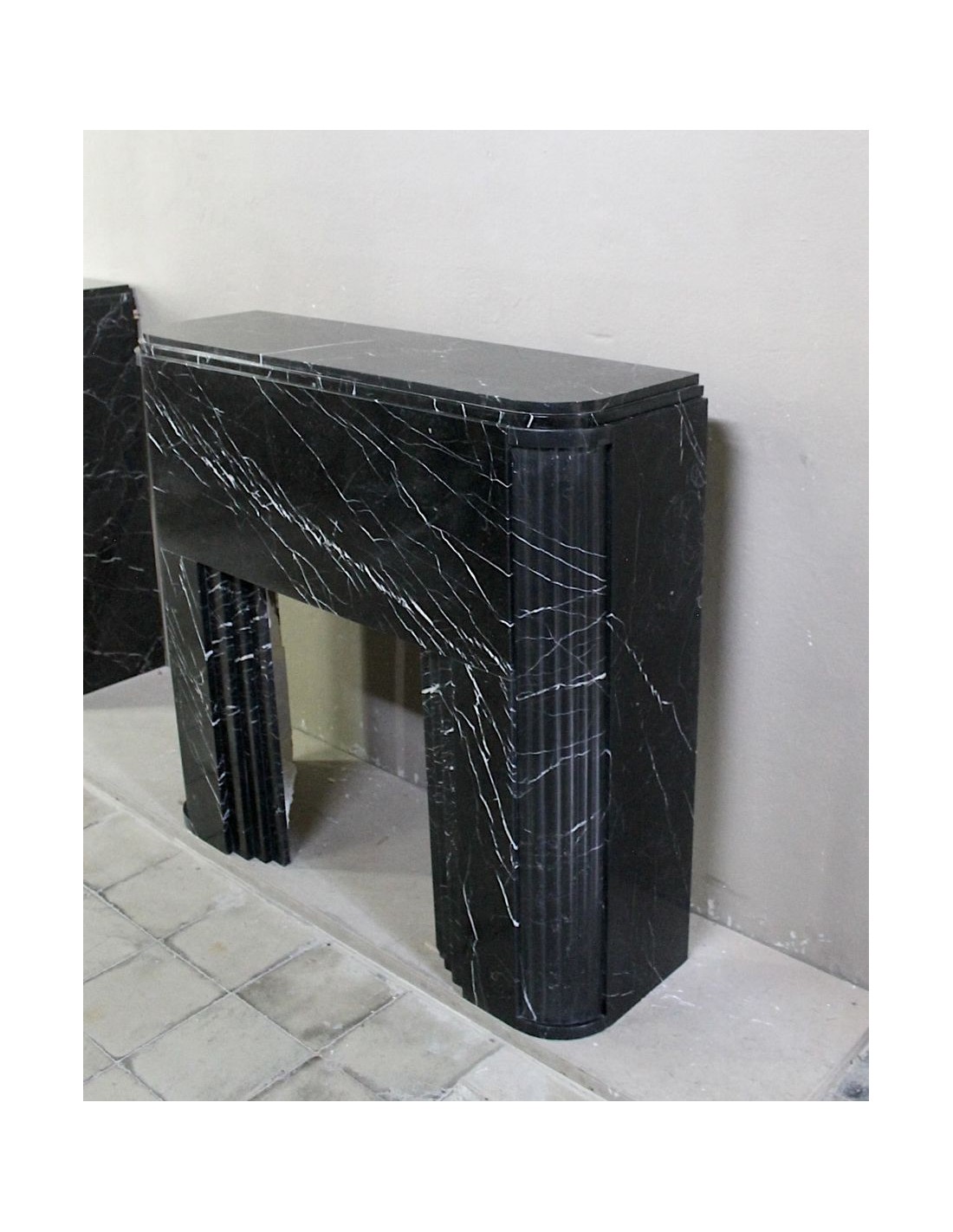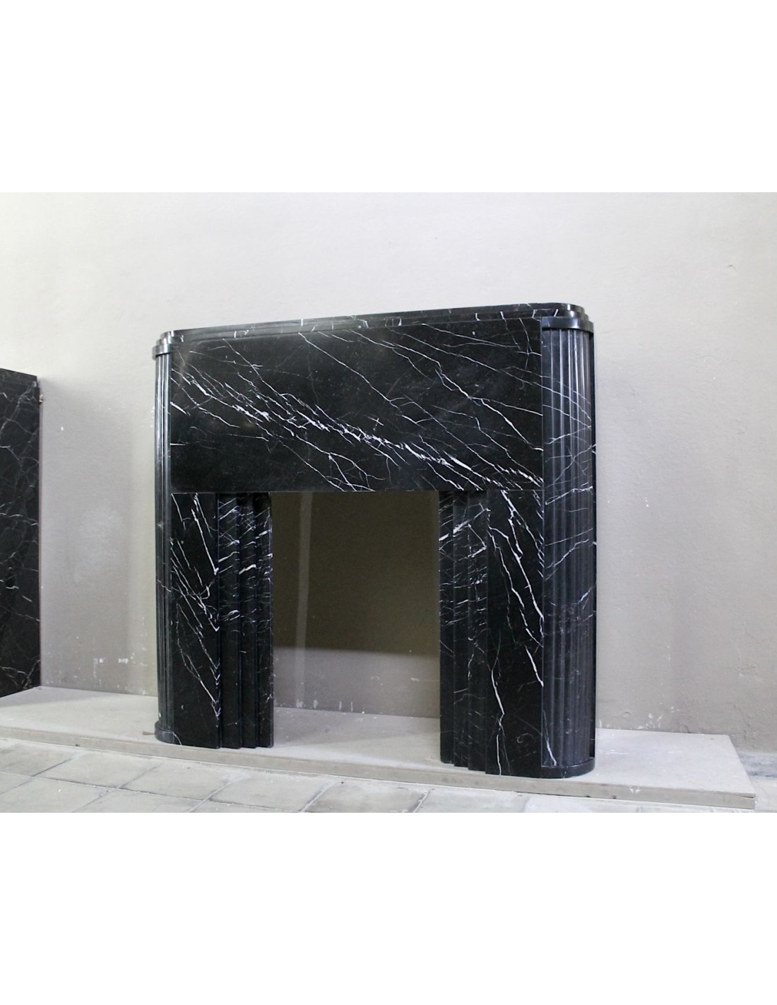 Antique Art Deco fireplace surround carved from Nero Marquinia marble. This is an authentic fireplace, carved in the 1930s, and coming from Paris. Its design is iconic. The legs, with a rounded half-moon design, are fluted throughout. The front, smooth and elegant, highlights the many thin, refined white veins that branch out against the black marble background. Completing the whole is the shelf, which is double, also half-moon.