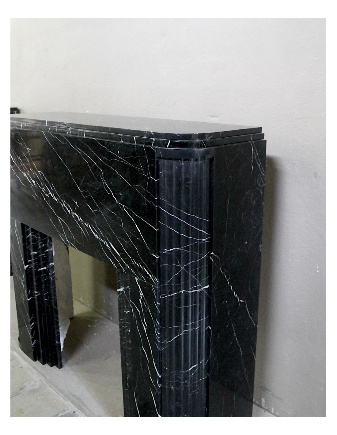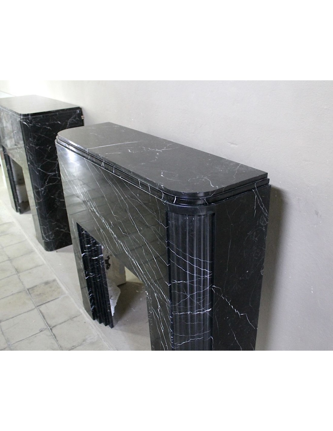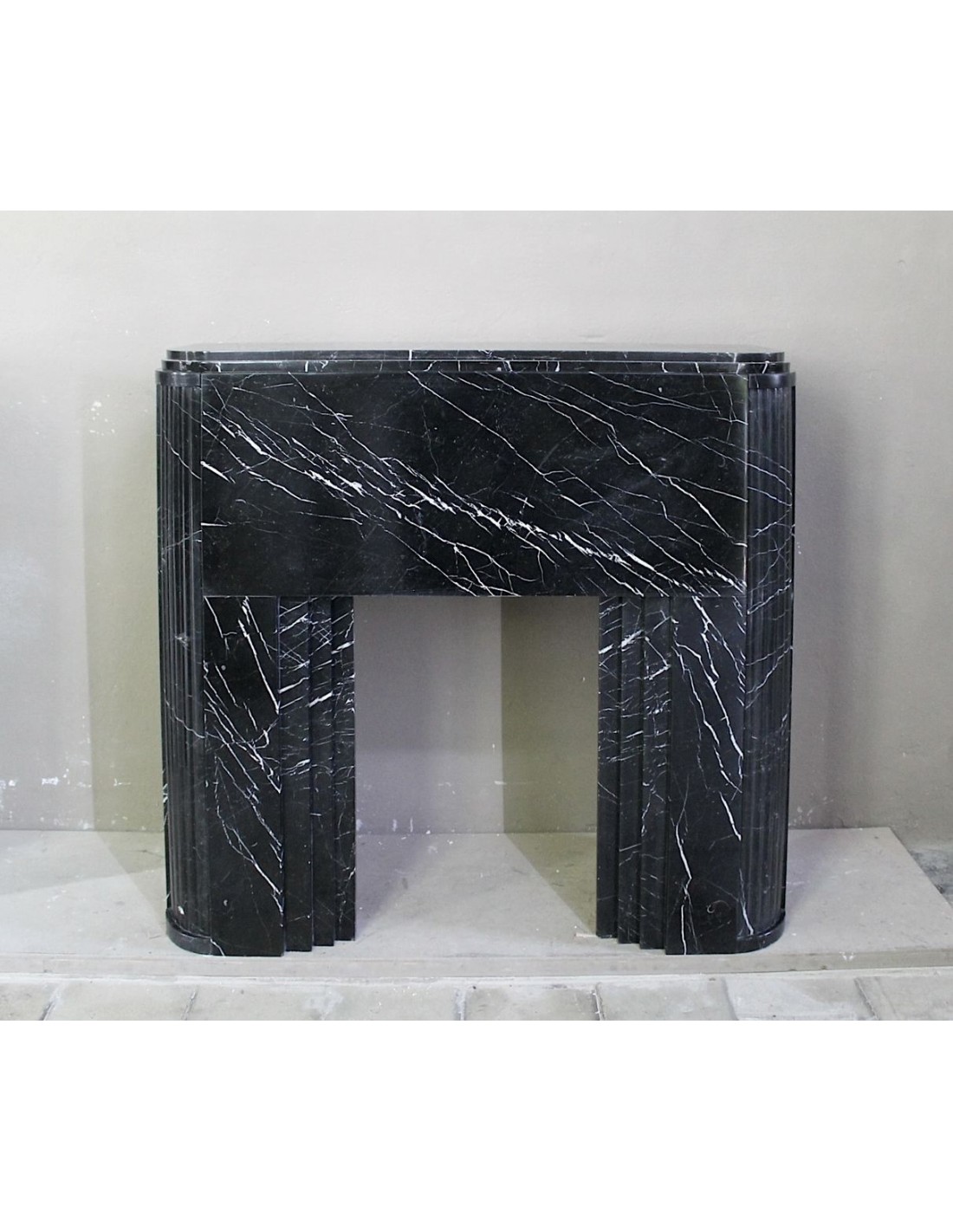 Antique Art Deco fireplace surround carved from Nero Marquinia marble. This is an authentic fireplace, carved in the 1930s, and coming from Paris. Its design is iconic. The legs, with a rounded half-moon design, are fluted throughout. The front, smooth and elegant, highlights the many thin, refined white veins that branch out against the black marble background. Completing the whole is the shelf, which is double, also half-moon.