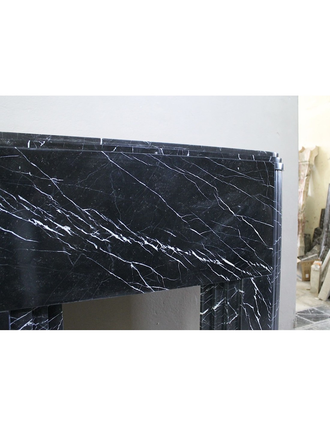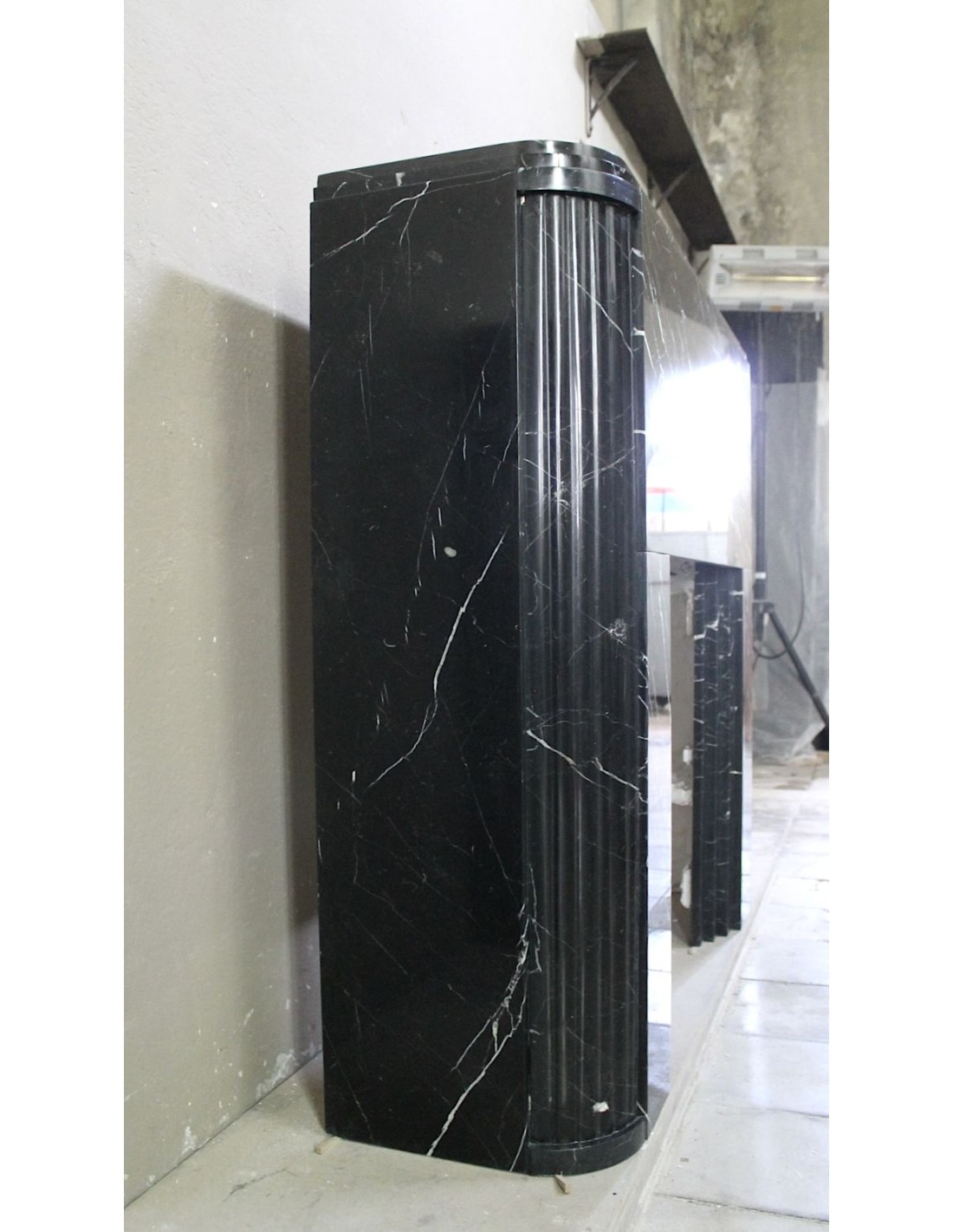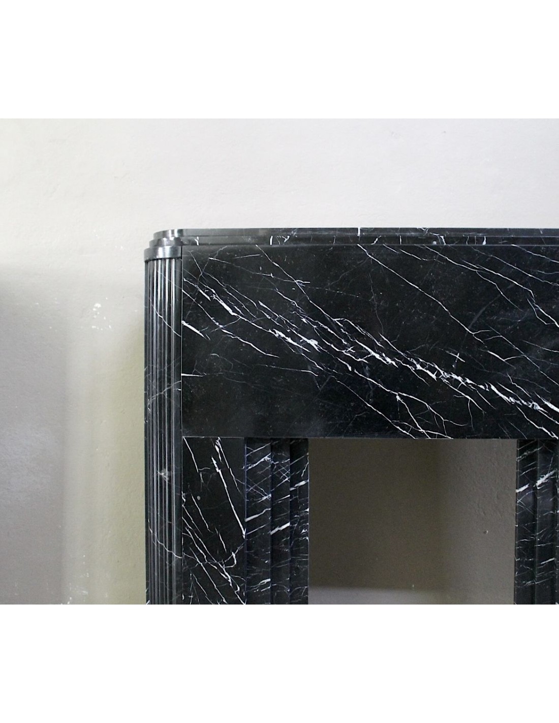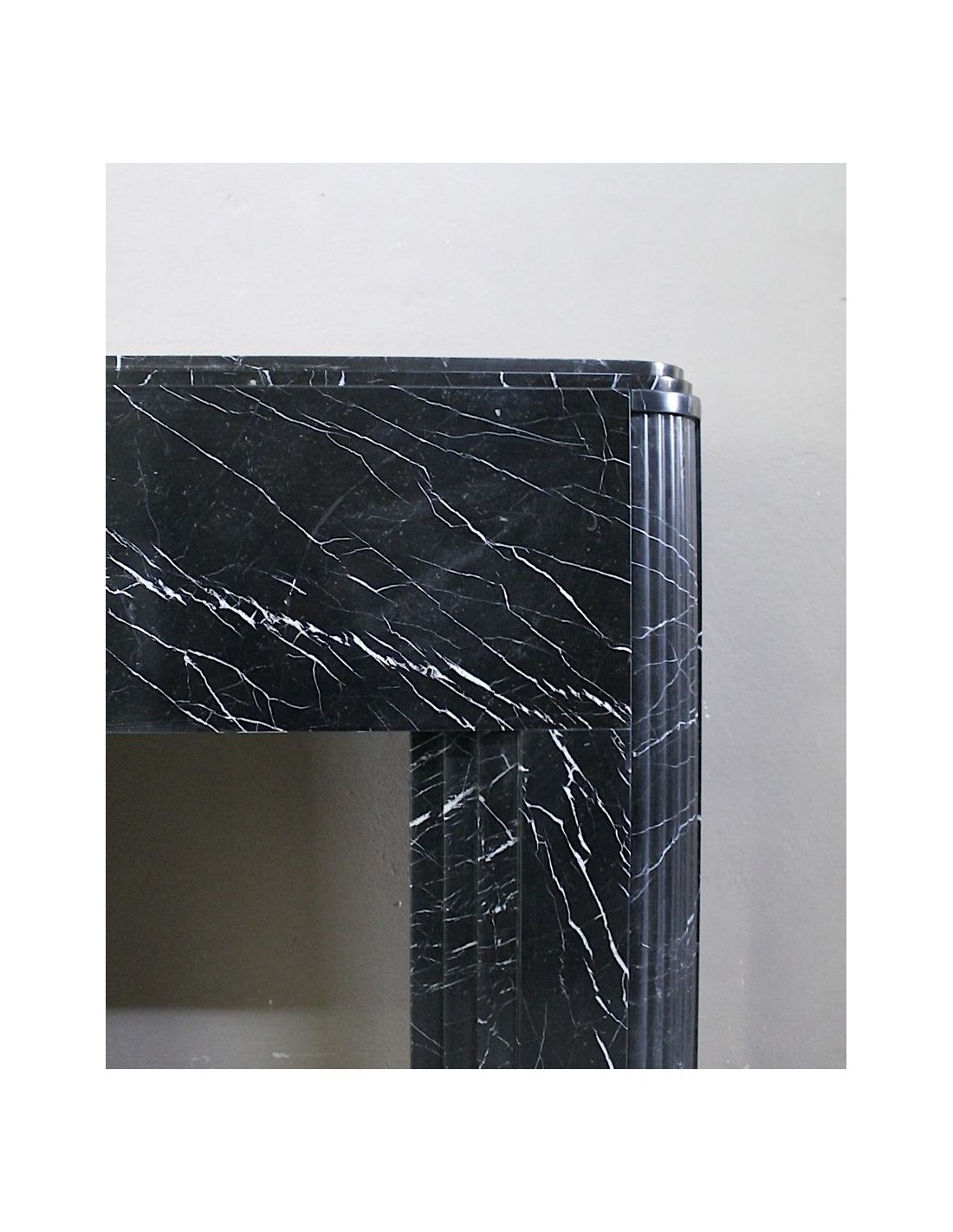 Antique Art Deco fireplace surround carved from Nero Marquinia marble. This is an authentic fireplace, carved in the 1930s, and coming from Paris. Its design is iconic. The legs, with a rounded half-moon design, are fluted throughout. The front, smooth and elegant, highlights the many thin, refined white veins that branch out against the black marble background. Completing the whole is the shelf, which is double, also half-moon.