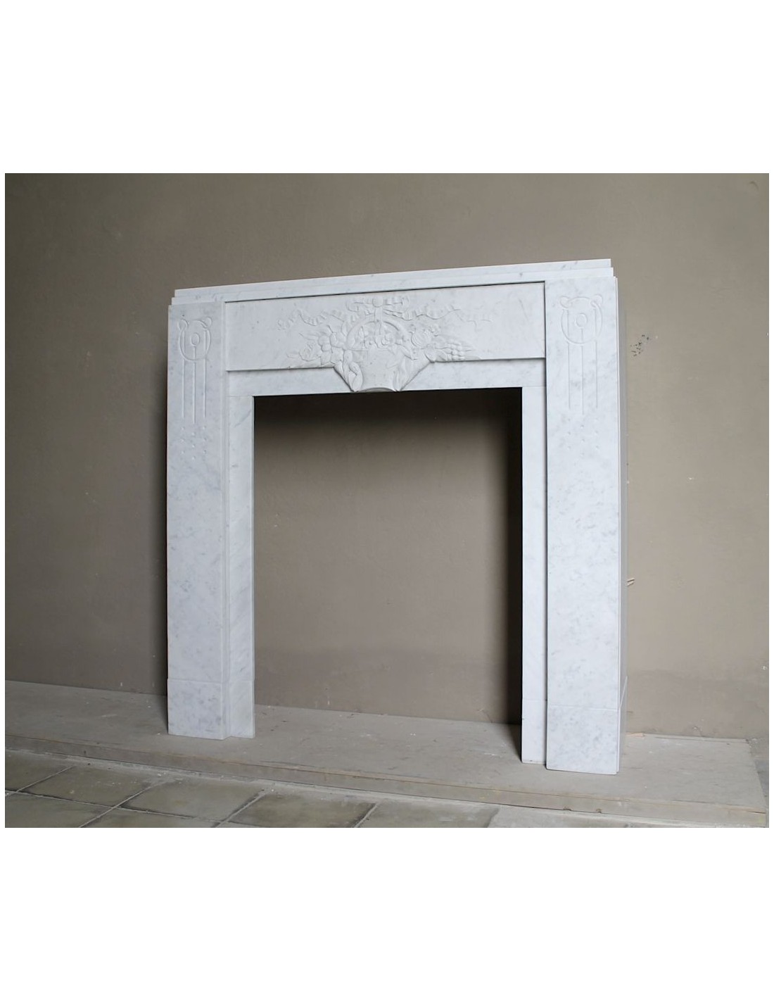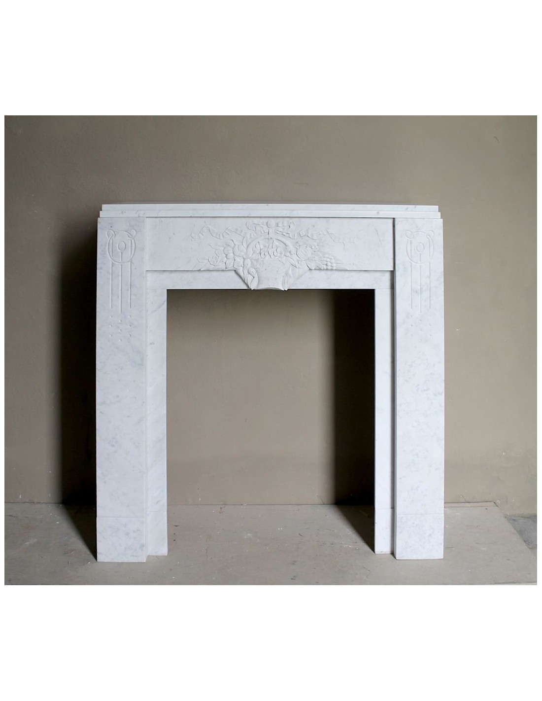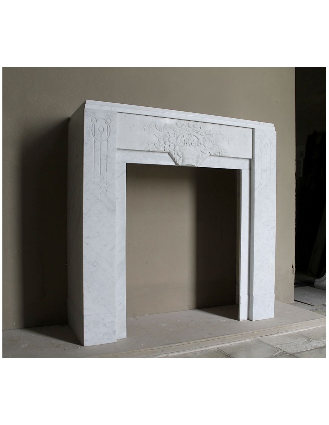 709 ART DECO “PANIER FLEURI” FIREPLACE MANTEL CARVED IN WHITE CARRARA MARBLE, WITH ICONIC ARCHITECTURAL DESIGN