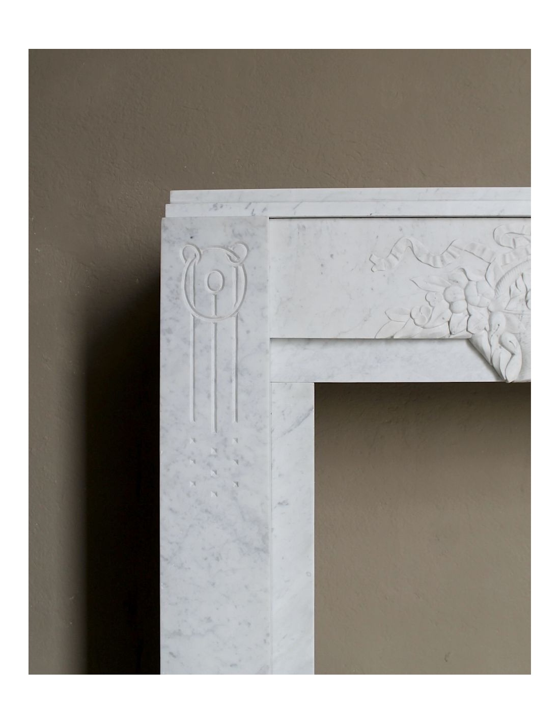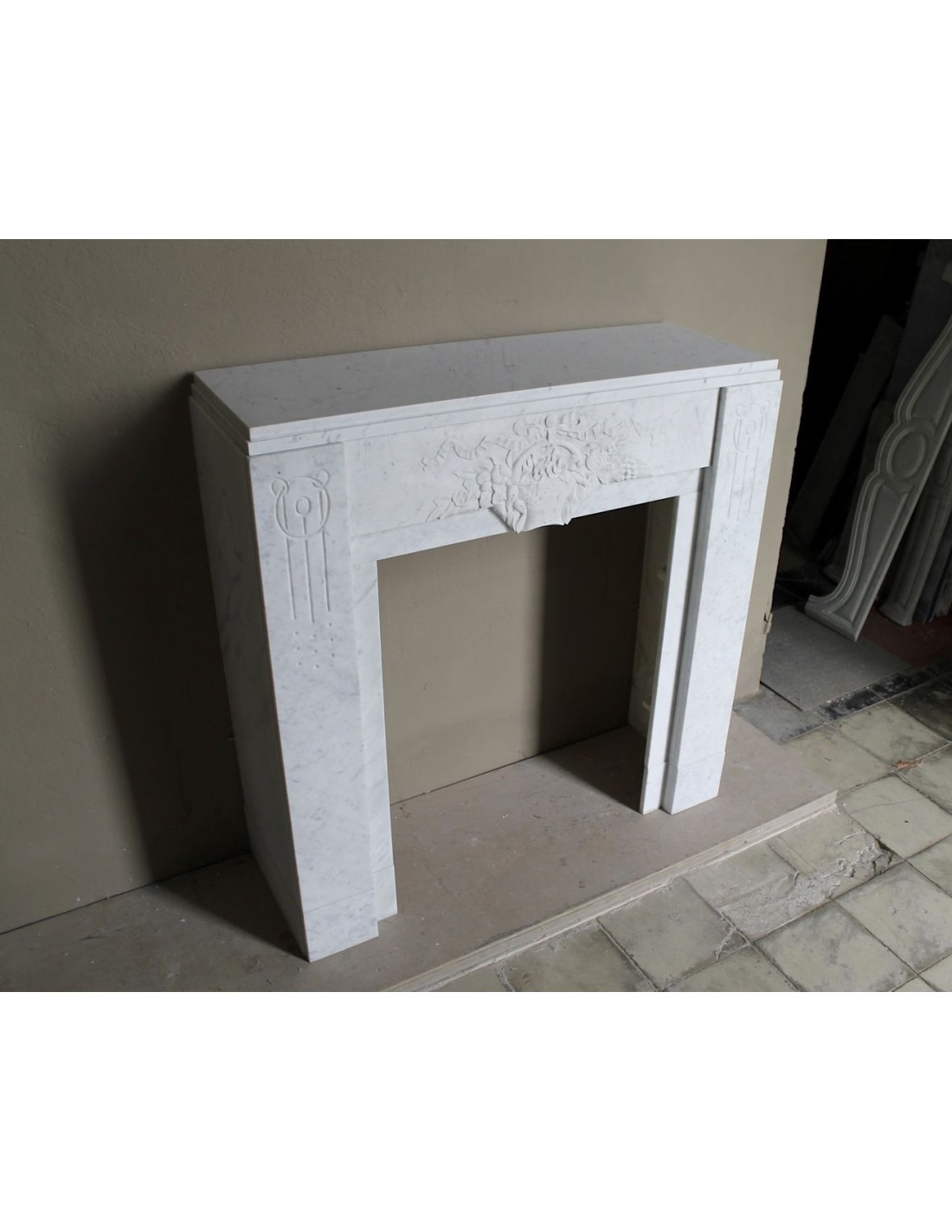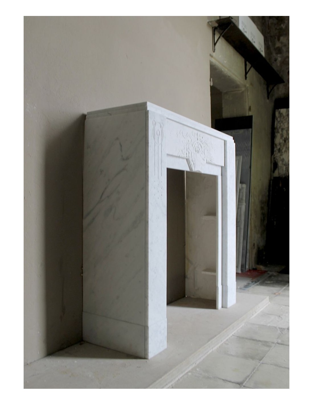 709 ART DECO “PANIER FLEURI” FIREPLACE MANTEL CARVED IN WHITE CARRARA MARBLE, WITH ICONIC ARCHITECTURAL DESIGN