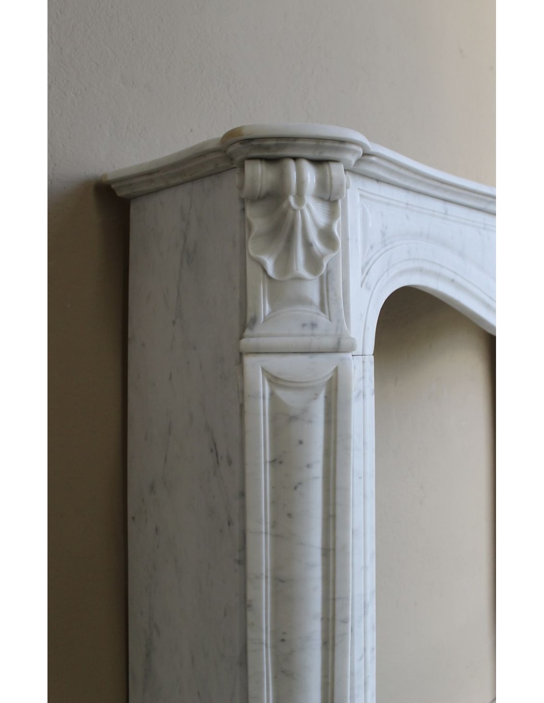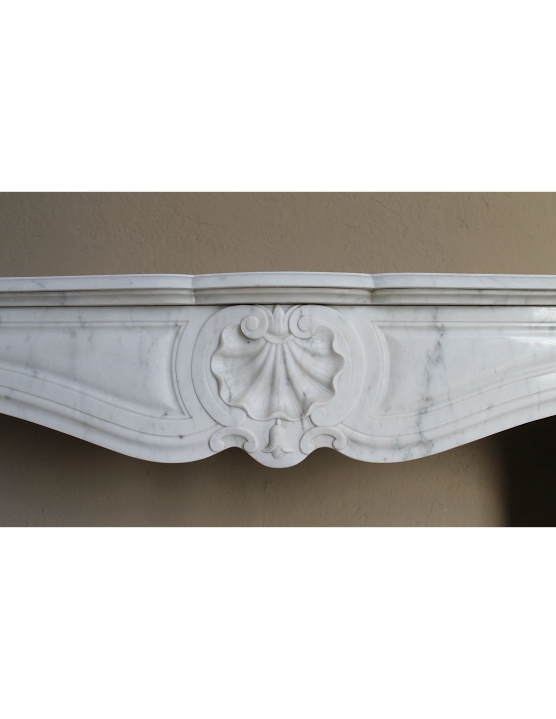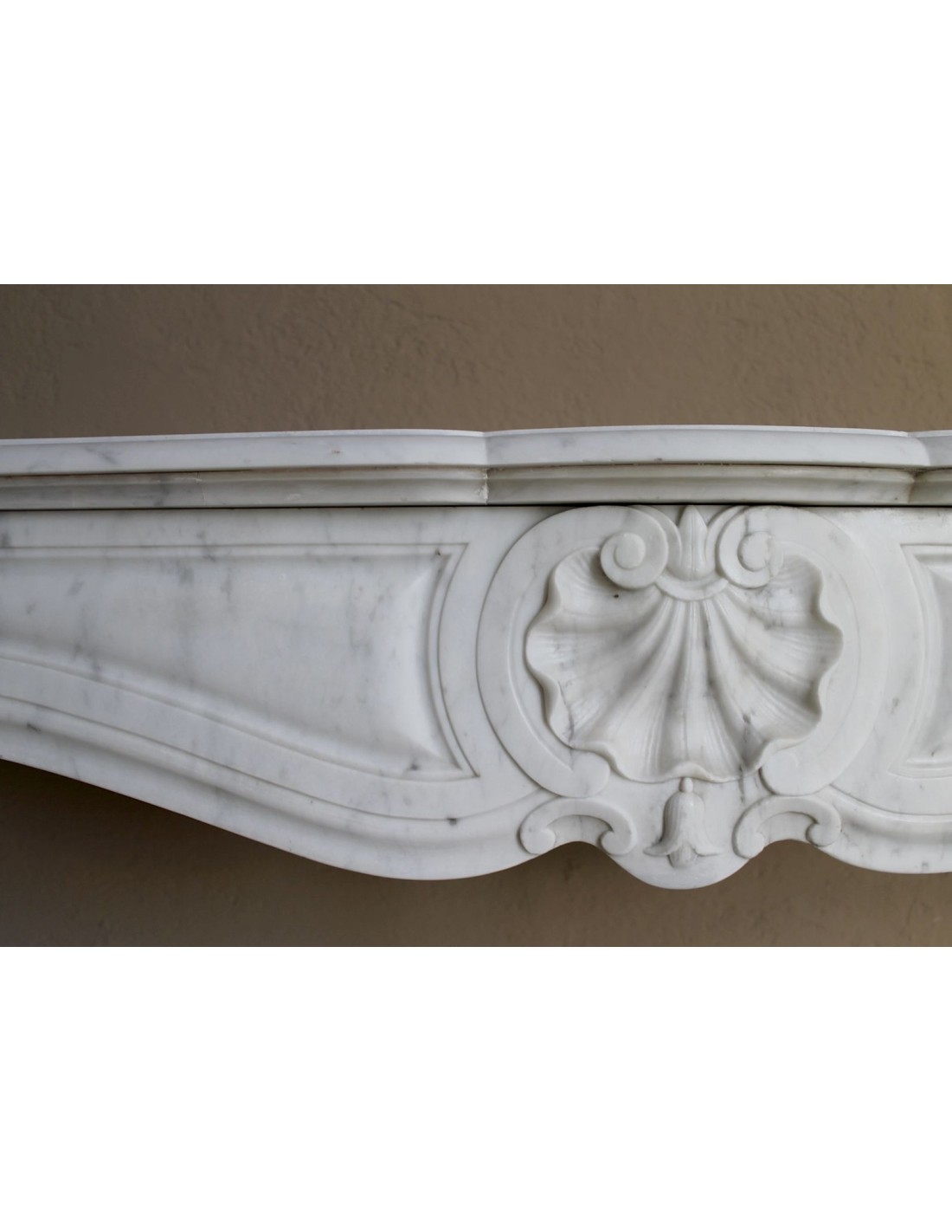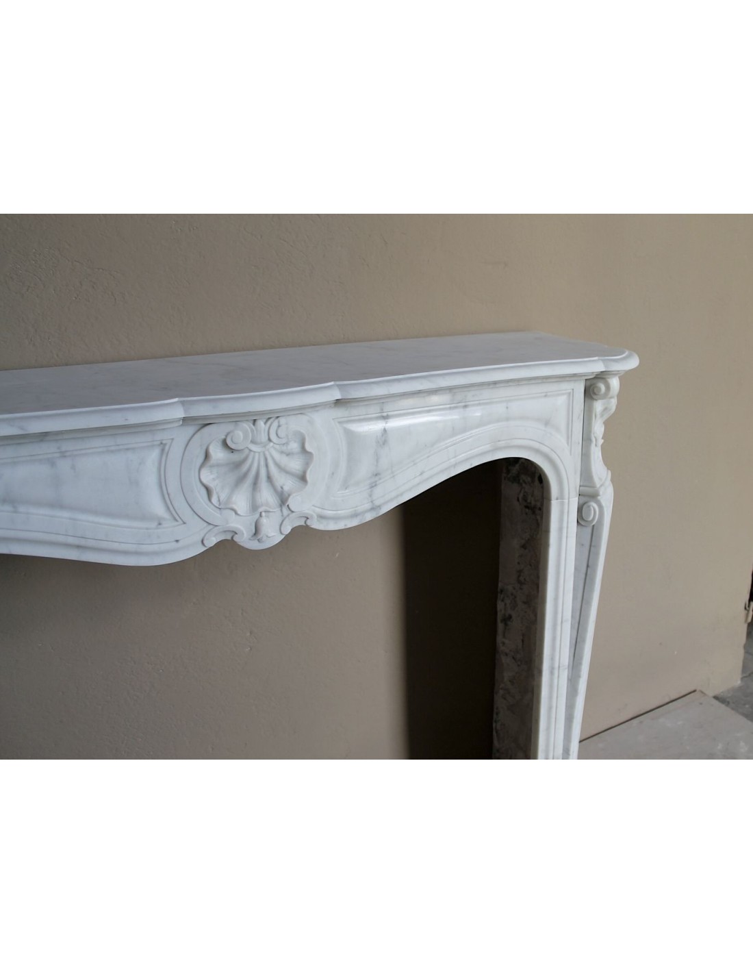 Louis XV “Trois Coquilles” fireplace mantel in white Carrara marble, Baroque style and 19th century, at a discounted price.