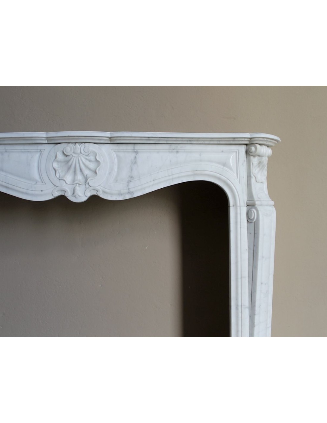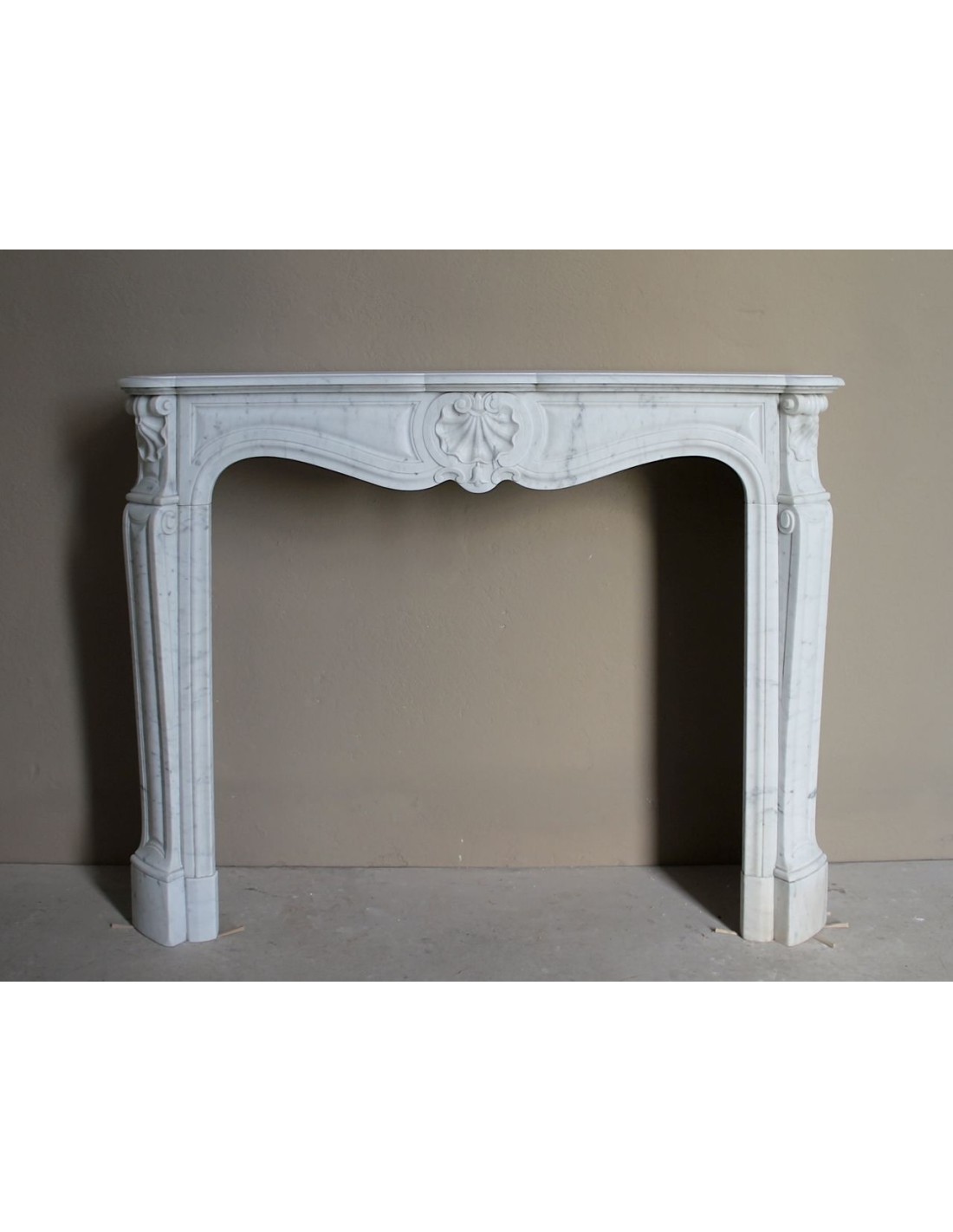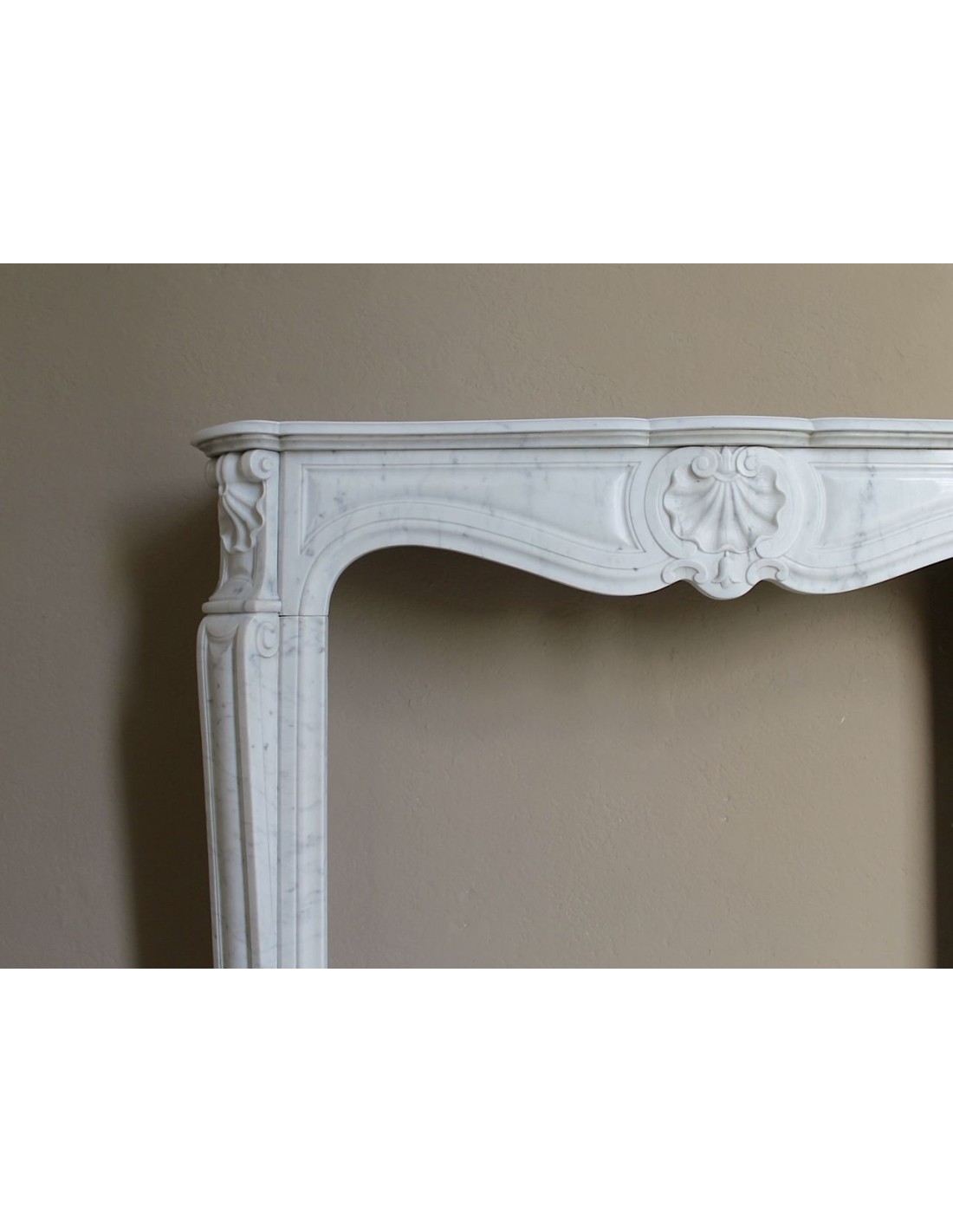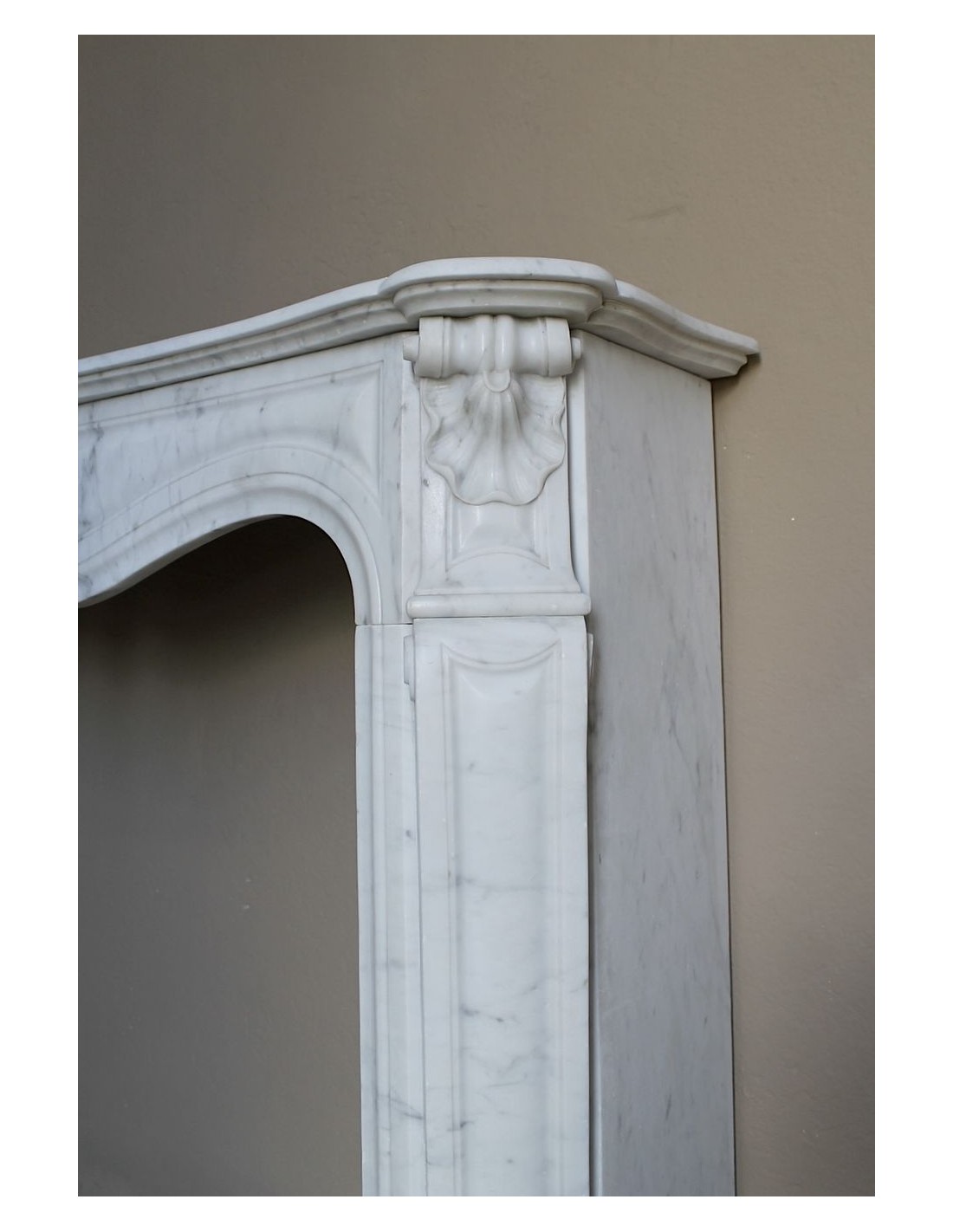 Louis XV “Trois Coquilles” fireplace mantel in white Carrara marble, Baroque style and 19th century, at a discounted price.