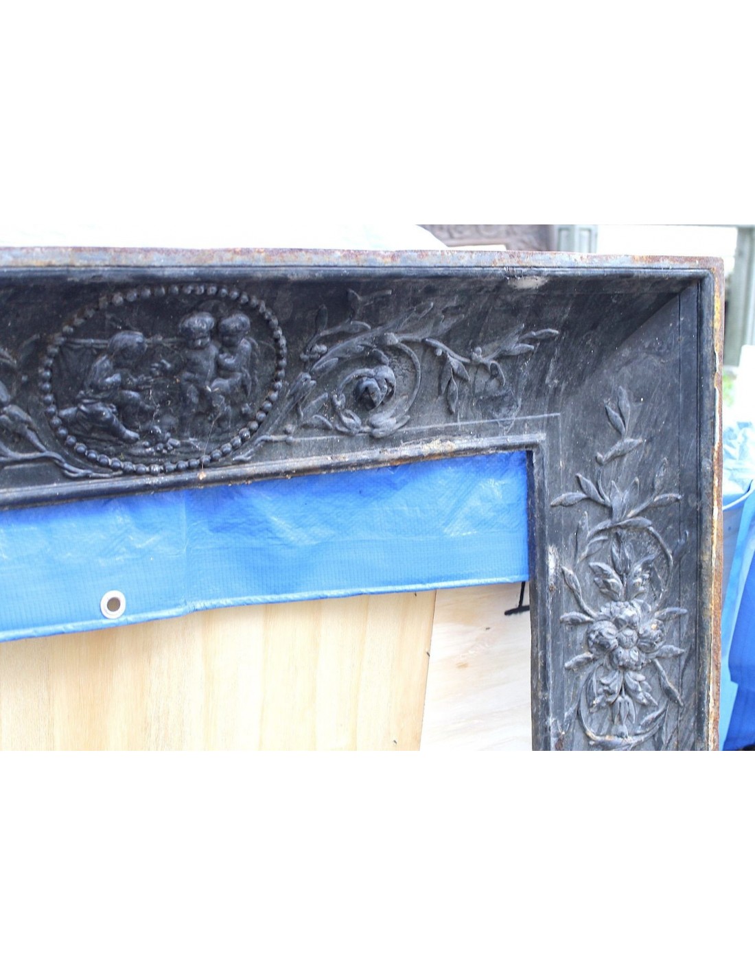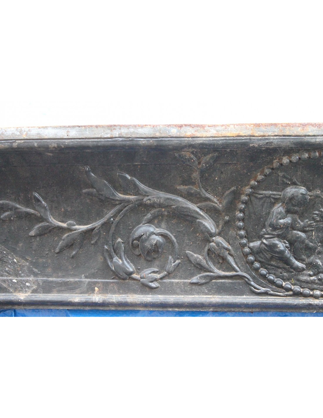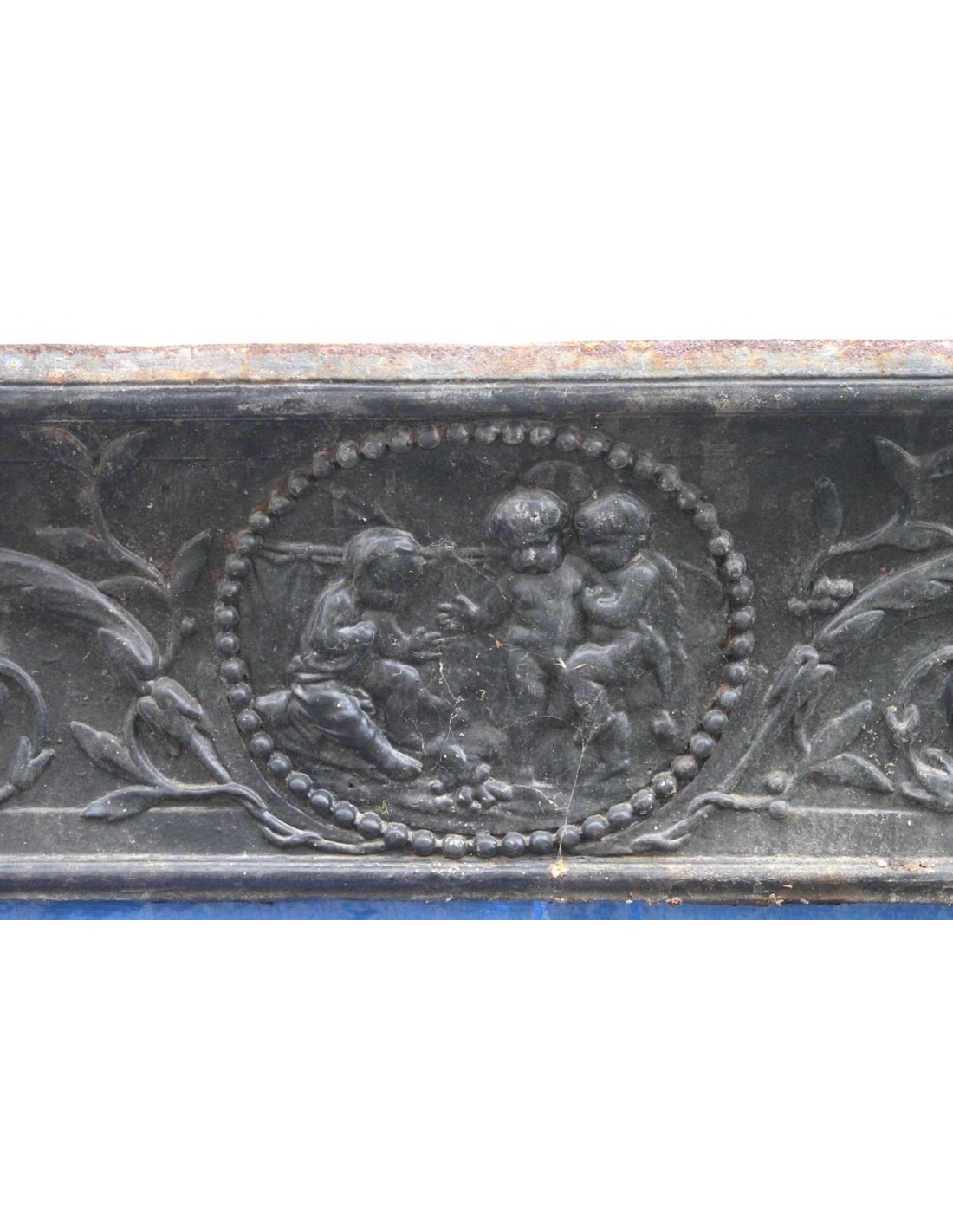In particolare, l'esemplare che vi stiamo presentando reca al centro del frontale un trittico di putti intorno ad un fuoco, lo stesso "stampo" che anima uno dei caminetti più famosi della fonderia Larcher, il ricercatissimo "Cheminée Bebè".