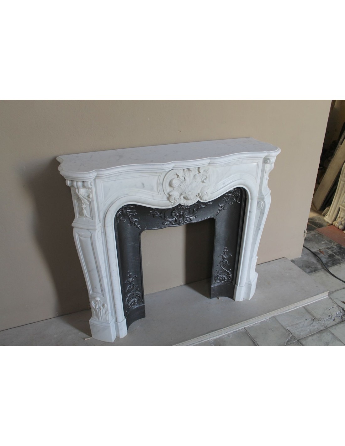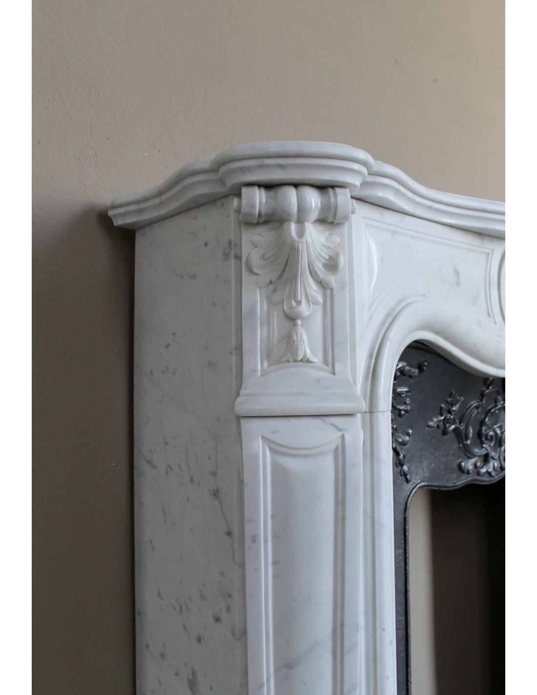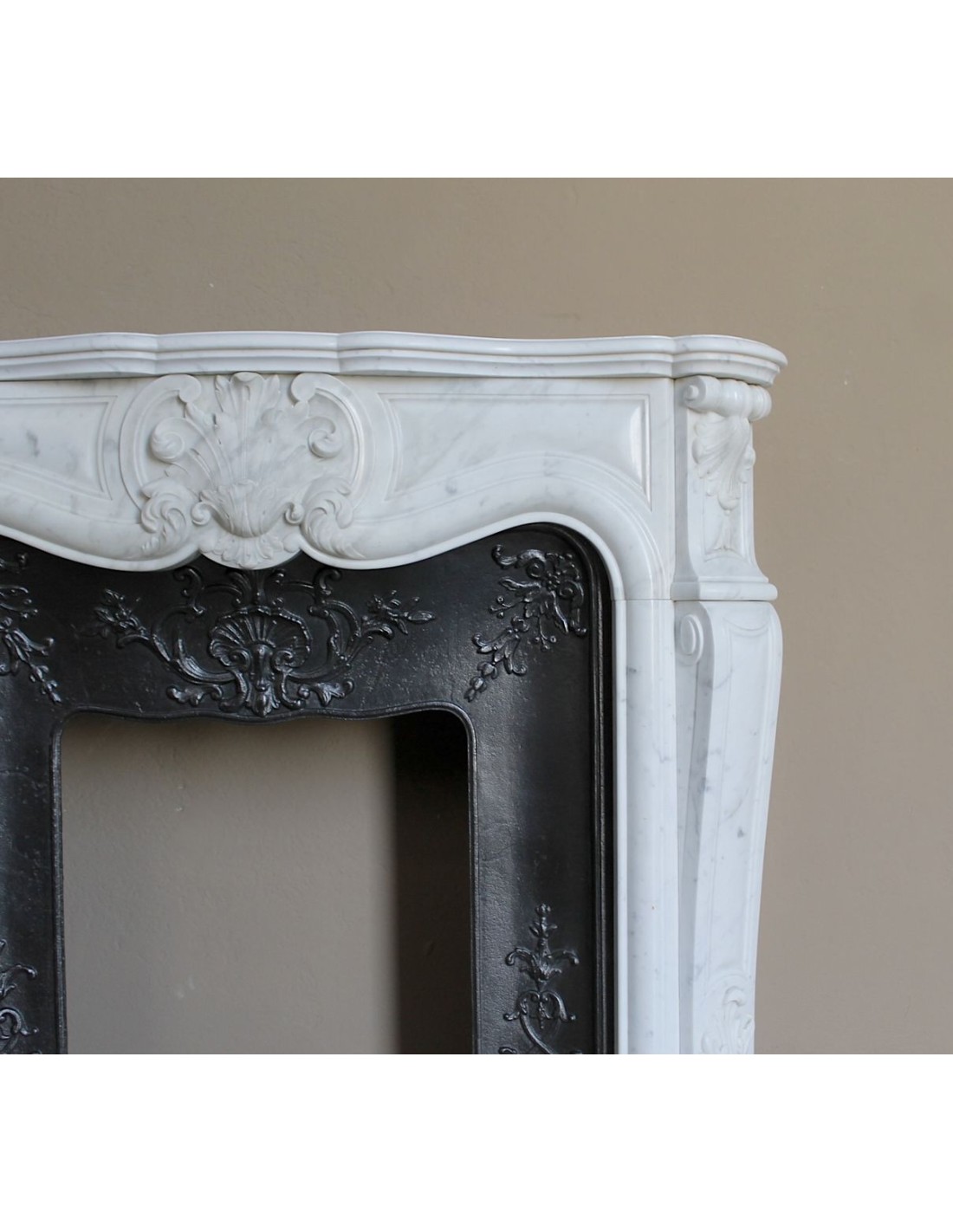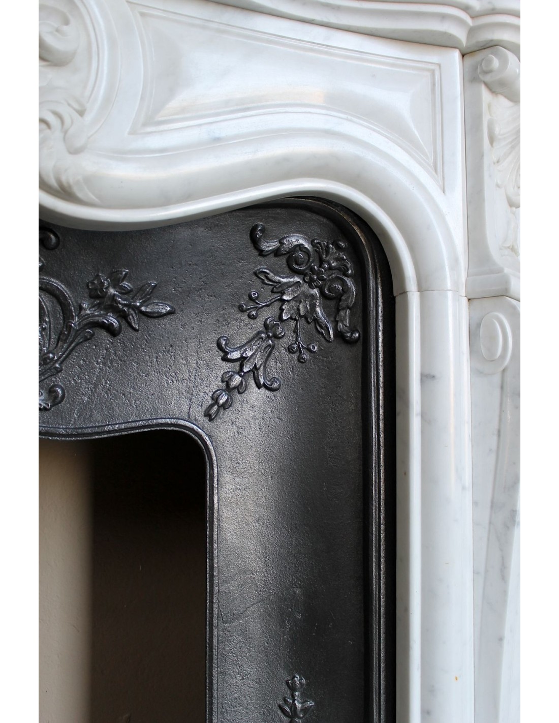 The sculptor, with great finesse, chose a motif of foliage in the marble (you’ll find it at the center of the mantel face, atop the legs, and on the scrolls at the base), while the cast iron insert is decorated in a fully marine theme — with beautiful “Saint Jacques” seashells sculpted at the center and down the legs.