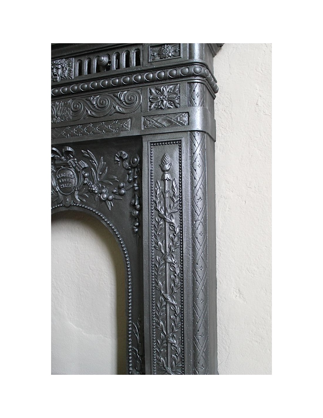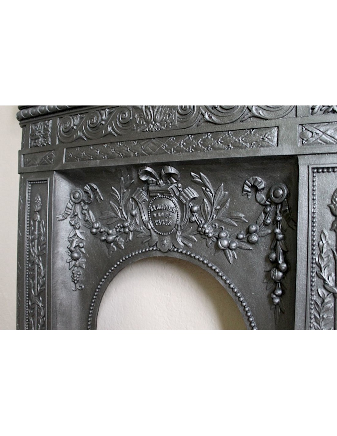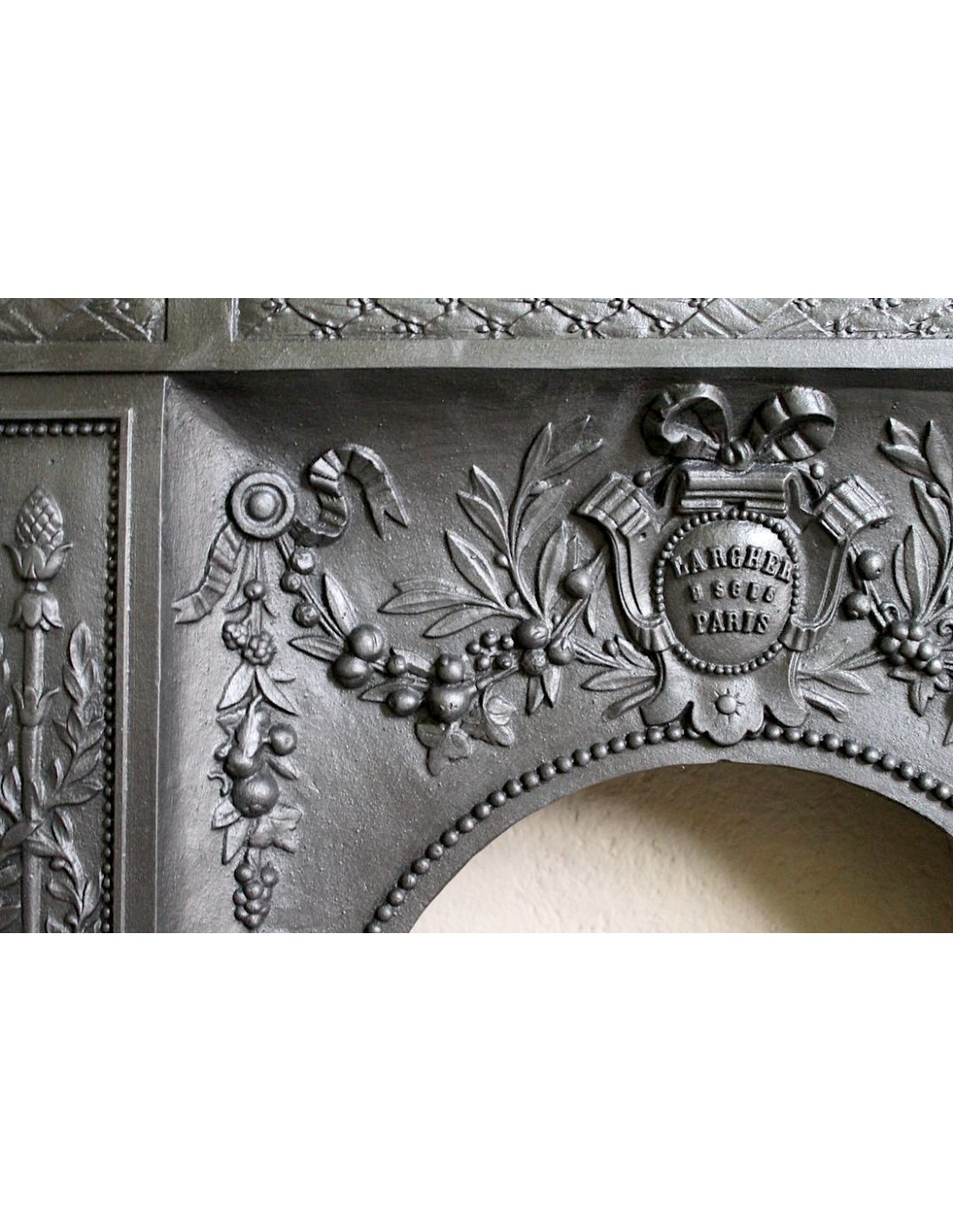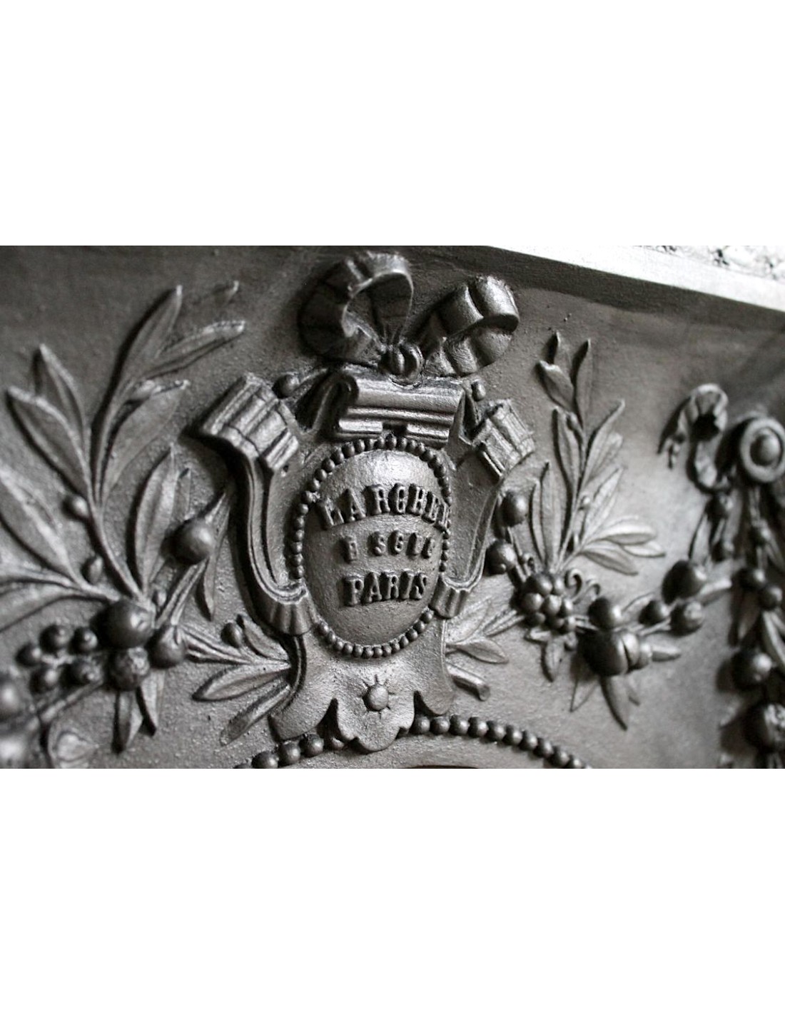 AT THE TOP OF THE HEARTH/OPENING WE HAVE THE CLASSIC COAT OF ARMS OF THE LARCHER FAMILY WHICH BEARS, BETWEEN THE WORDS LARCHER AND PARIS (UNFAILING AS THIS PAIR OF WORDS WAS THEIR SIGNATURE) THE "CODE NUMBER" OF THIS SPECIFIC FIREPLACE.