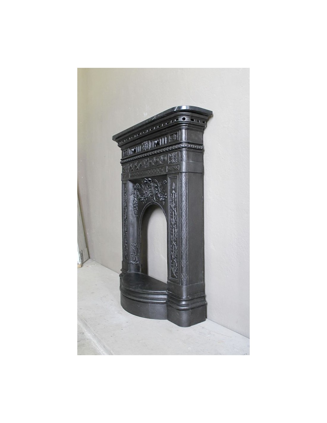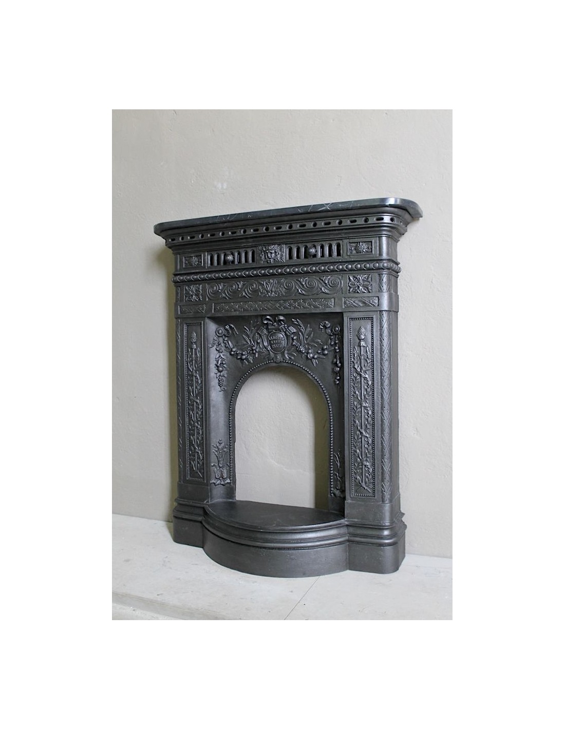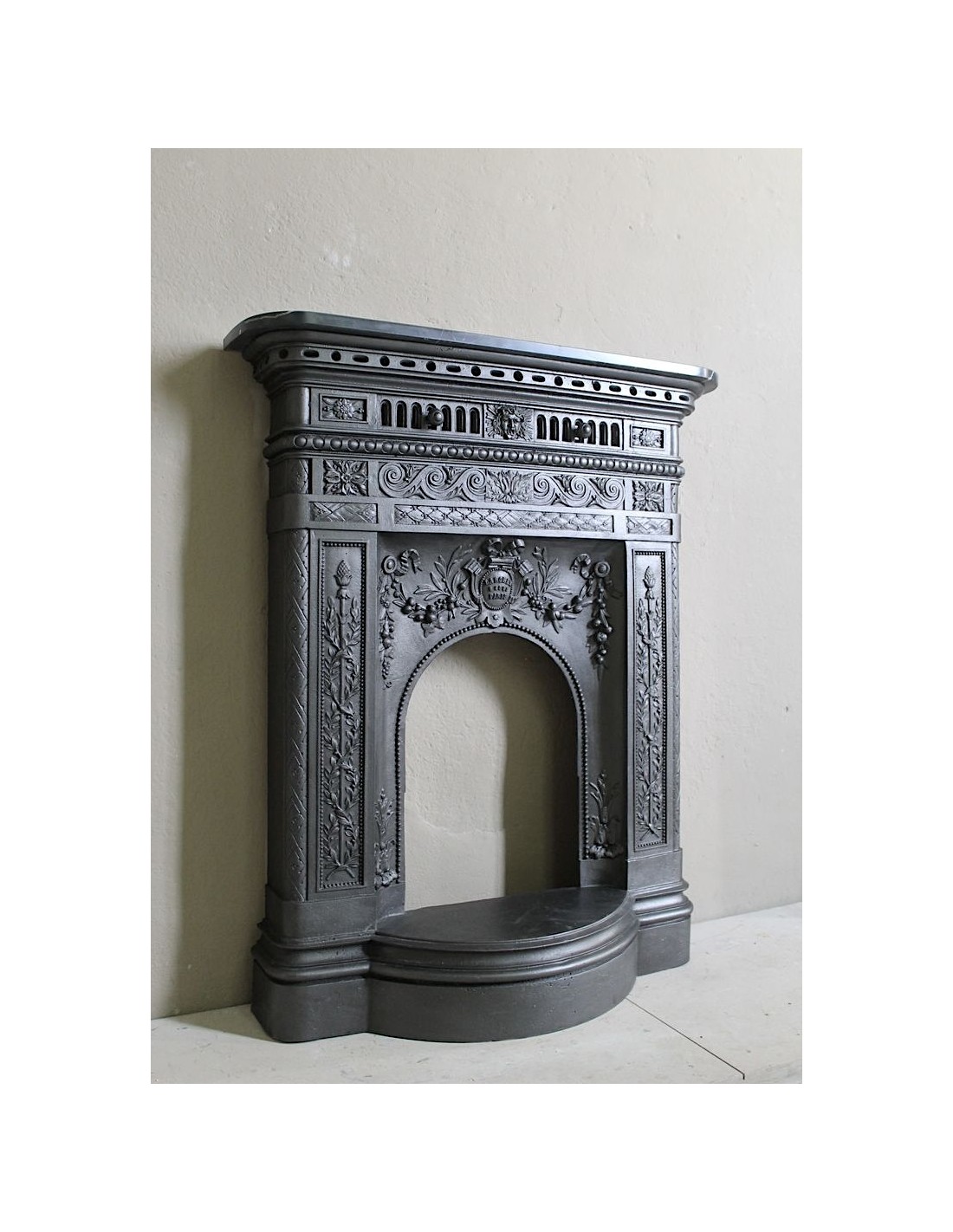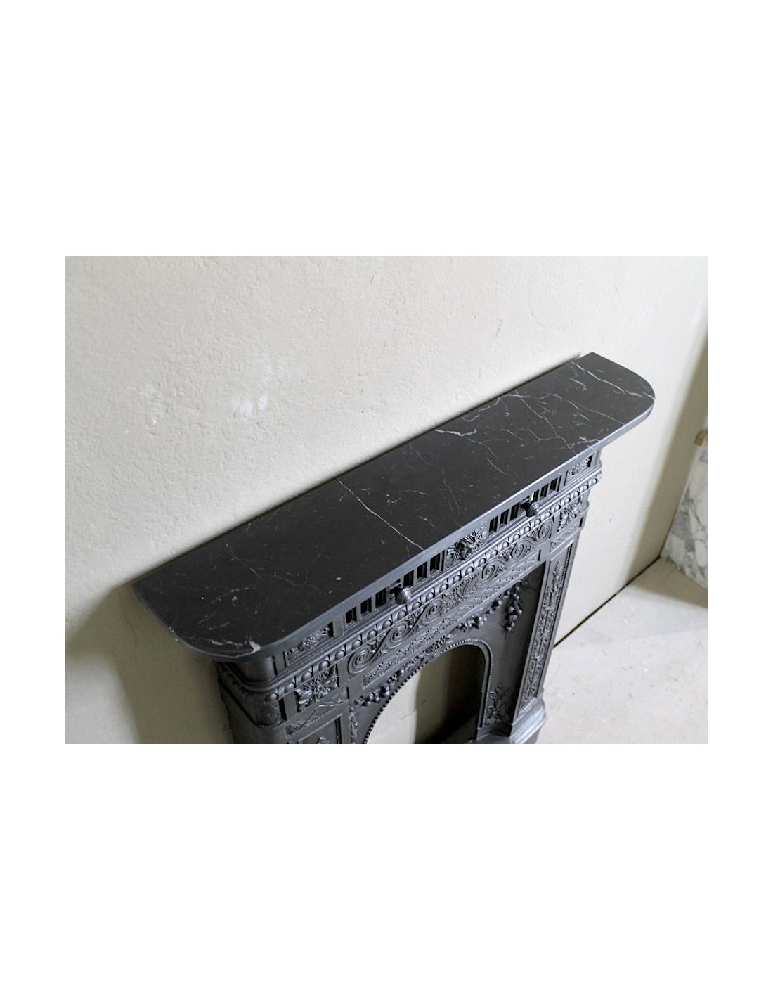 In order to be more likely to be liked by customers, considering that the hearth top was considered by its owners to be no more and no less than a console table on which to place paintings, mirrors, clocks, daguerreotypes and various trinkets, the makers of these very modern and hitherto unknown cast-iron fireplaces frames proposed products that had a marble top, a more familiar supporting surface than a cold and unknown cast-iron top. Then, as often happens, customers became accustomed to these modern and graceful fireplaces and accepted that the top could also be made of cast iron.