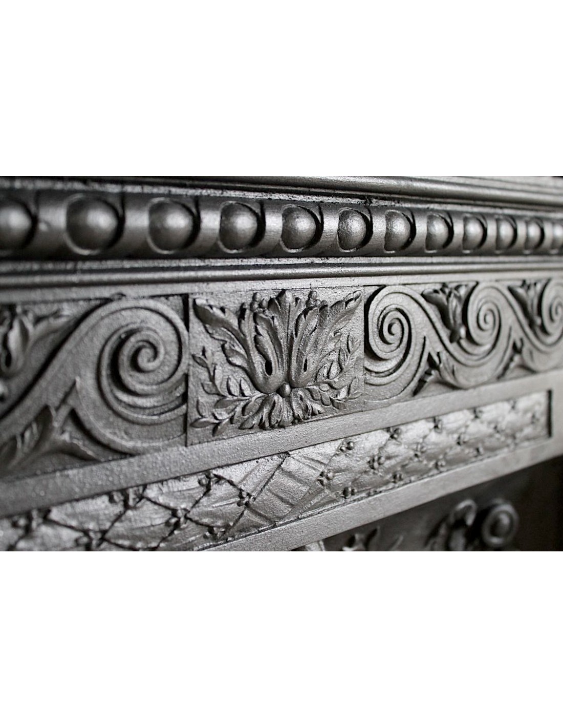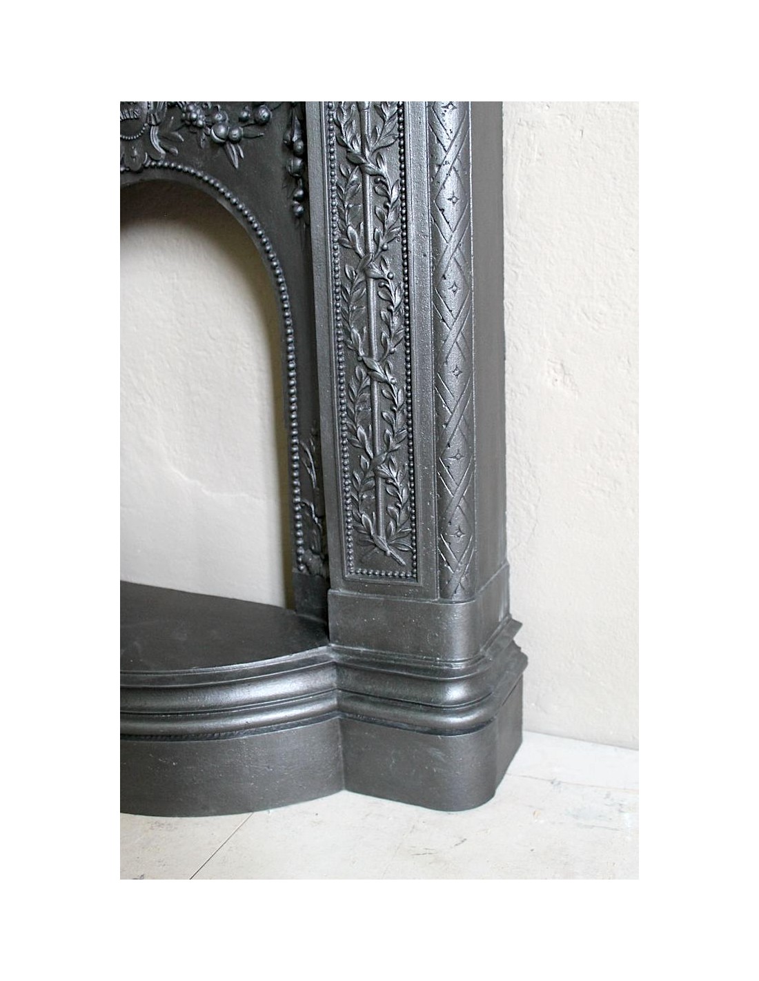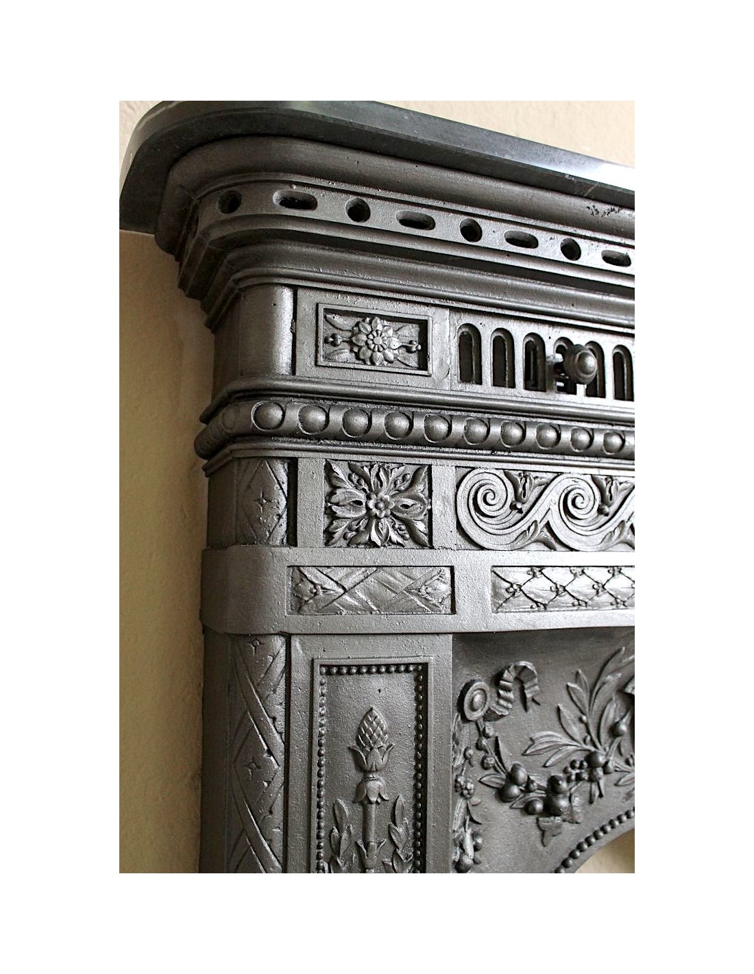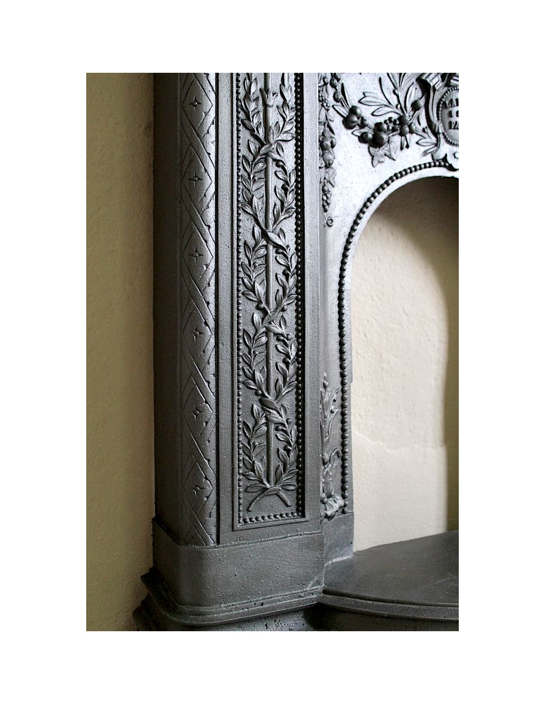 In order to be more likely to be liked by customers, considering that the hearth top was considered by its owners to be no more and no less than a console table on which to place paintings, mirrors, clocks, daguerreotypes and various trinkets, the makers of these very modern and hitherto unknown cast-iron fireplaces frames proposed products that had a marble top, a more familiar supporting surface than a cold and unknown cast-iron top. Then, as often happens, customers became accustomed to these modern and graceful fireplaces and accepted that the top could also be made of cast iron.