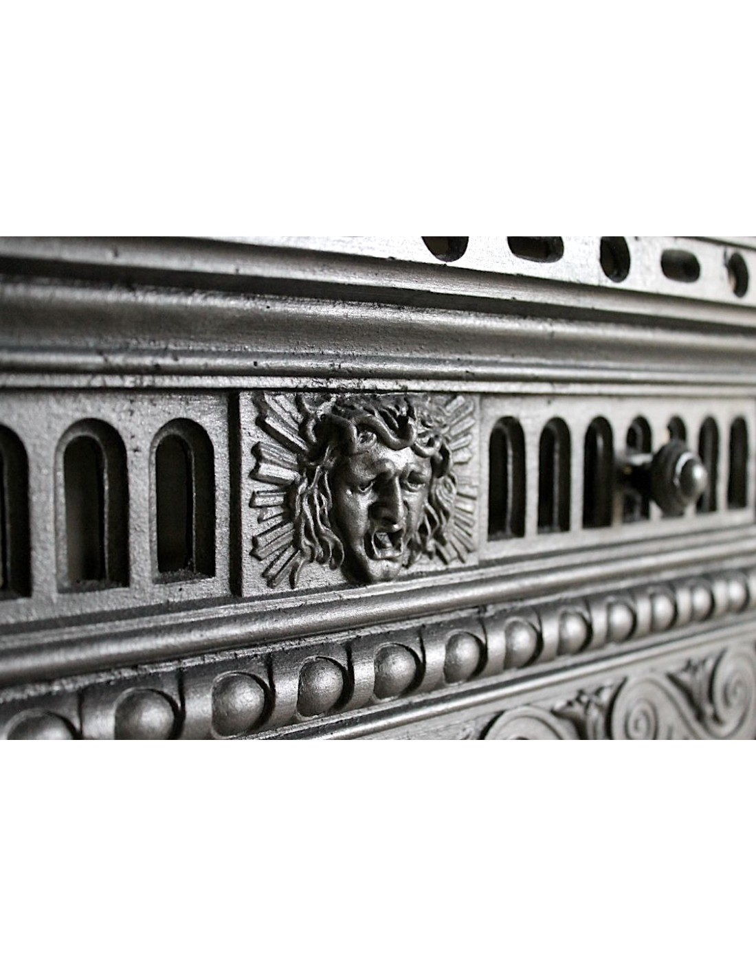A) IN THE FIRST HORIZONTAL BAND OF DECORATIONS, INTERSPERSED WITH AN AIR GRID ADJUSTABLE BY TWO KNOBS, WE HAVE THE CLASSIC “PARIS ROSETTES” AT THE SIDES AND, A VERY RARE DECORATION TO BE FOUND, THE SO-CALLED “LIGHT OF LIFE,” IN THIS CASE PLACED BEHIND THE FACE OF CHRIST AND REPRESENTED BY RAYS WITH THORN-LIKE FEATURES.