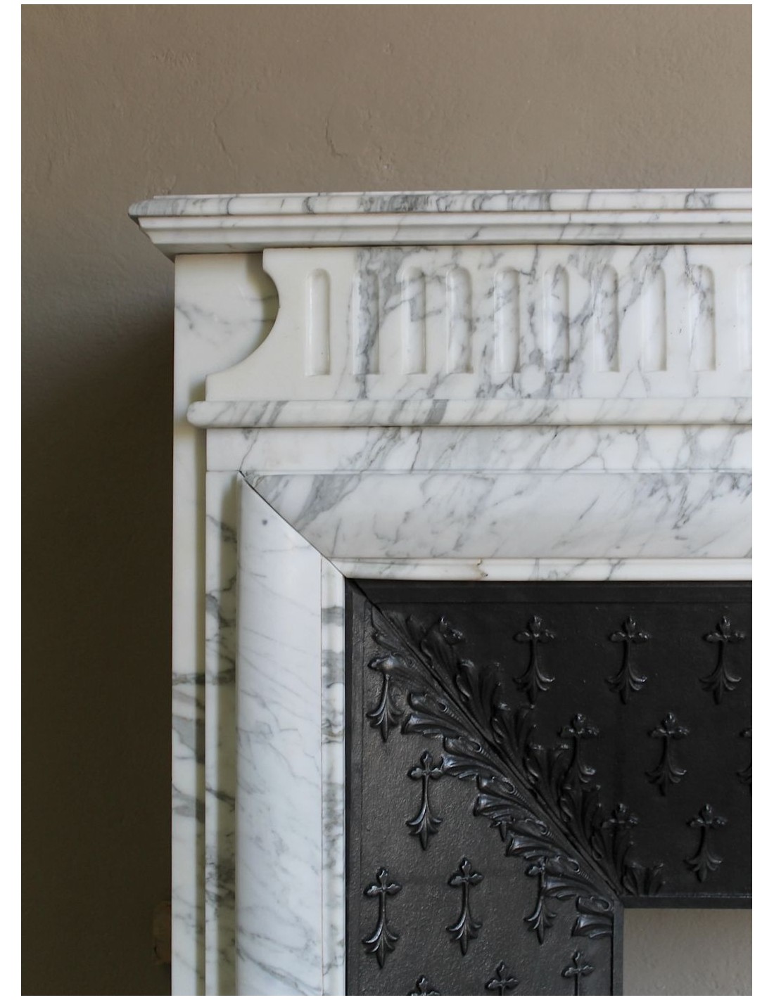 Well, this gentleman was rather “autarkic” and it was not easy to get him to carve a fireplace in non-native marbles, however, this time he had to yield (and I am sure that never was a more pleasing rendering) to the warm chromaticism of our very Italian marble , a noble Calacatta Classico that had so fascinated the Etruscans and then again the Romans..