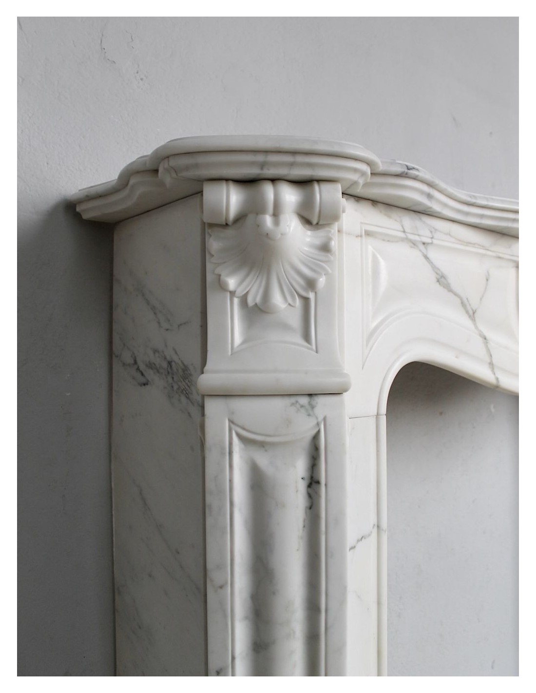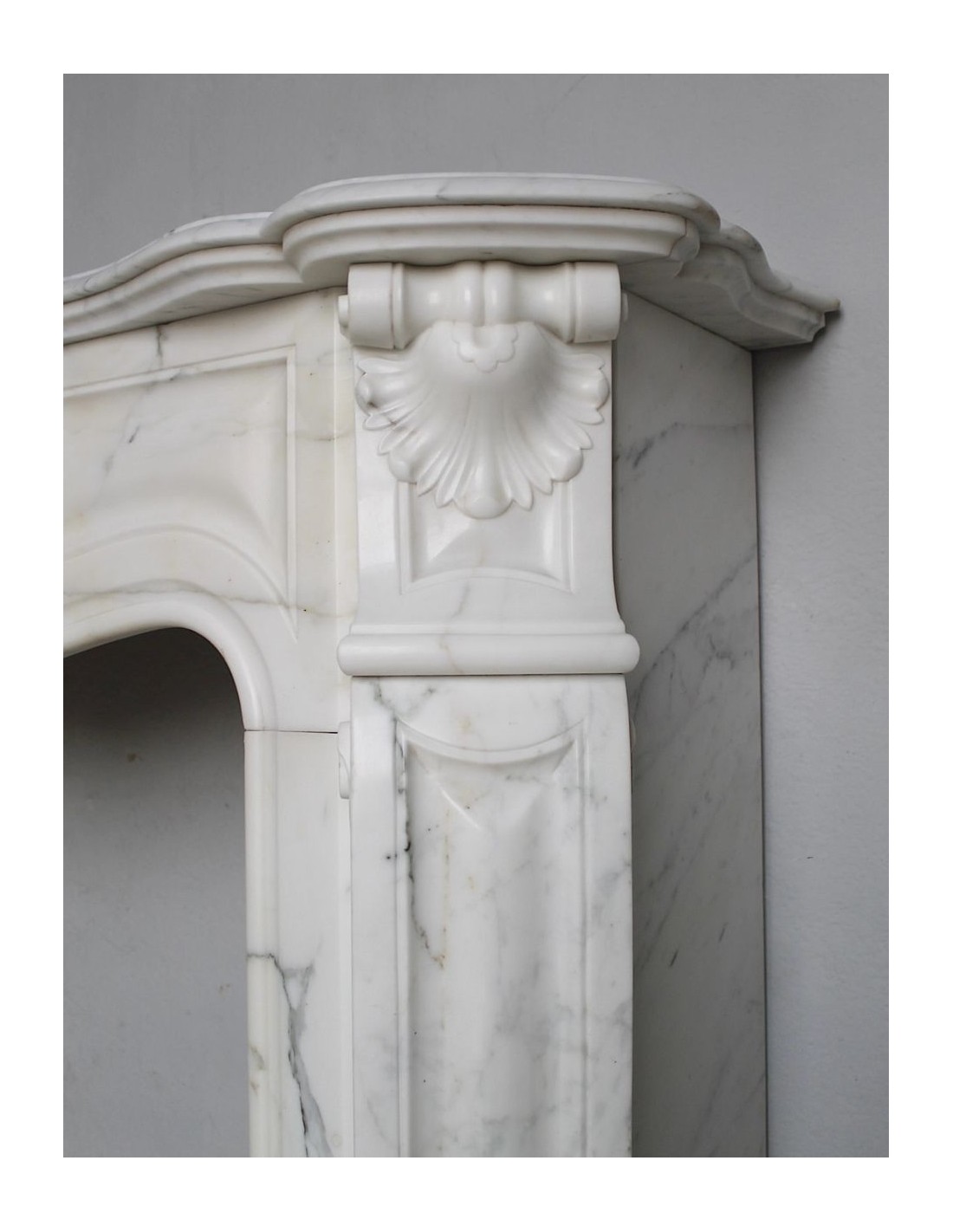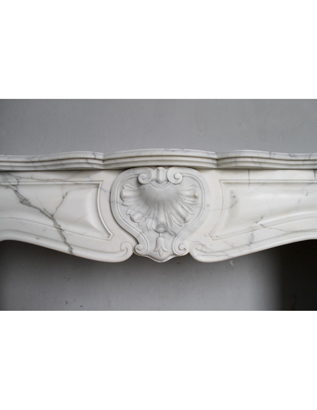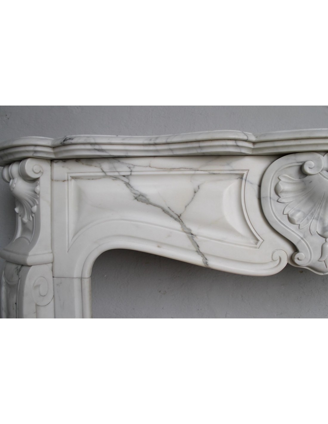 SPLENDID EXAMPLE OF A LUIGI XV TROIS COQUILLES AMÉLIORÉ FIREPLACE IN ONE OF THE MOST CLASSIC, NOBLE AND ELEGANT MARBLES, A VERY FINE ARABESQUE CARRARA FROM THE FAMOUS CALACATTA QUARRY, PROVENANCE PARIS, SCULPTURE-ERA NAPOLEON III.