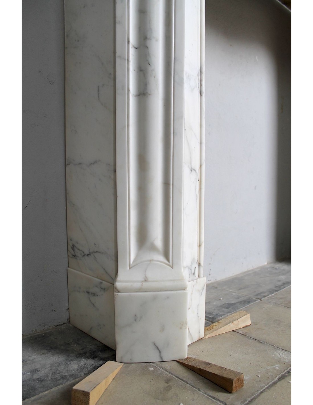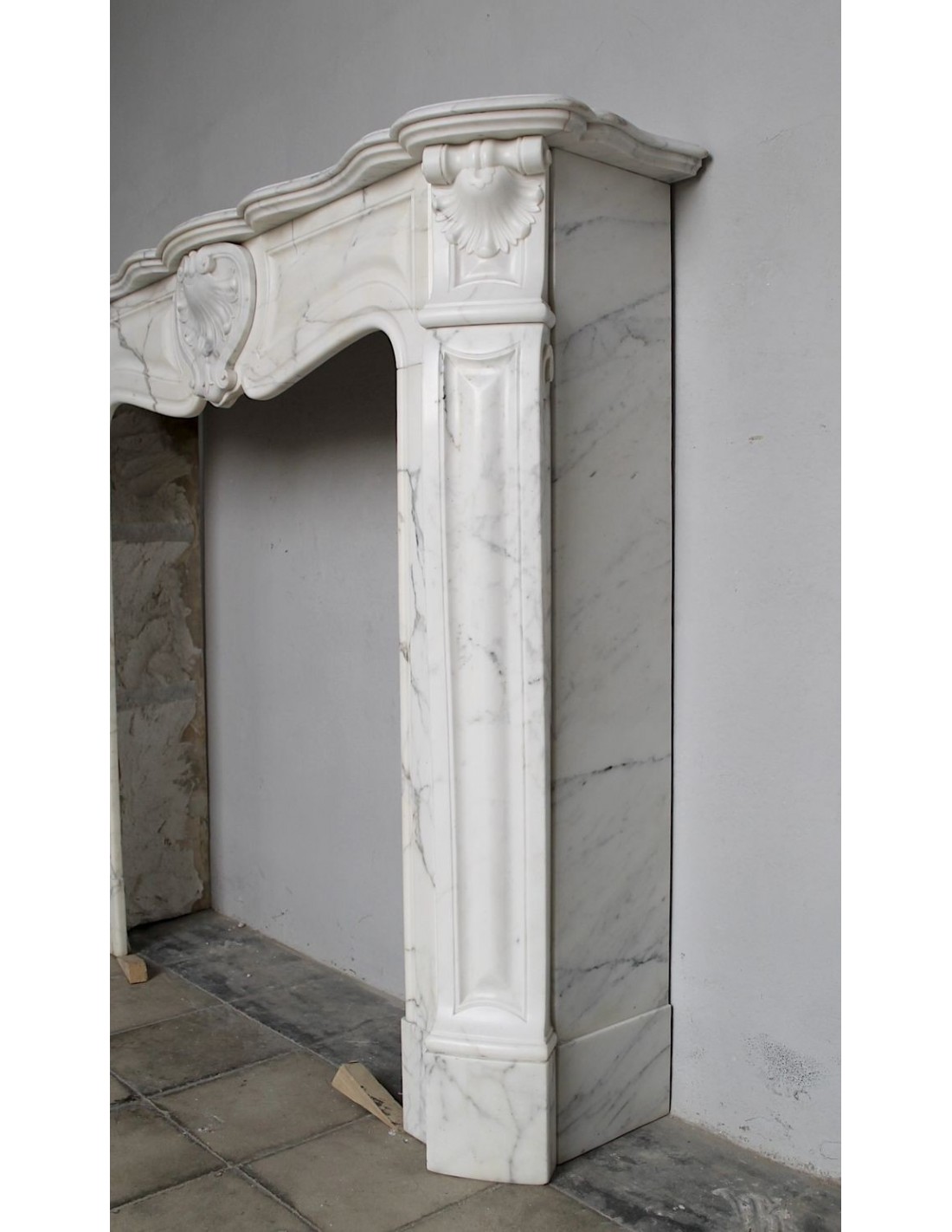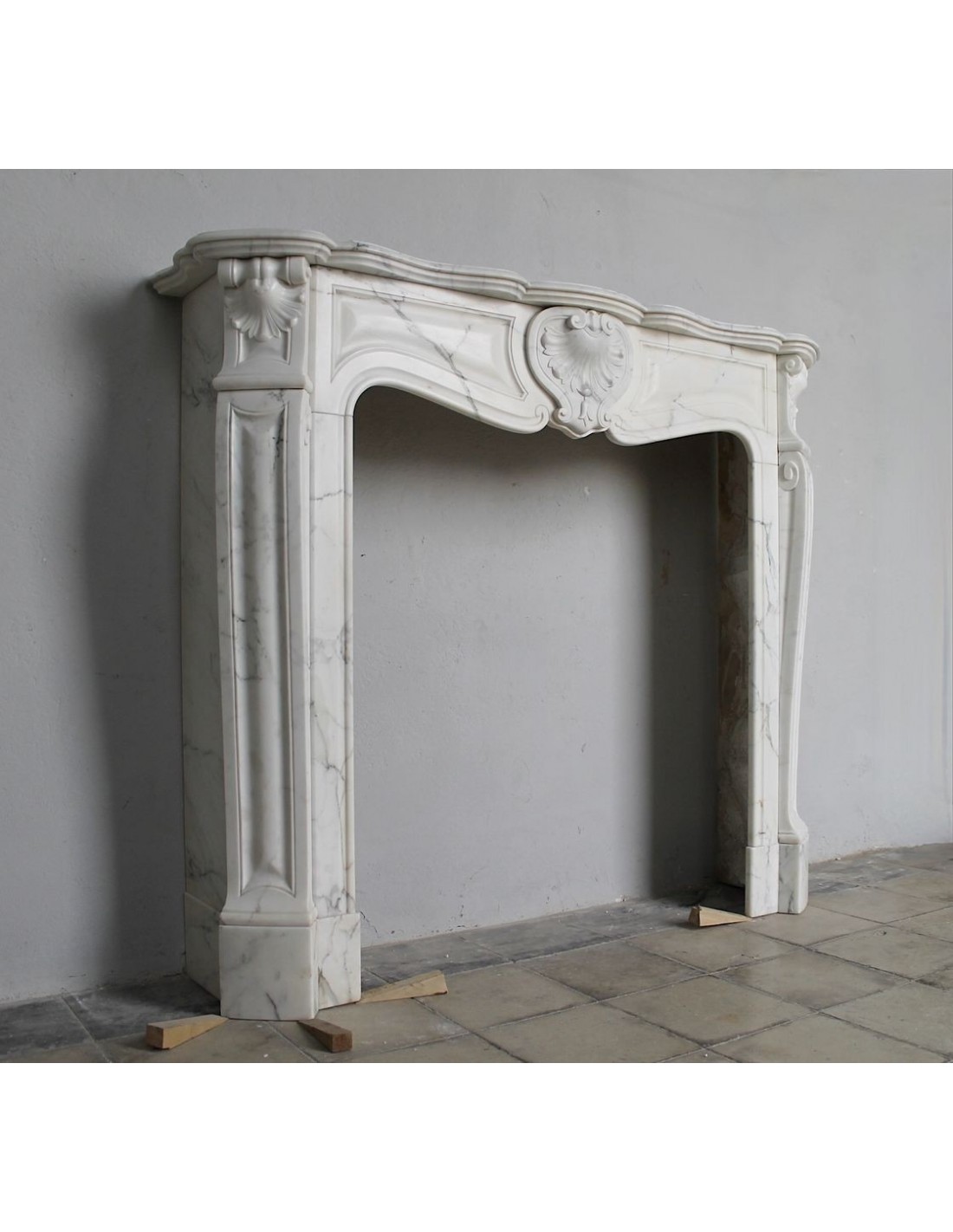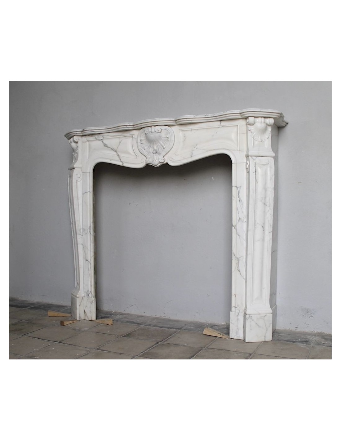 SPLENDID EXAMPLE OF A LUIGI XV TROIS COQUILLES AMÉLIORÉ FIREPLACE IN ONE OF THE MOST CLASSIC, NOBLE AND ELEGANT MARBLES, A VERY FINE ARABESQUE CARRARA FROM THE FAMOUS CALACATTA QUARRY, PROVENANCE PARIS, SCULPTURE-ERA NAPOLEON III.