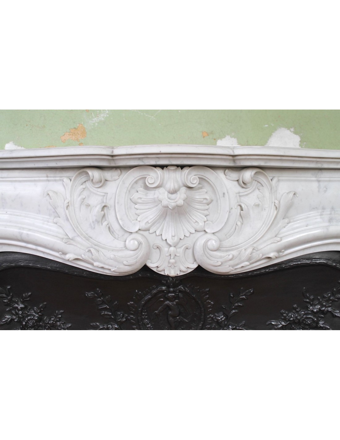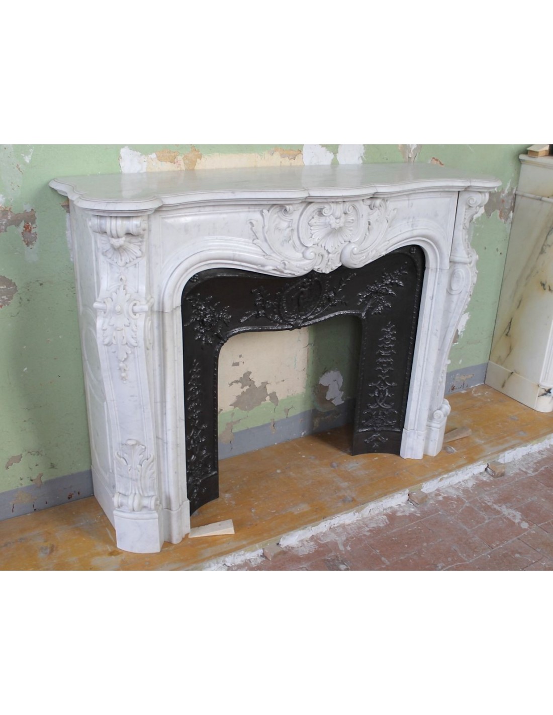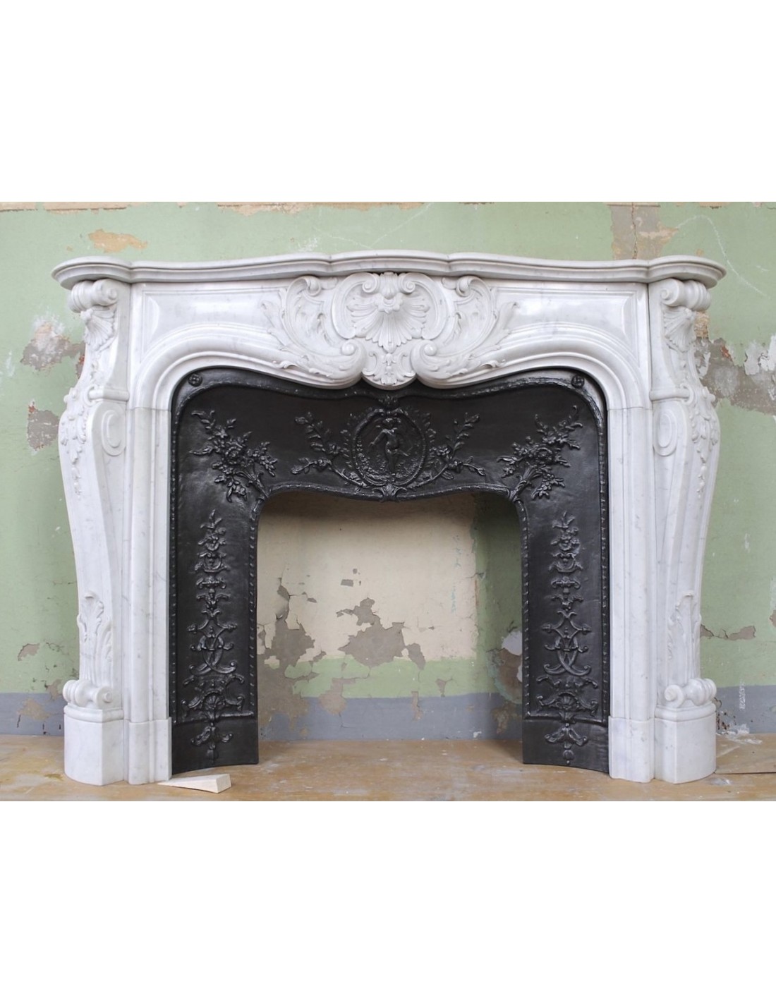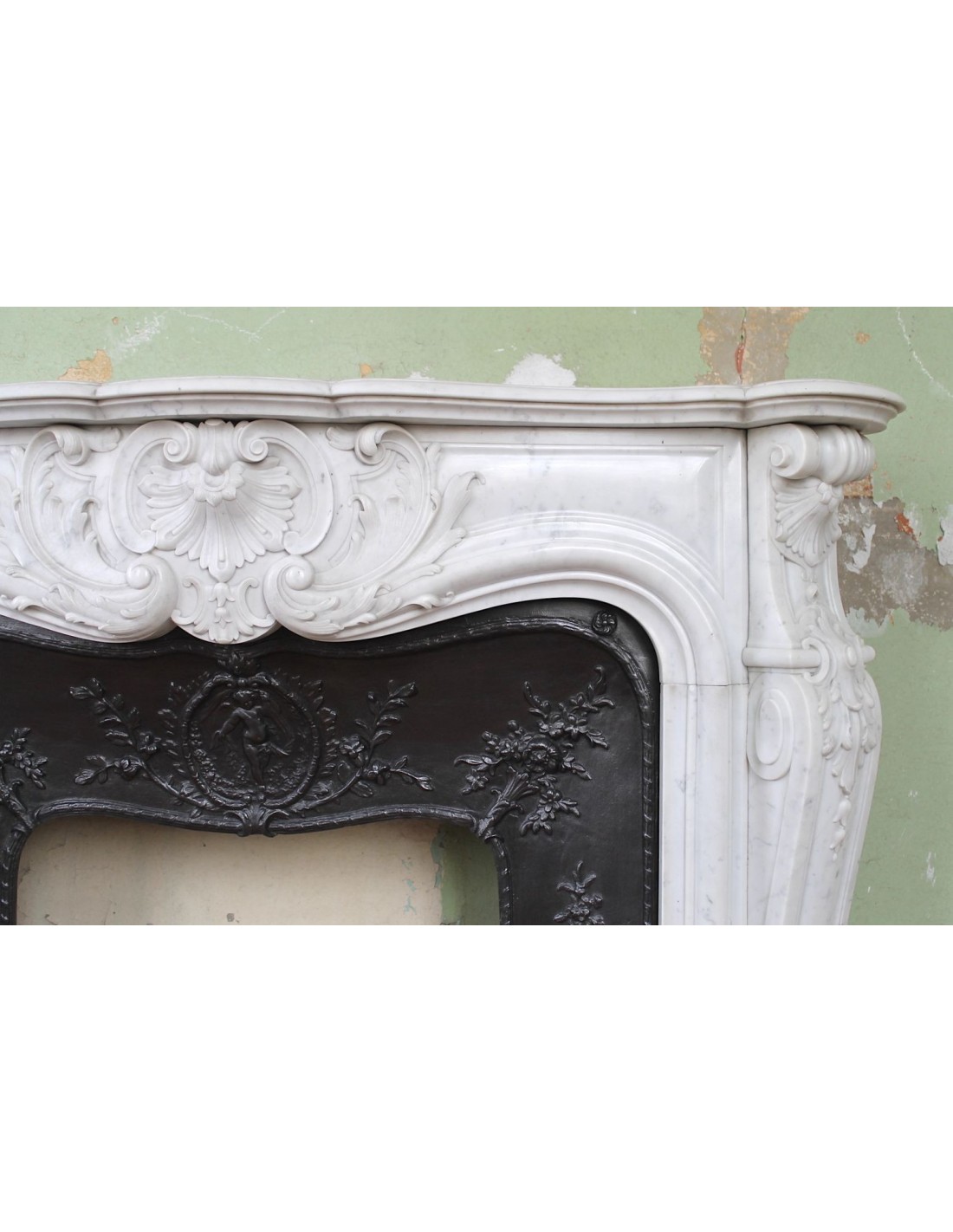 027 AG ANTIQUE LOUIS XV "ROSACES" FIREPLACE MANTEL CARVED IN WHITE CARRARA MARBLE WITH ITS OWN ORIGINAL FLORAL CAST IRON INSERT