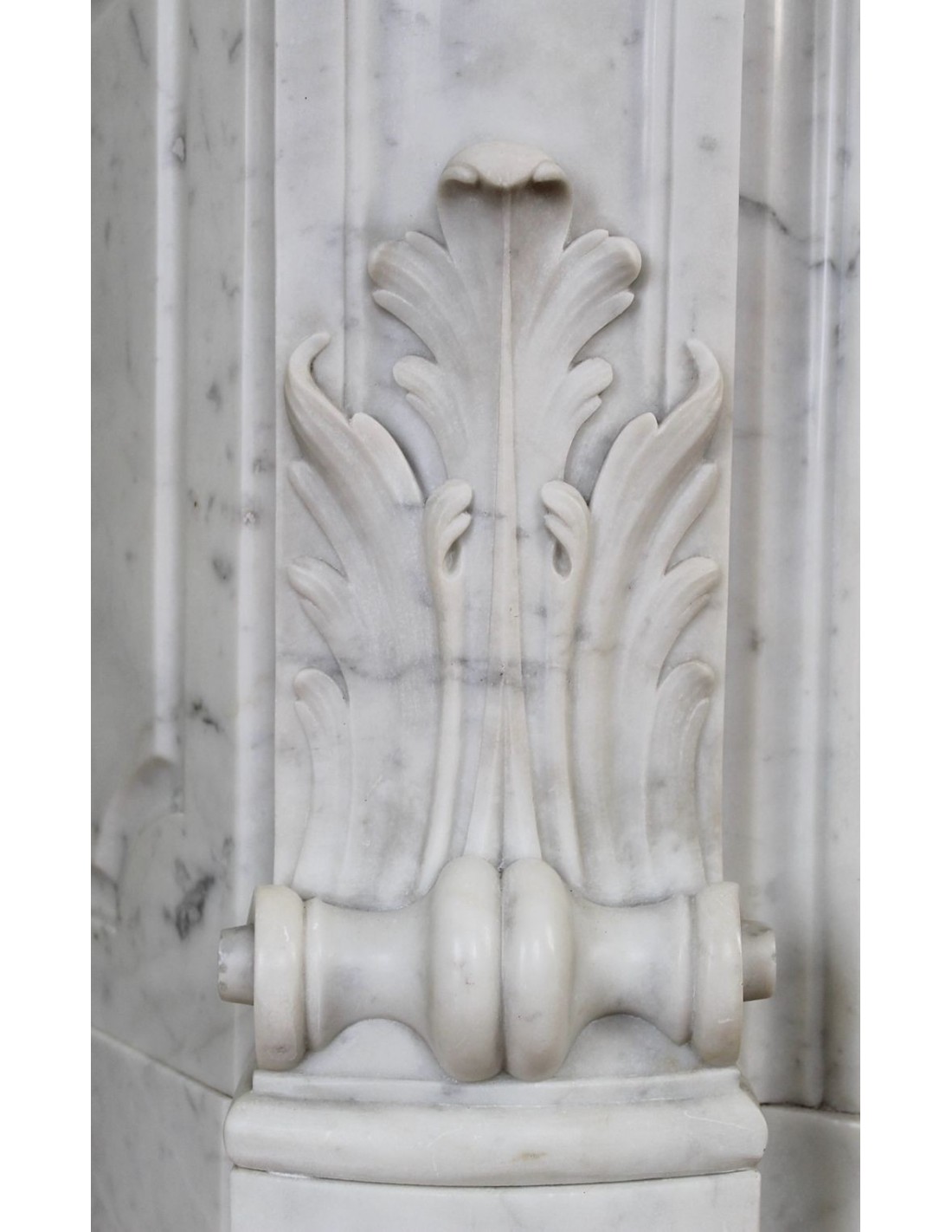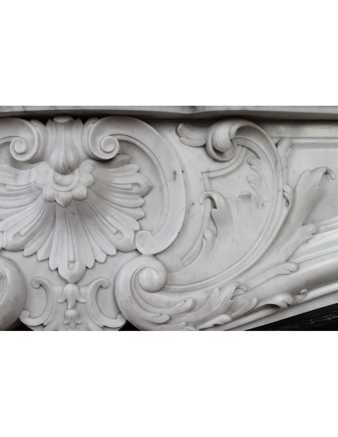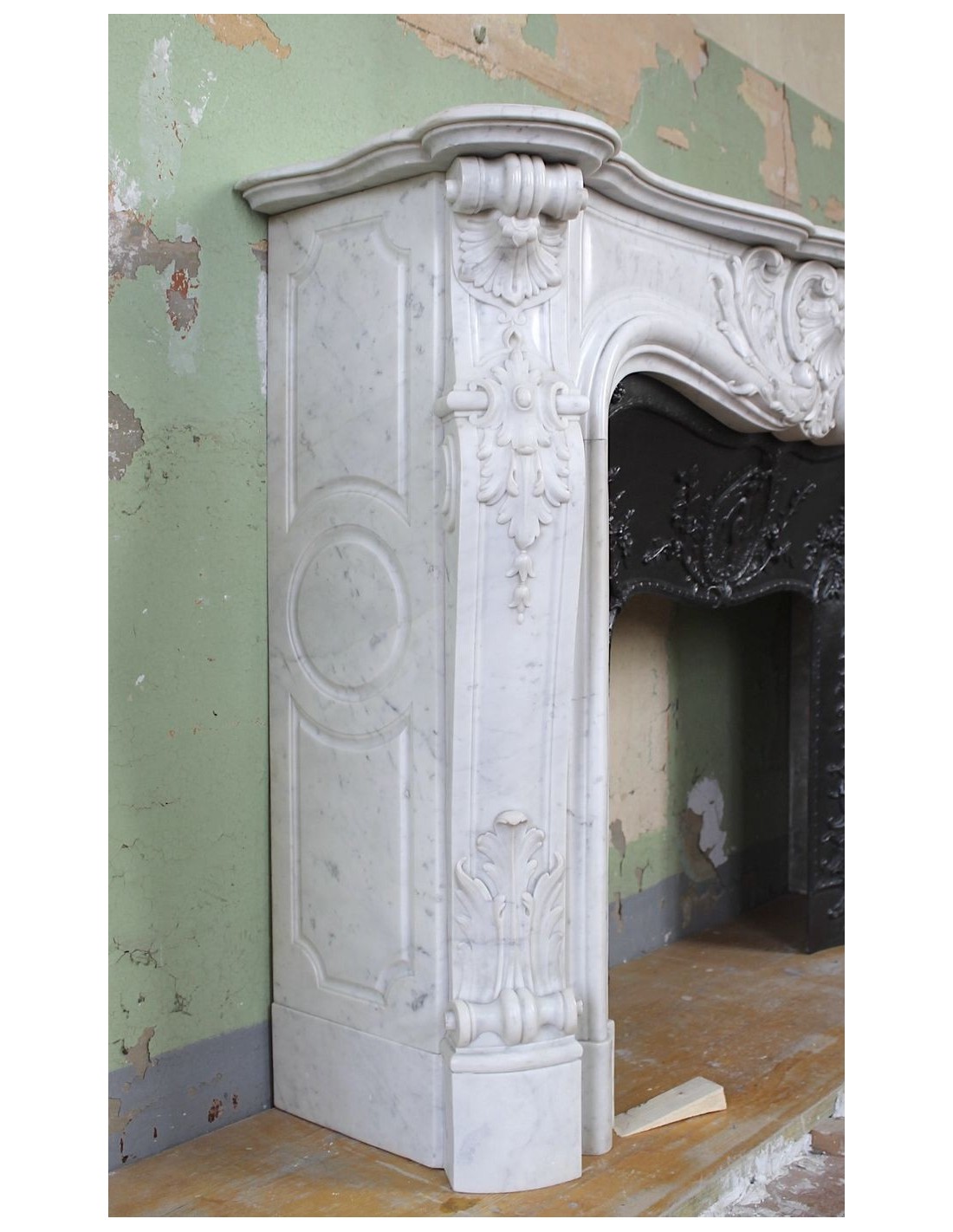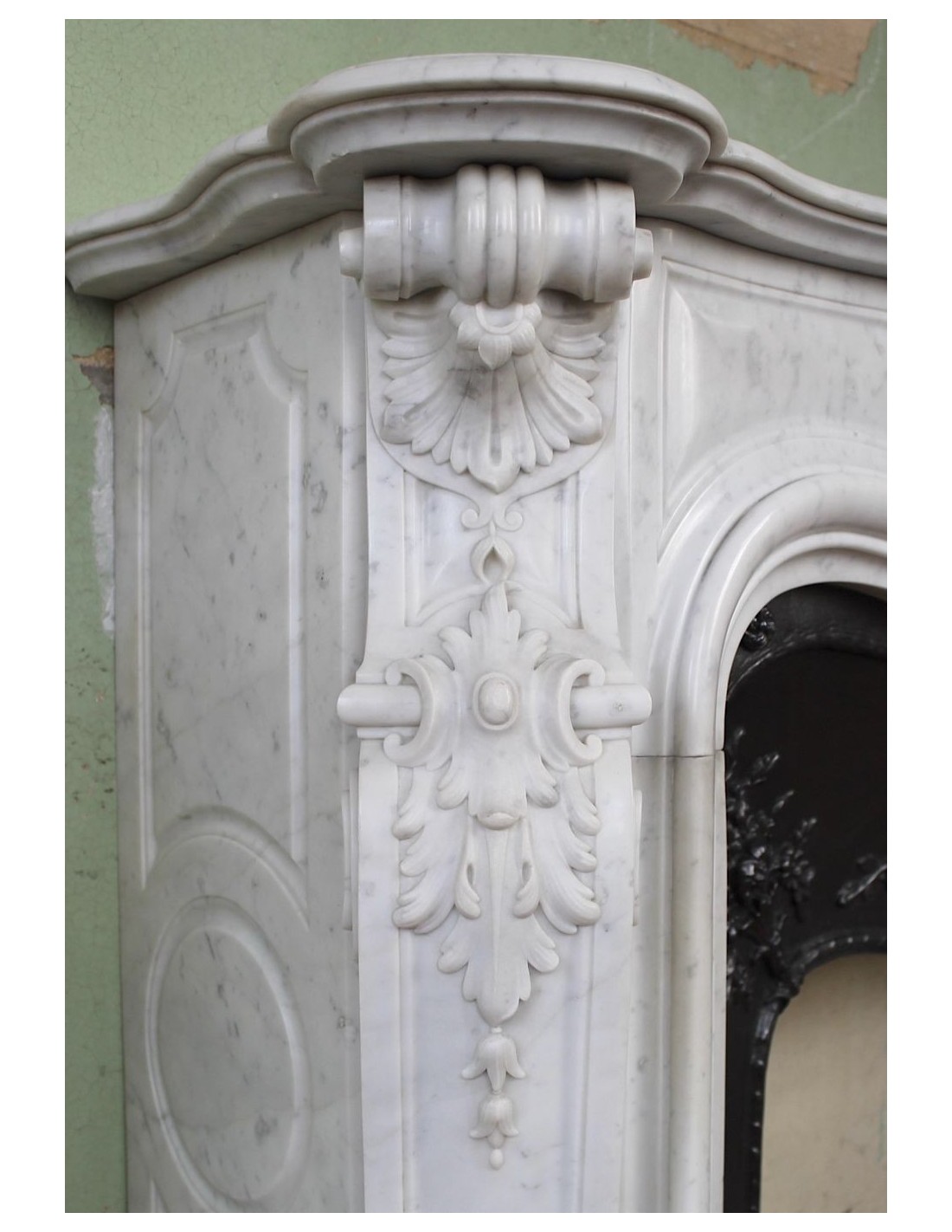 027 AG ANTIQUE LOUIS XV "ROSACES" FIREPLACE MANTEL CARVED IN WHITE CARRARA MARBLE WITH ITS OWN ORIGINAL FLORAL CAST IRON INSERT