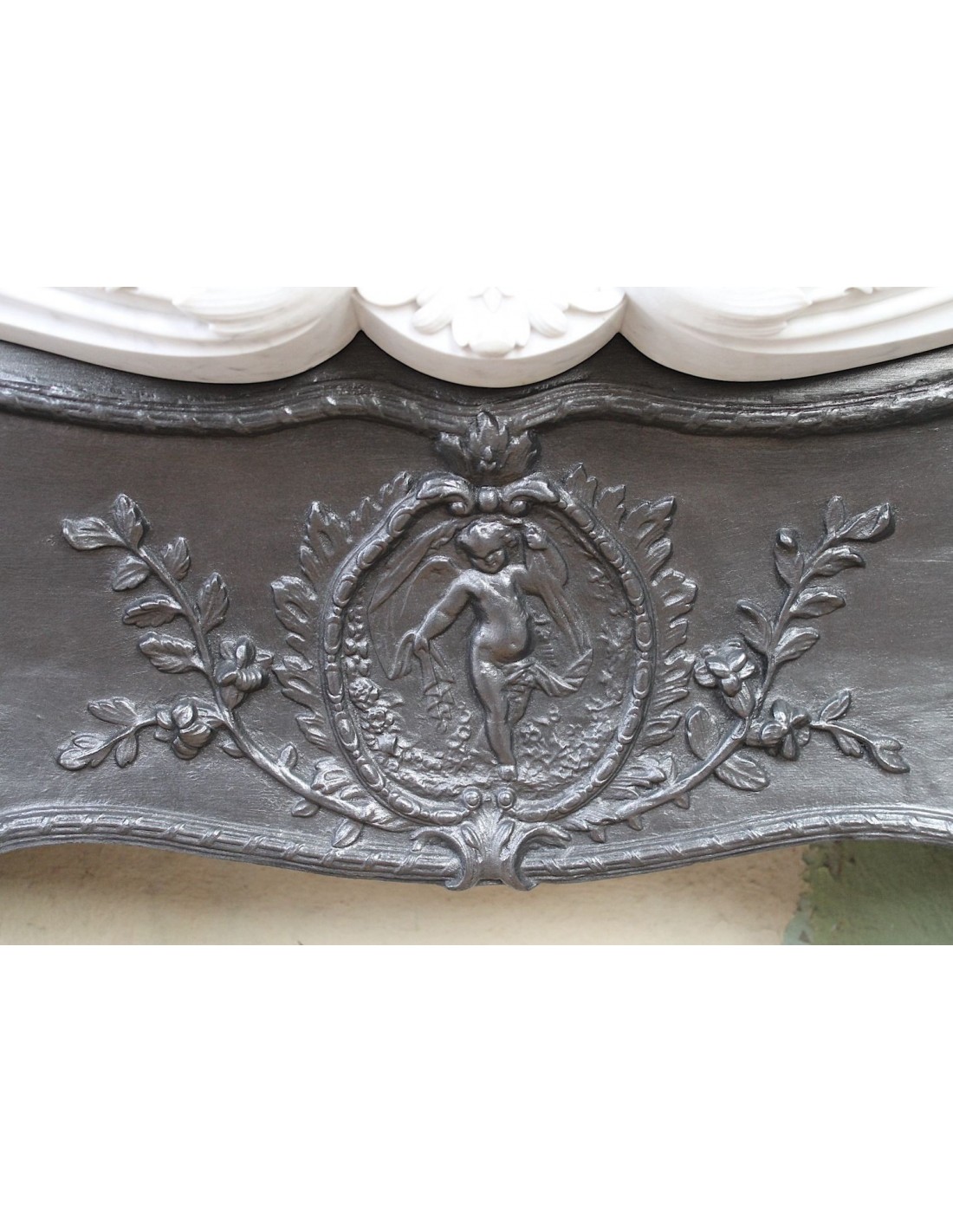 The cast iron insert is beautiful, with that winged putto (a classic and always pleasing cupid) and that leafy, floral affixing, as well as highly original (you will not see one like it (but neither will you see one simply similar) in the 200 cast iron inserts in our warehouse).
