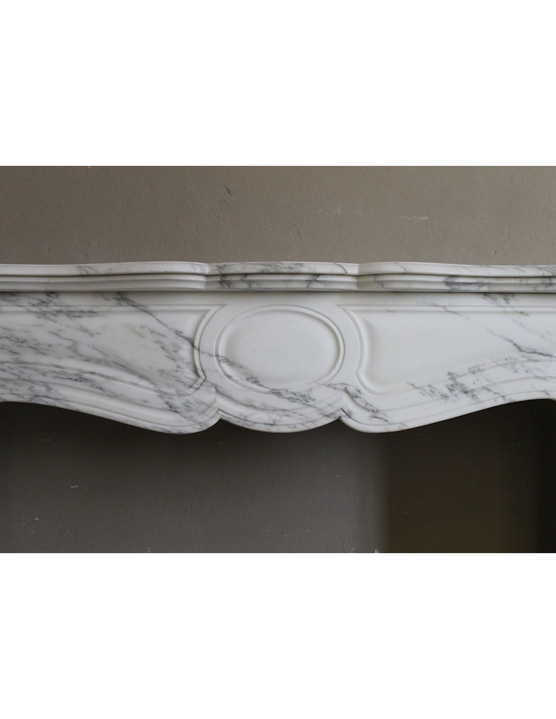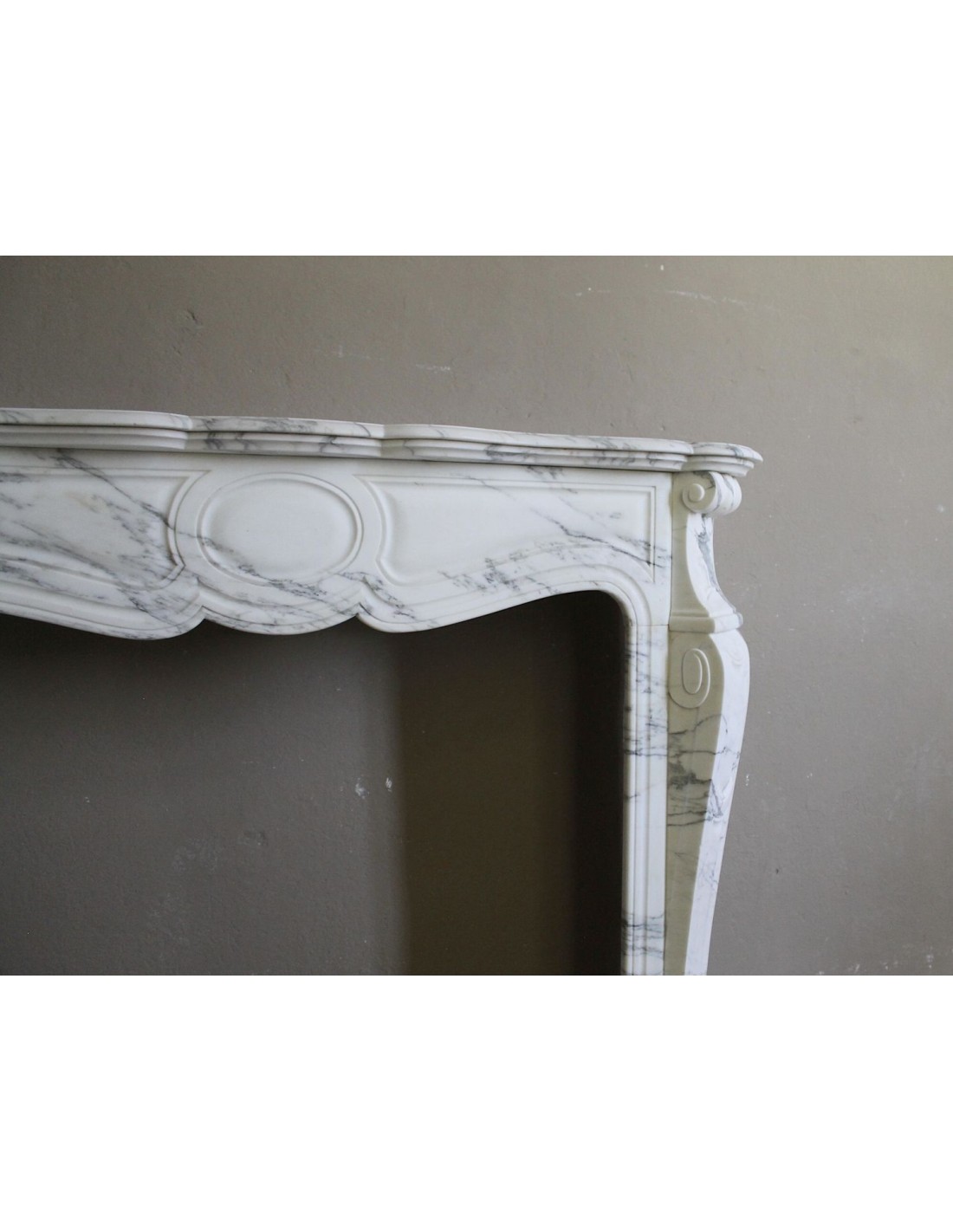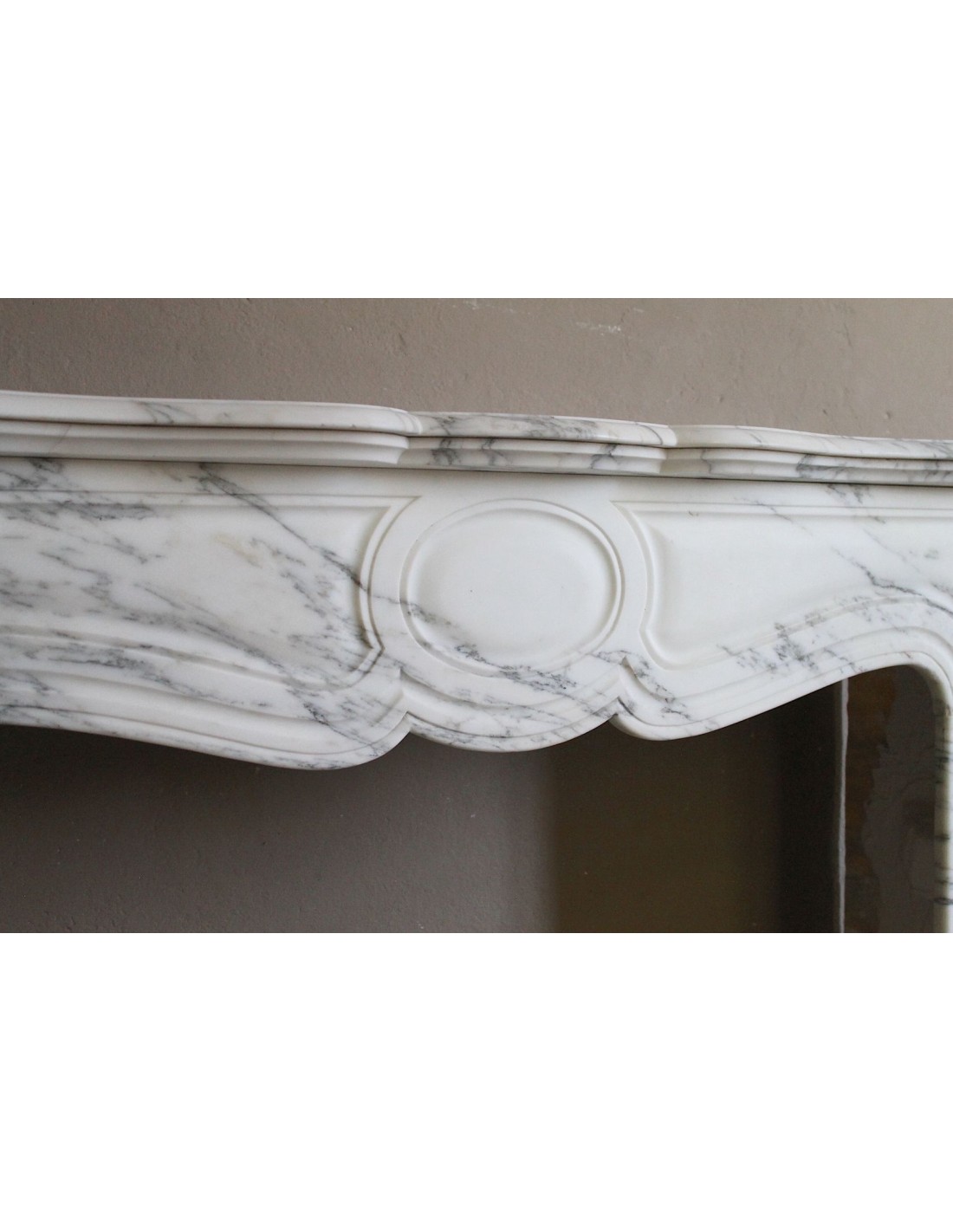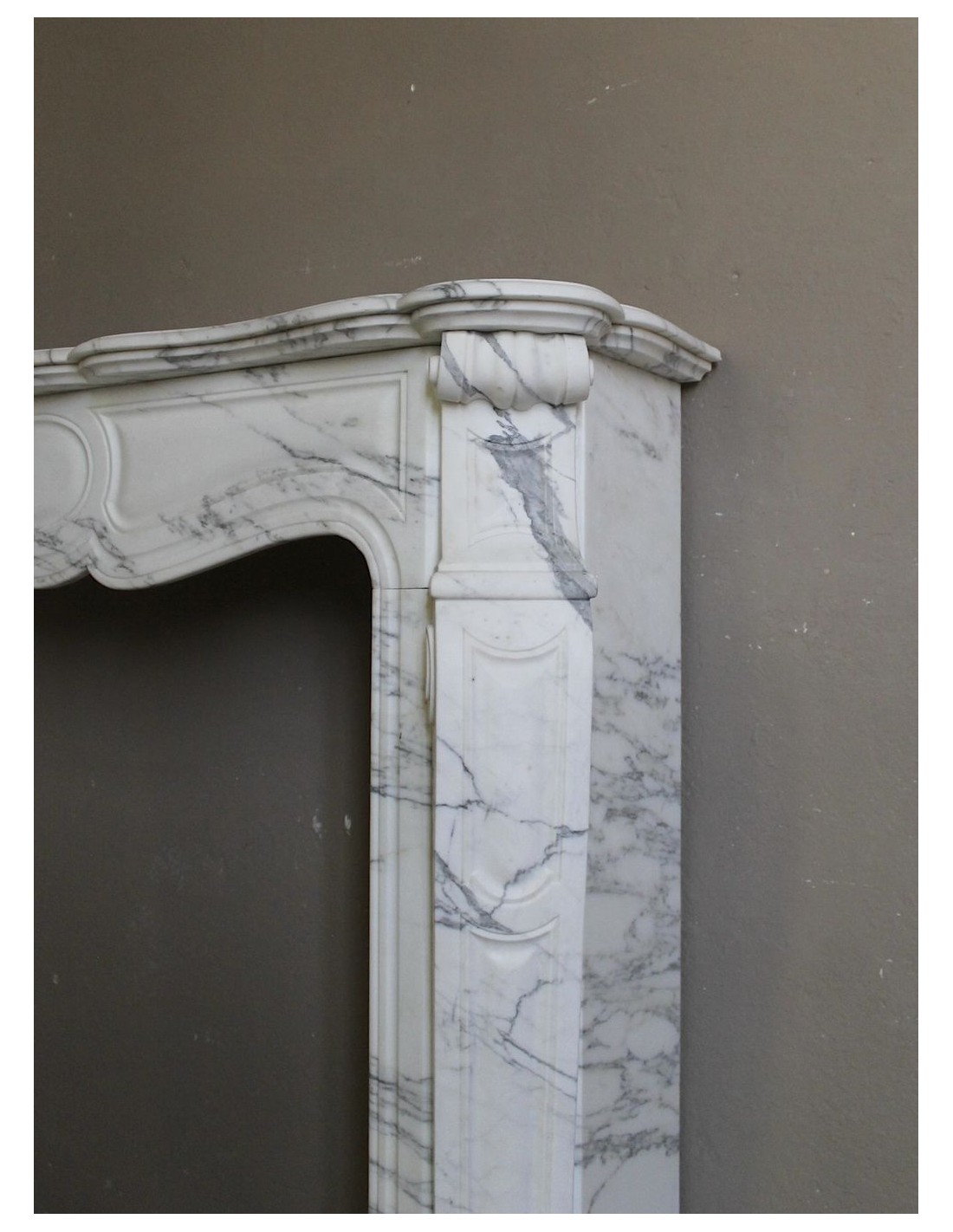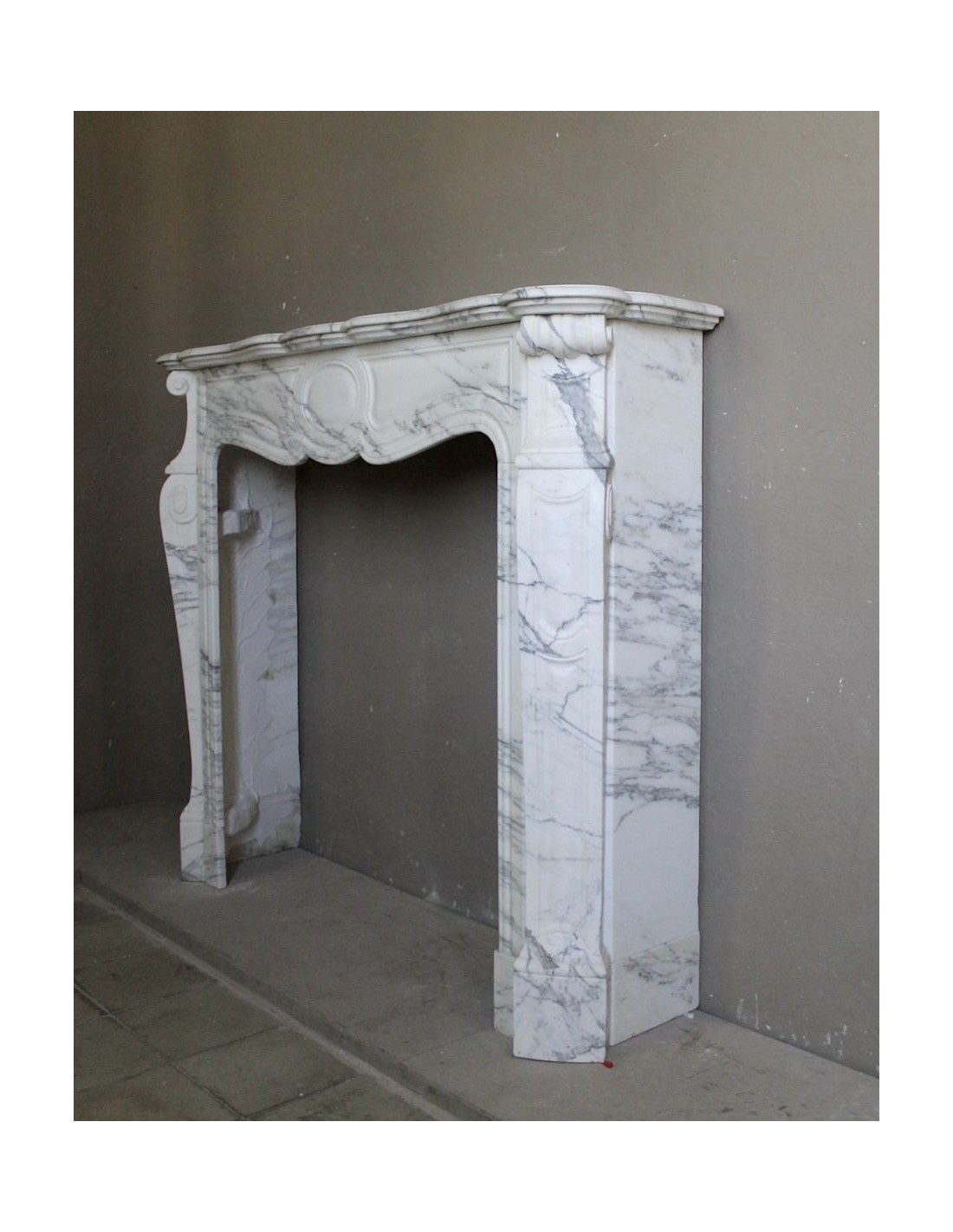 Antique fireplace surround carved from white Statuary marble. This fireplace is of Baroque style, and belongs to the "Pompadour" family. Its proportions are generous, and its sinuous lines are highlighted by the beautiful Italian Arabescato marble and its elegant veining.