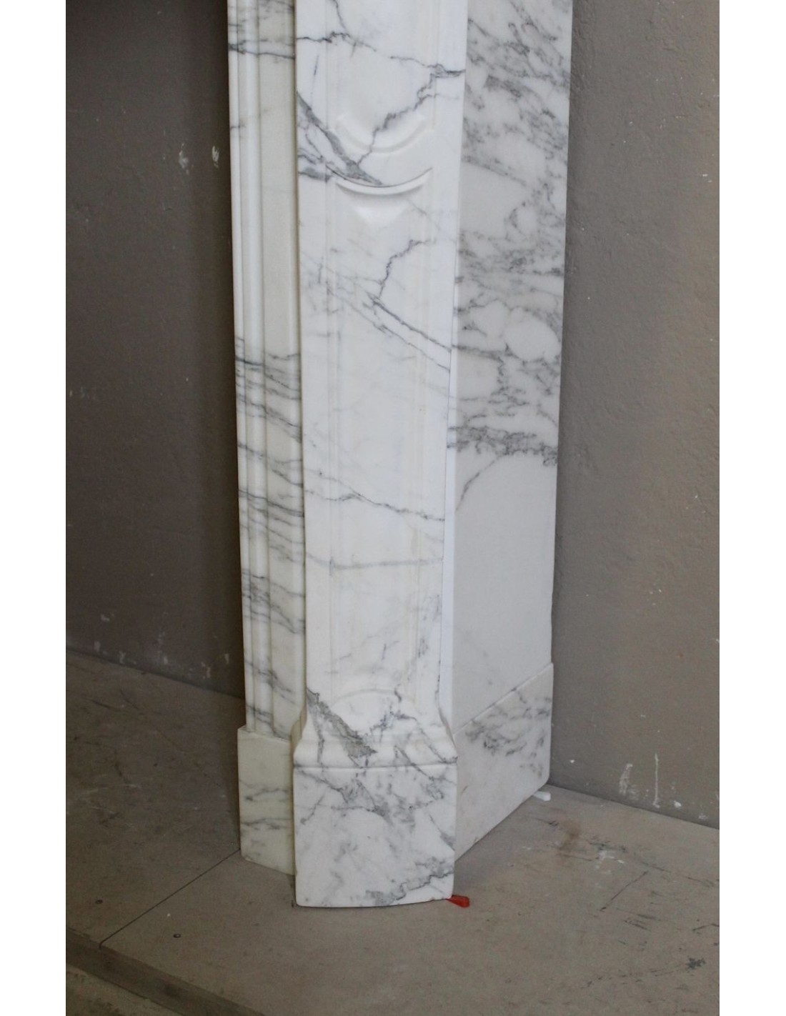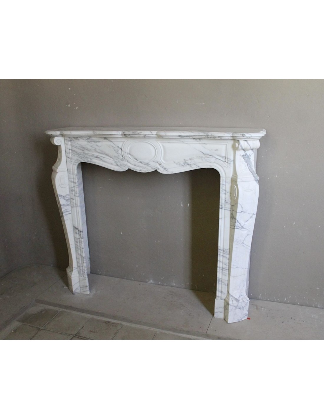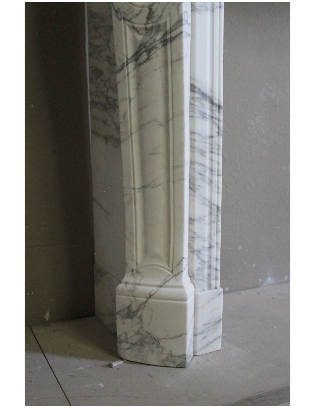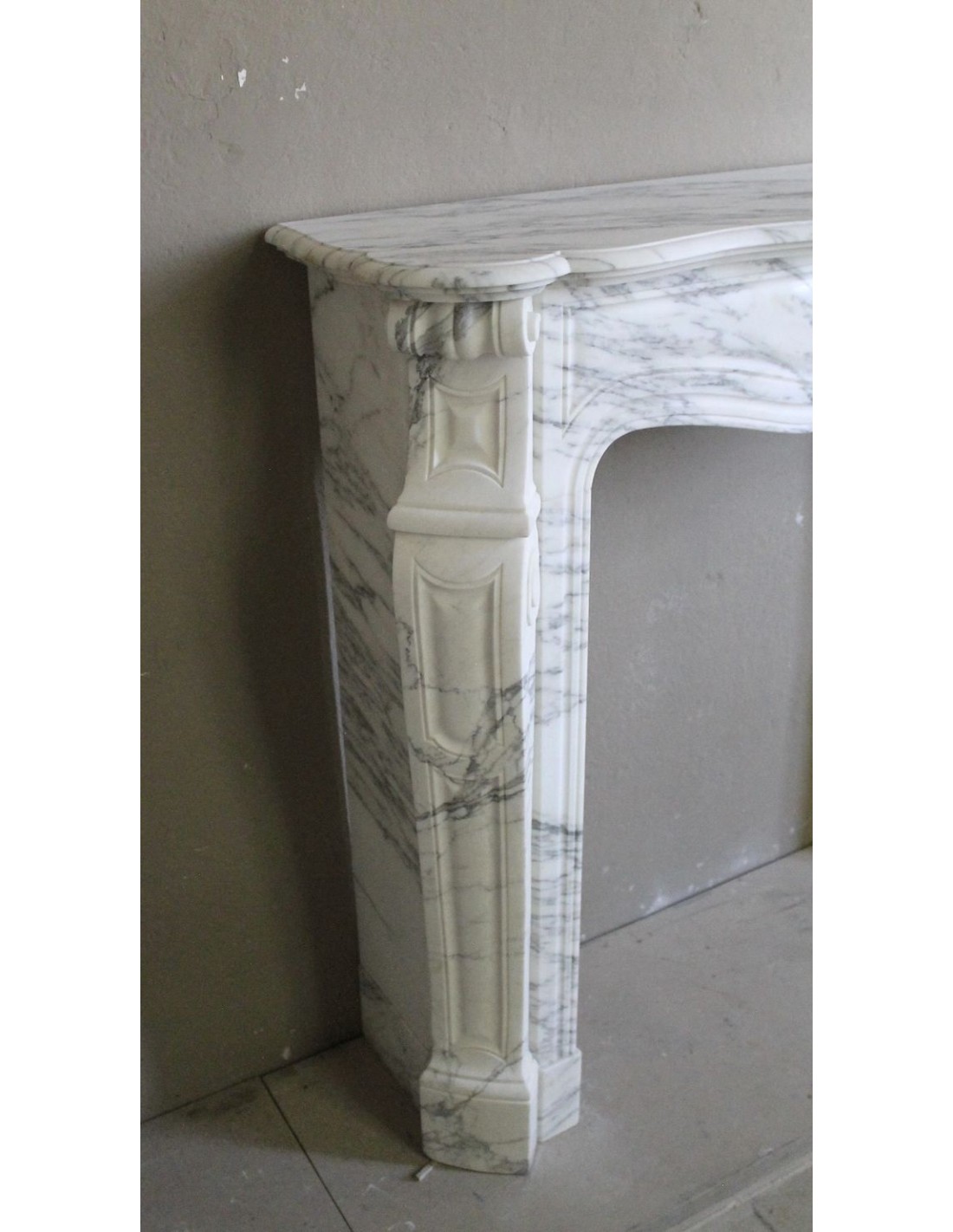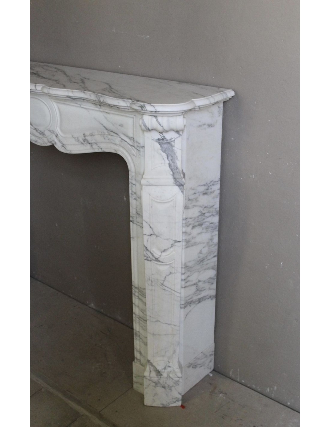 Antique fireplace surround carved from white Statuary marble. This fireplace is of Baroque style, and belongs to the "Pompadour" family. Its proportions are generous, and its sinuous lines are highlighted by the beautiful Italian Arabescato marble and its elegant veining.