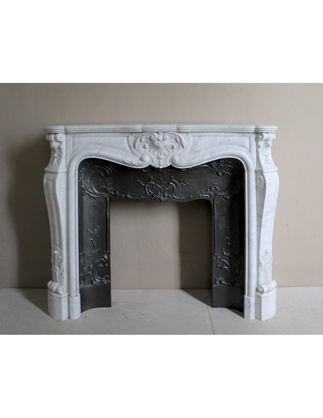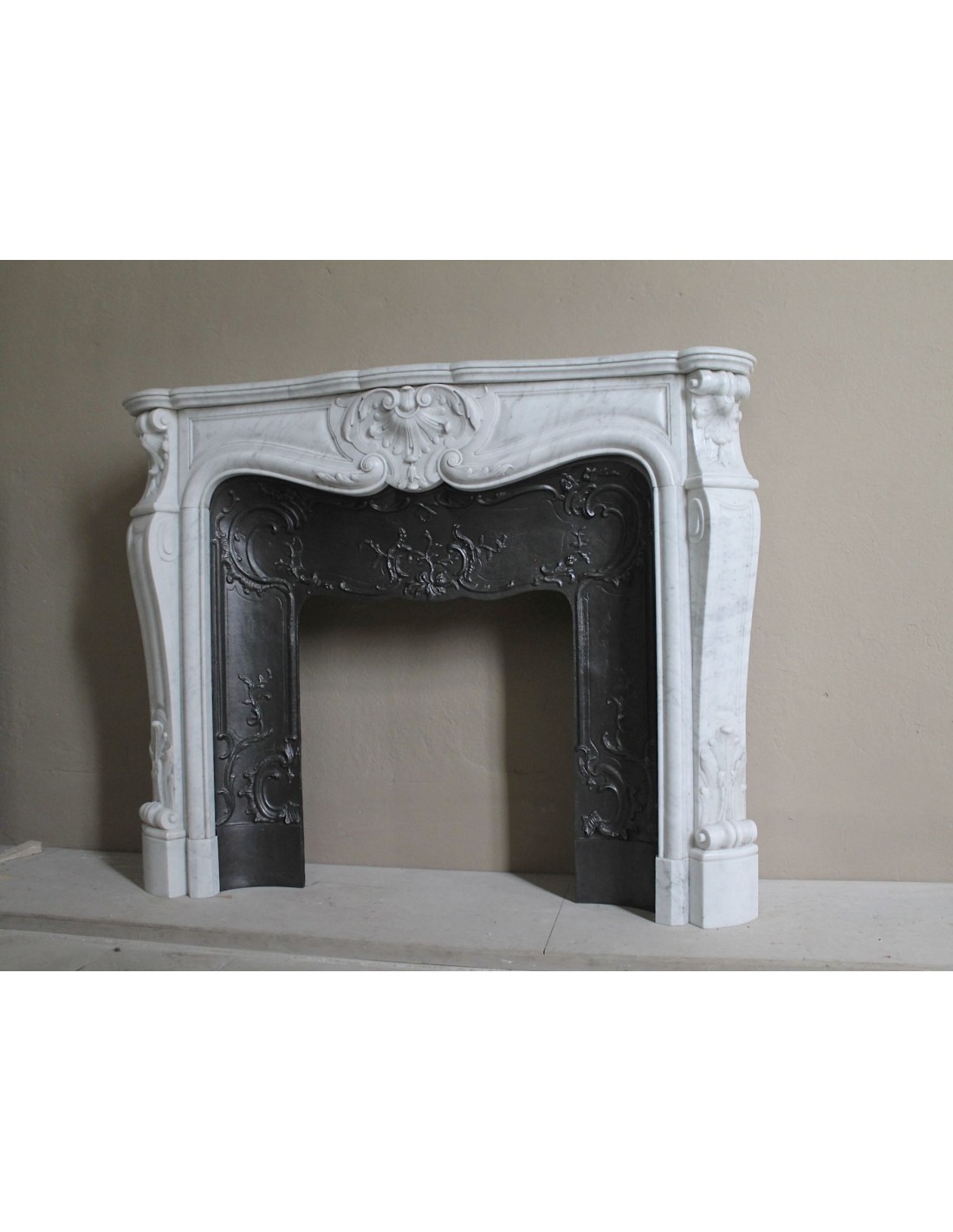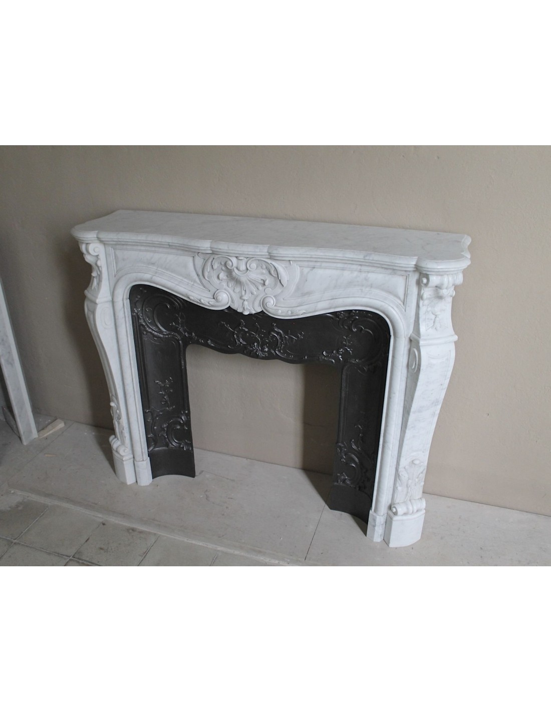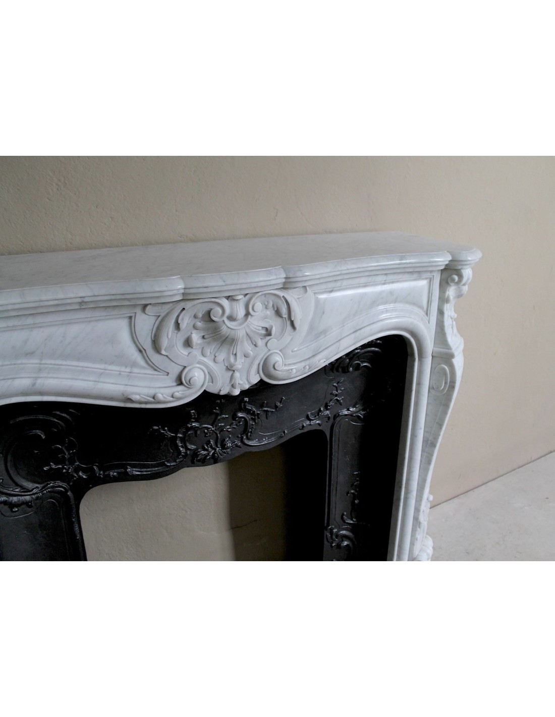 024 AG LOUIS XV “AMÉLIORÉ” FIREPLACE MANTEL CARVED IN WHITE CARRARA MARBLE WITH ITS ORIGINAL CAST IRON INSERT