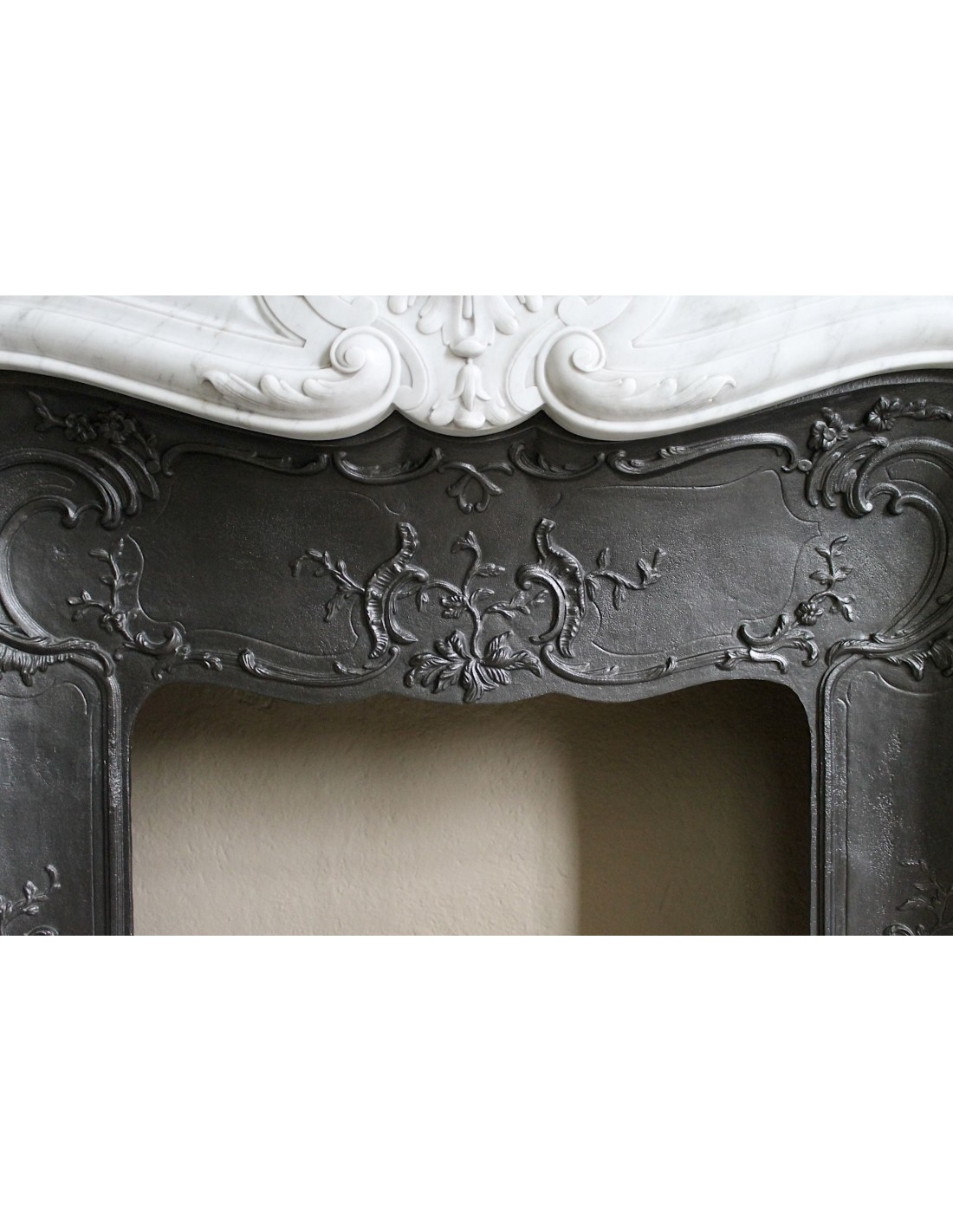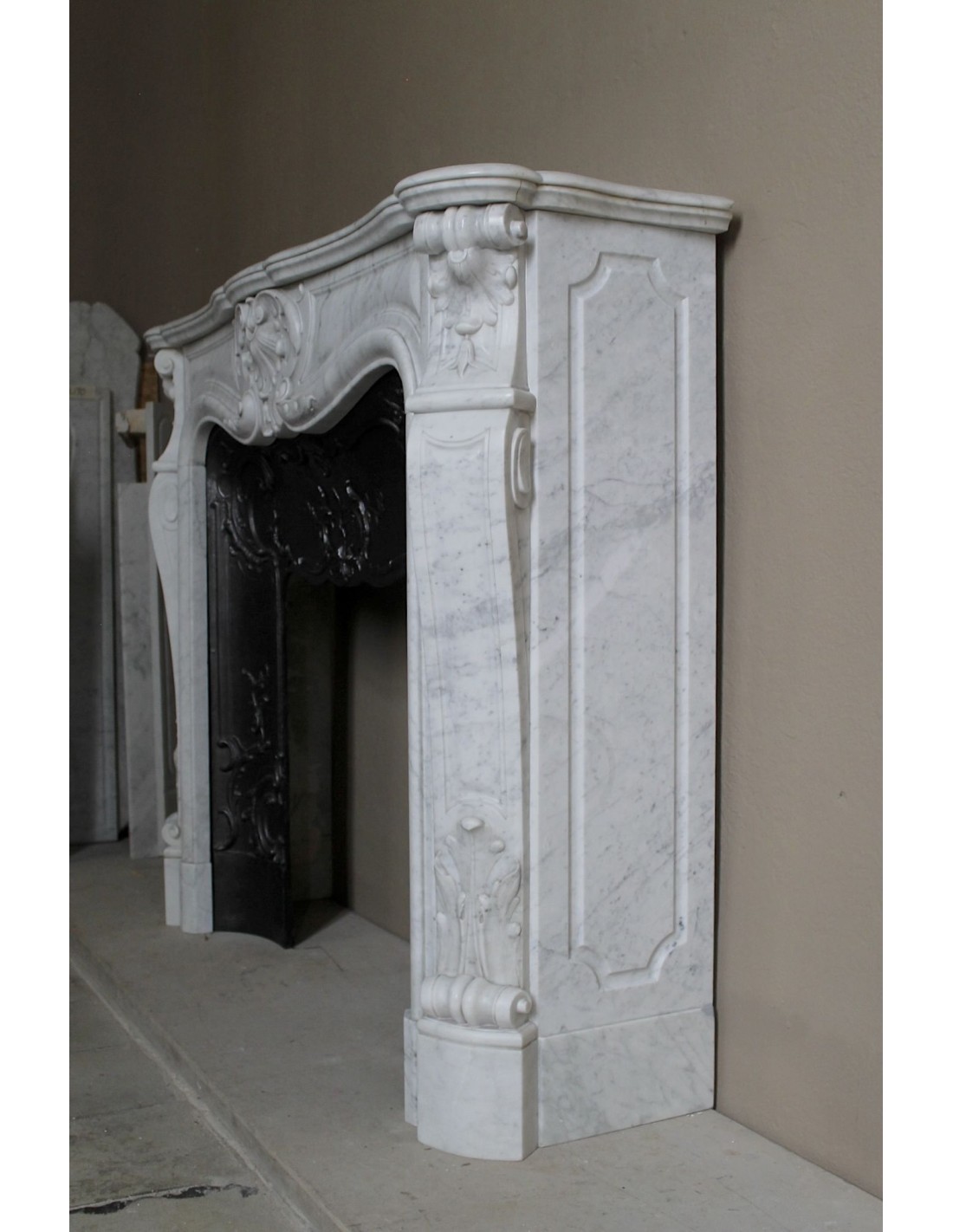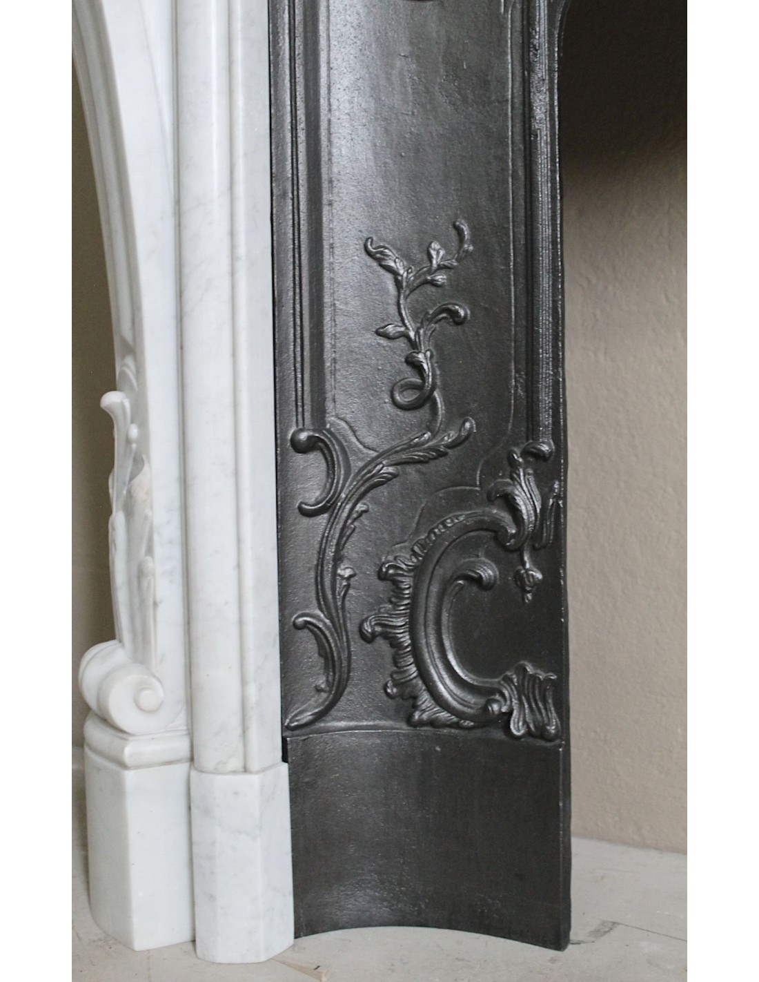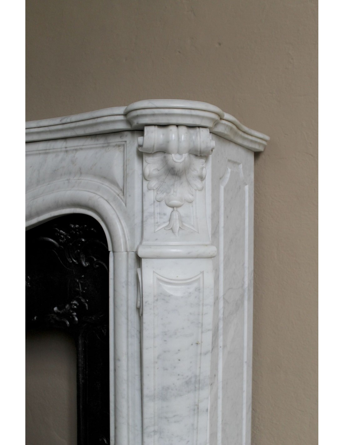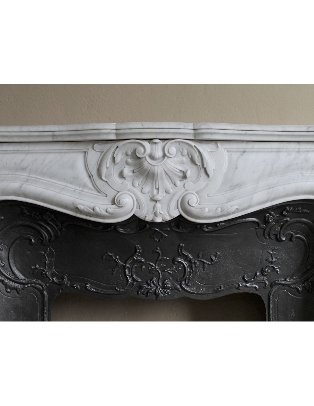 024 AG LOUIS XV “AMÉLIORÉ” FIREPLACE MANTEL CARVED IN WHITE CARRARA MARBLE WITH ITS ORIGINAL CAST IRON INSERT