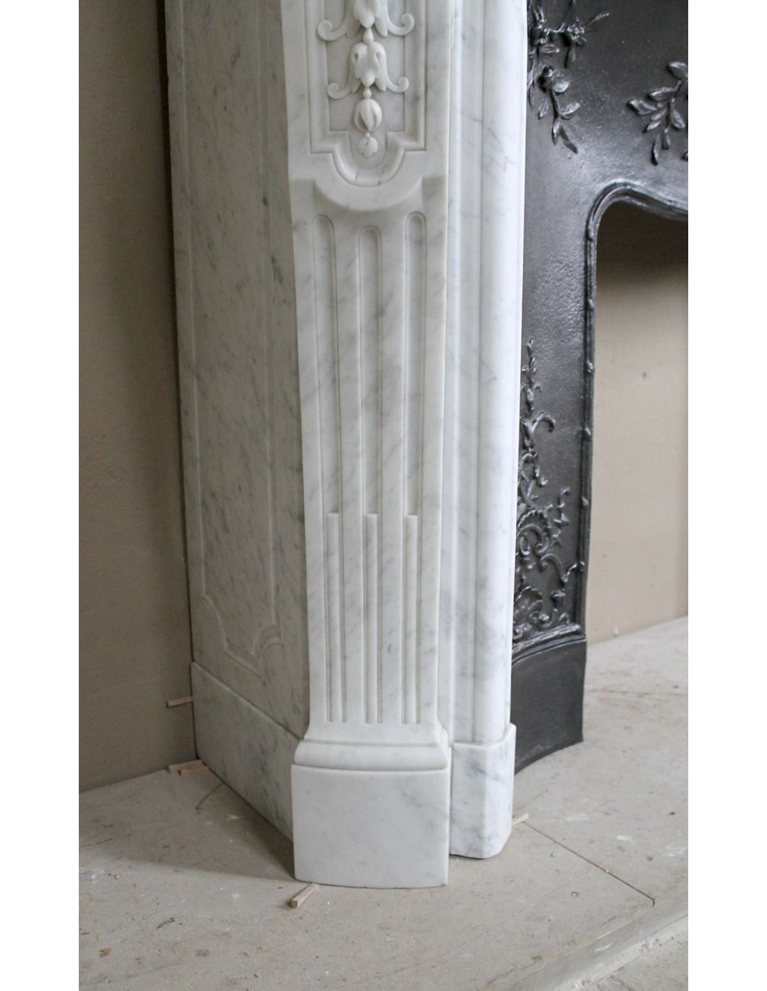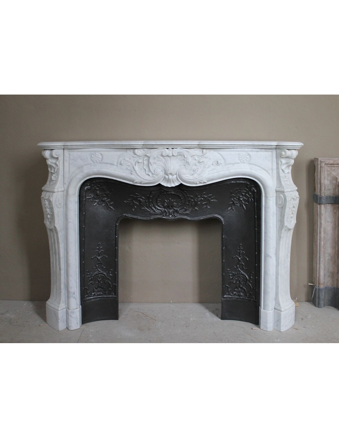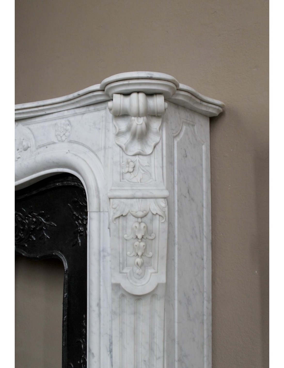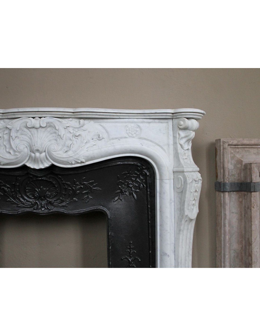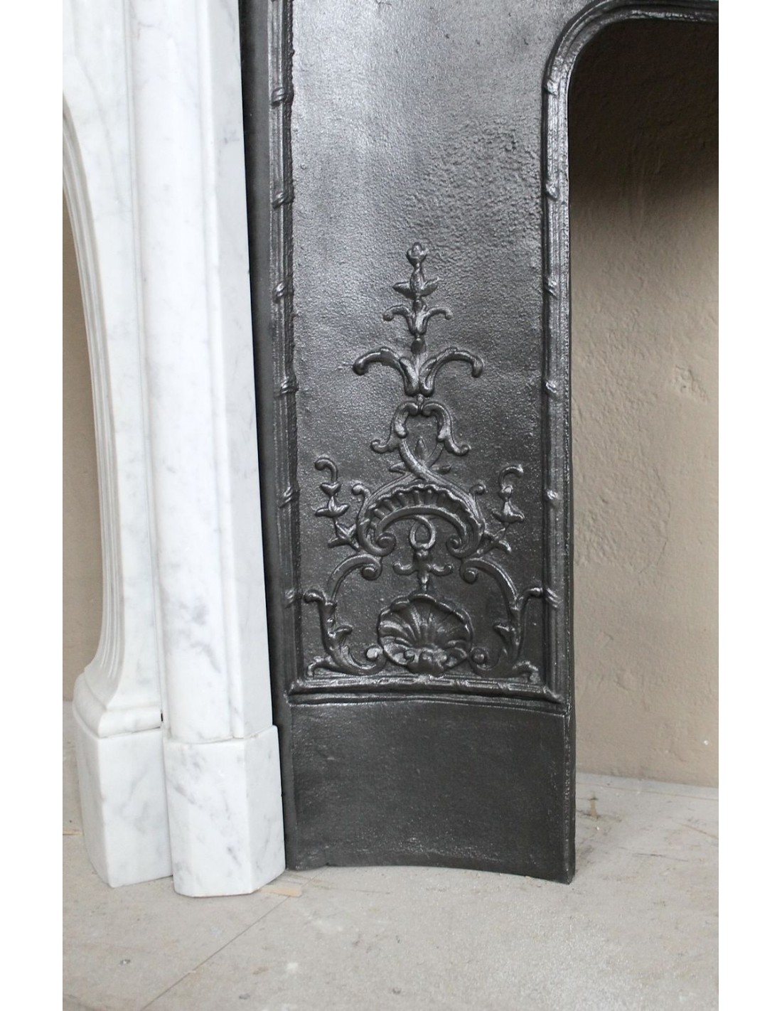 Let’s start with the frieze, where the central figure is a Saint Jacques shell, whose upper part is formed by a series of parallel, plant-like “stems.” It is interesting to note how, in the cast-iron insert (exactly beneath our arboreal shell), there is another Saint Jacques shell — this time in iron — serving as a companion to its marble twin.