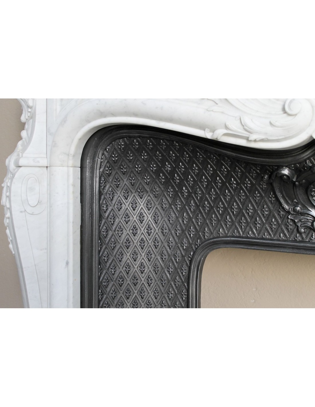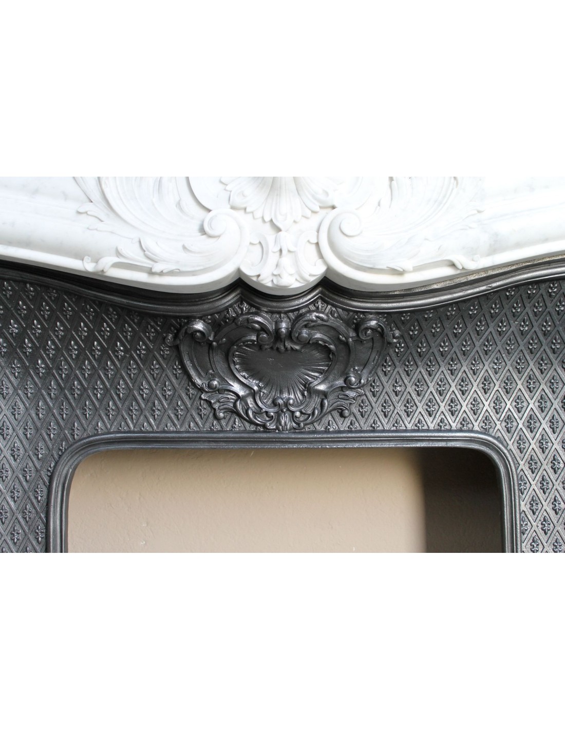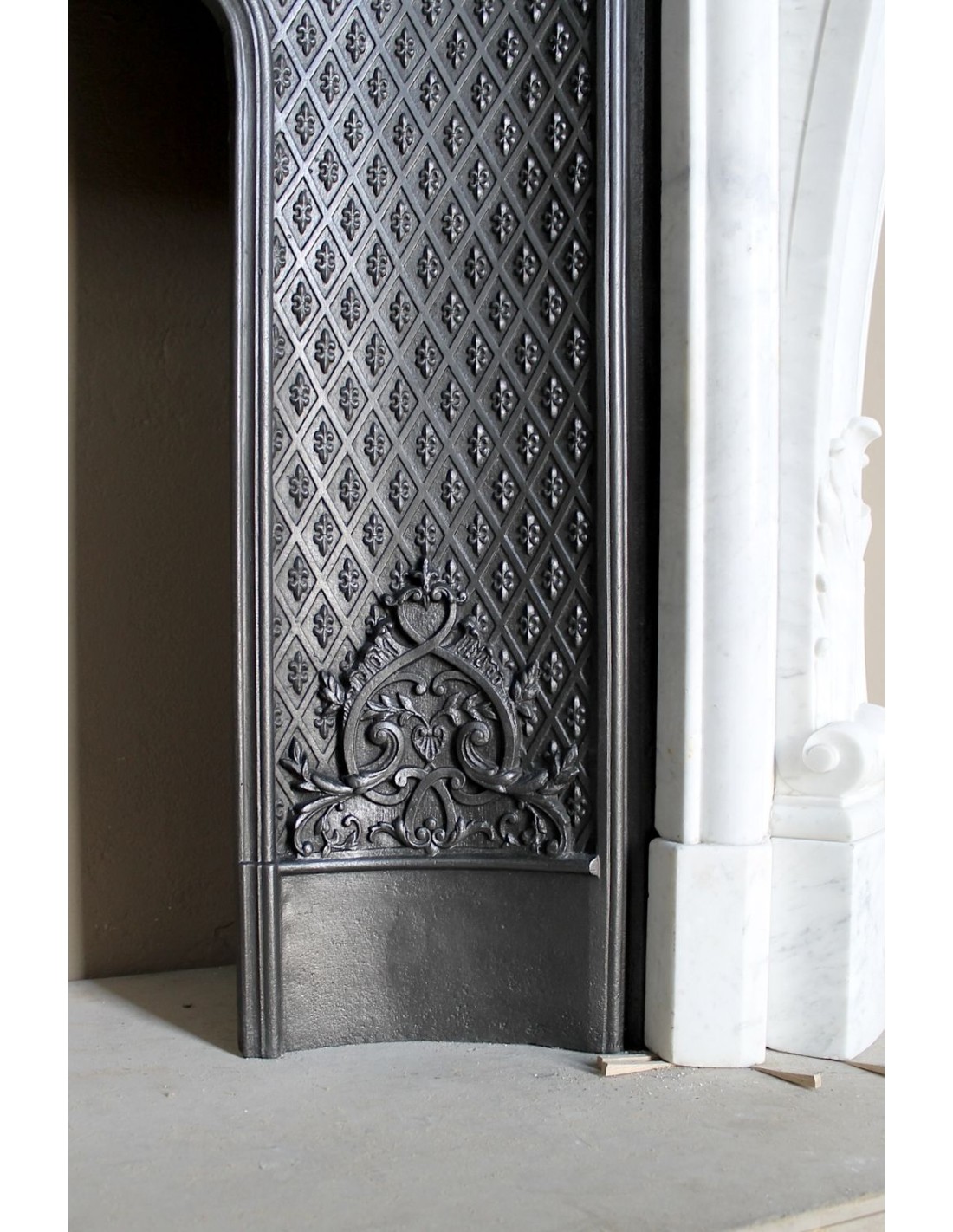 Our insert — an element that in old Italian terminology was called a stringibocca — is a 19th-century artistic cast-iron piece (circa 1860–1880), in perfect condition. Its main feature is its tapisserie-style decoration (NOTE FOR THE GENTLEMEN: “tapisserie” means a design created from a single motif repeated endlessly). The motif resembles what many mistake for a Medici fleur-de-lis.
