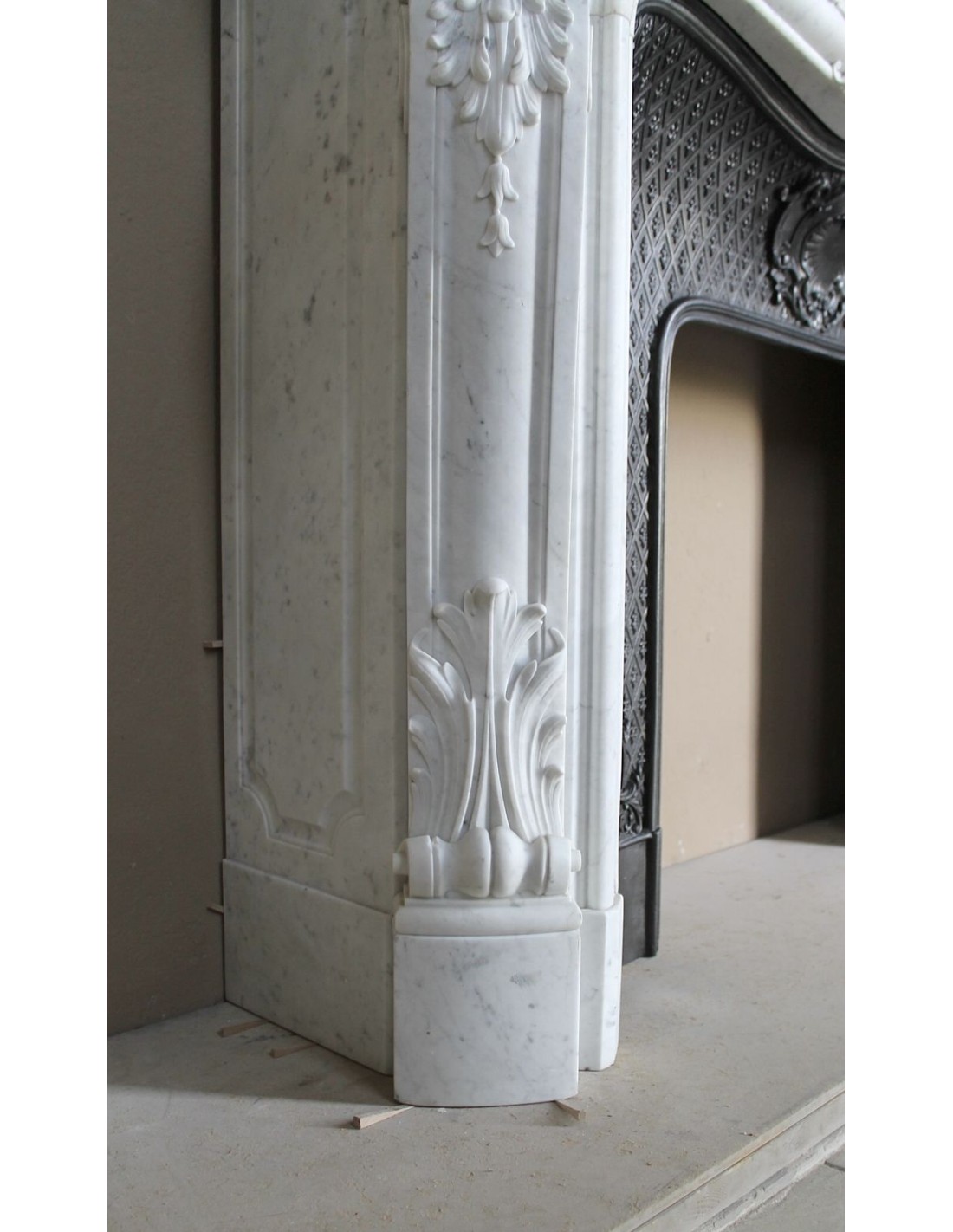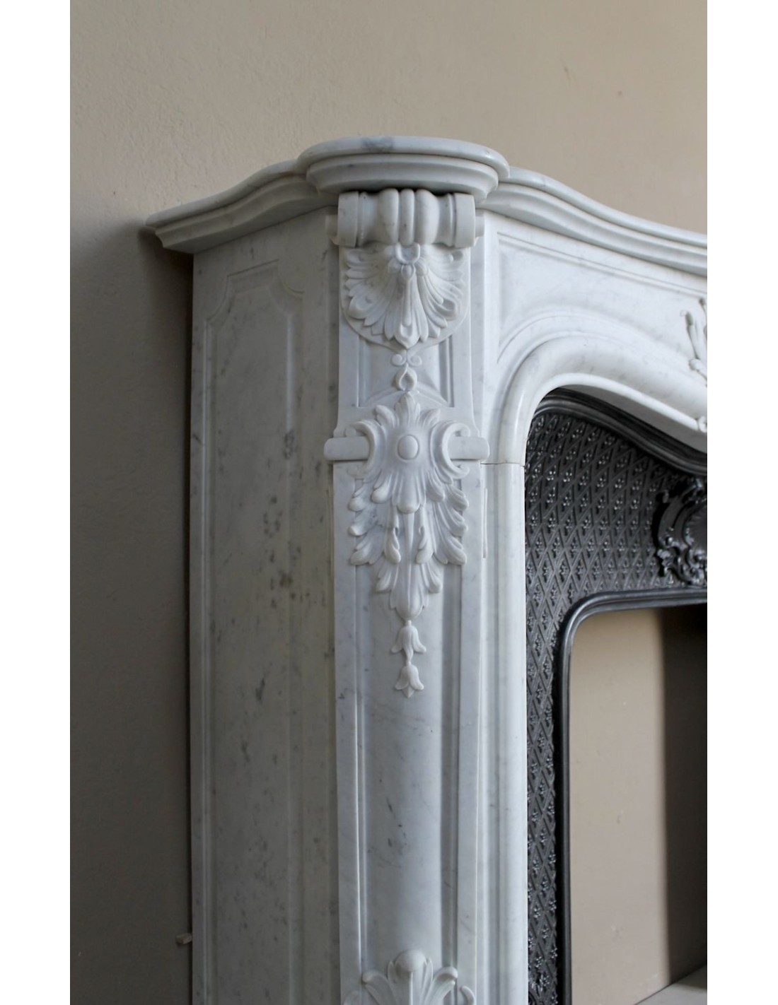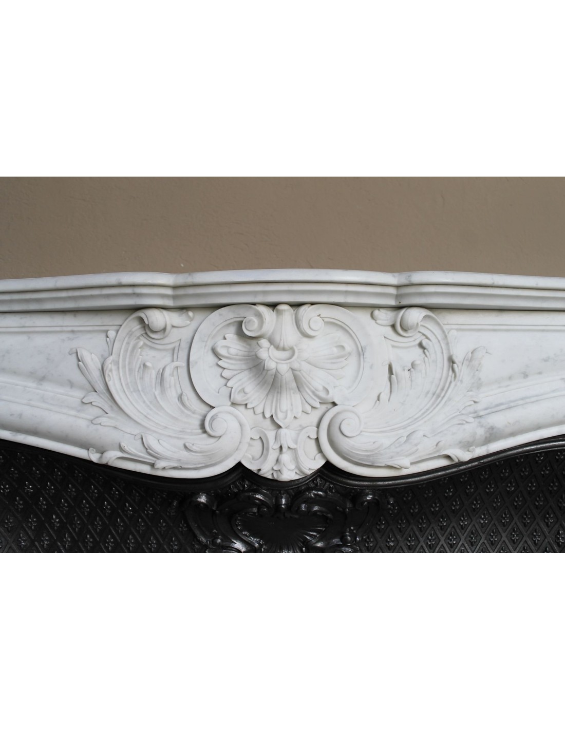 Our insert — an element that in old Italian terminology was called a stringibocca — is a 19th-century artistic cast-iron piece (circa 1860–1880), in perfect condition. Its main feature is its tapisserie-style decoration (NOTE FOR THE GENTLEMEN: “tapisserie” means a design created from a single motif repeated endlessly). The motif resembles what many mistake for a Medici fleur-de-lis.