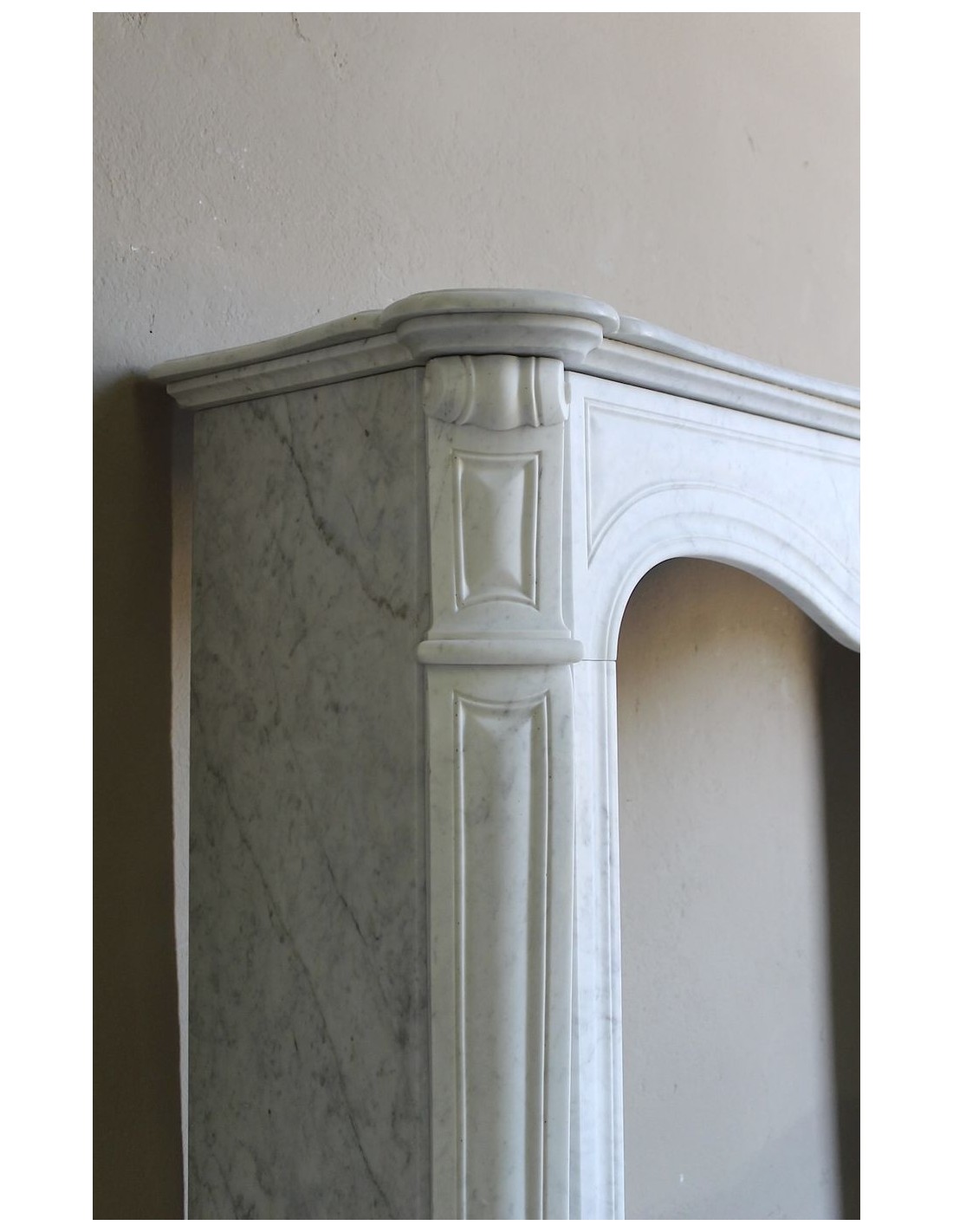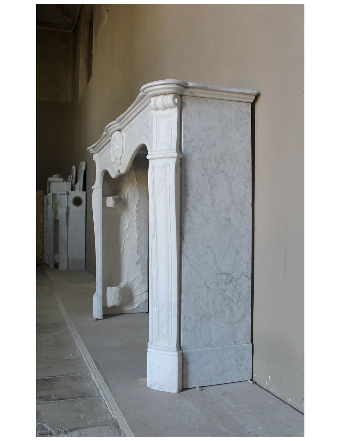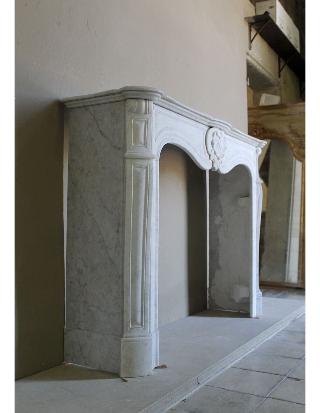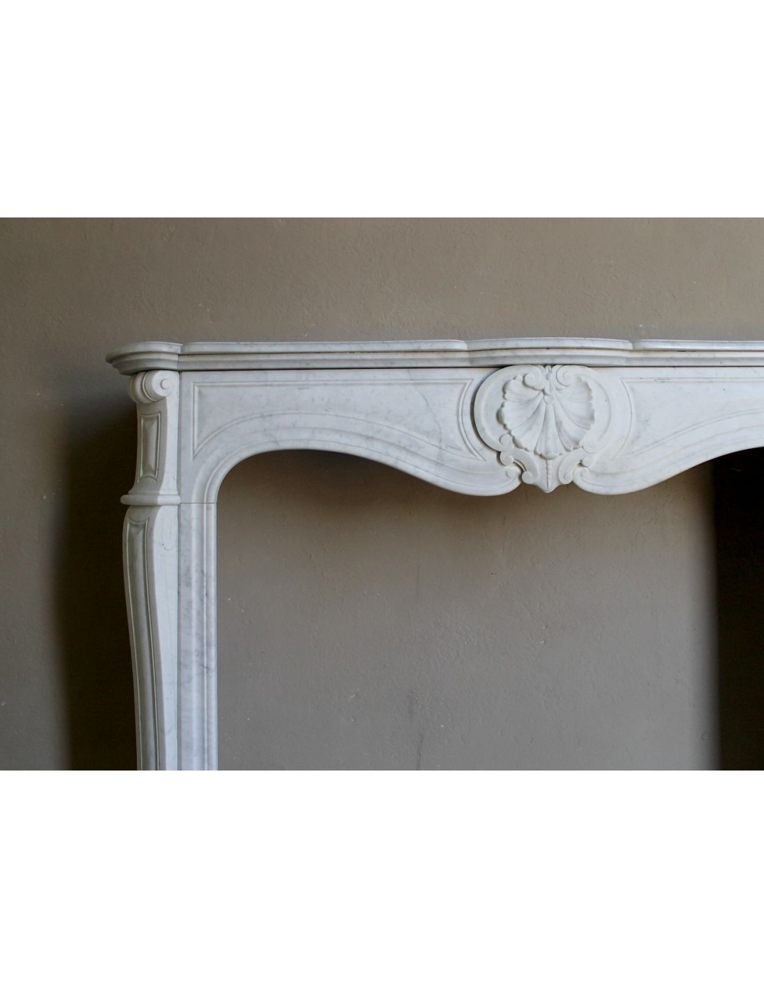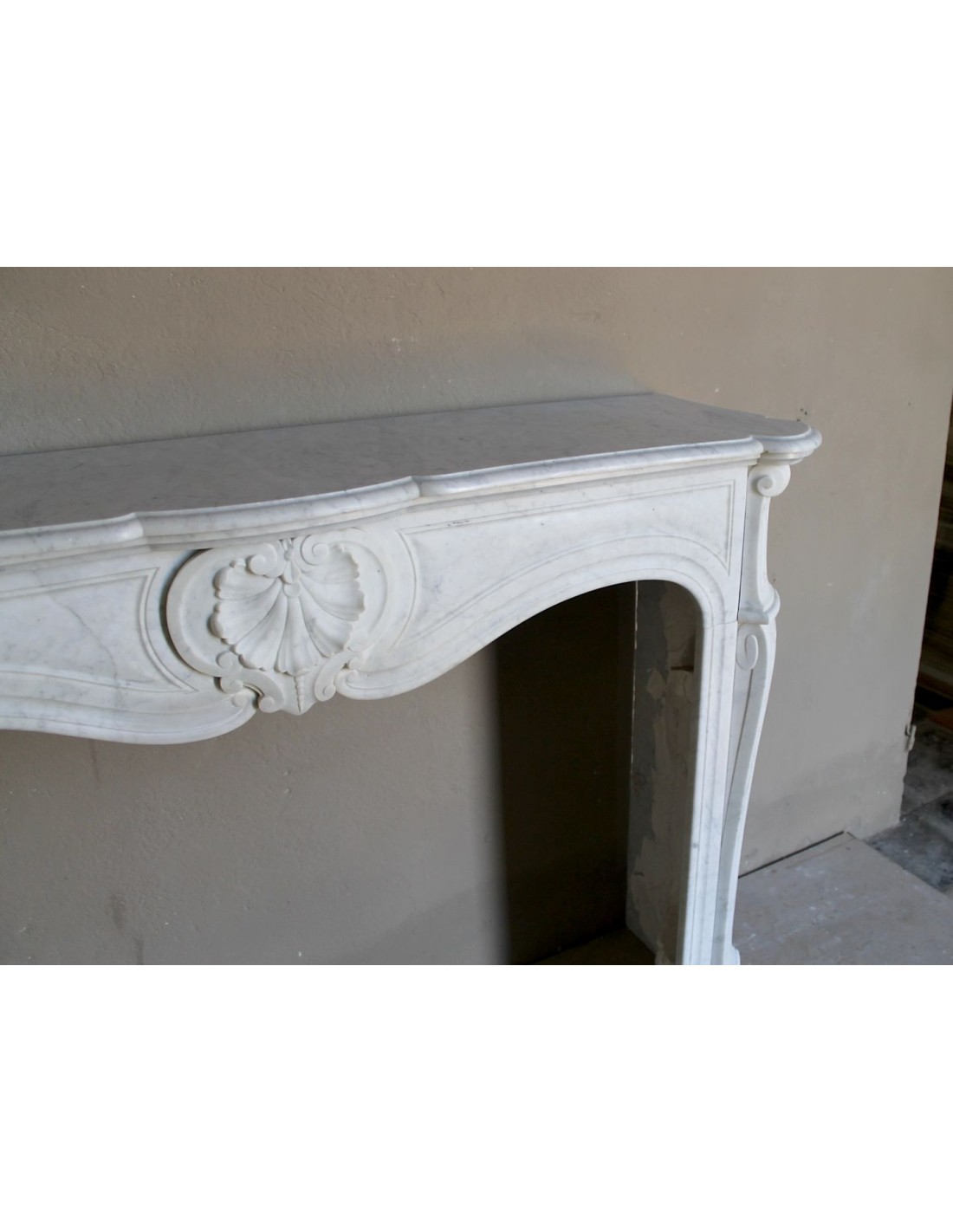 037 ANTIQUE LOUIS XV “COQUILLE” FIREPLACE MANTEL IN WHITE CARRARA MARBLE