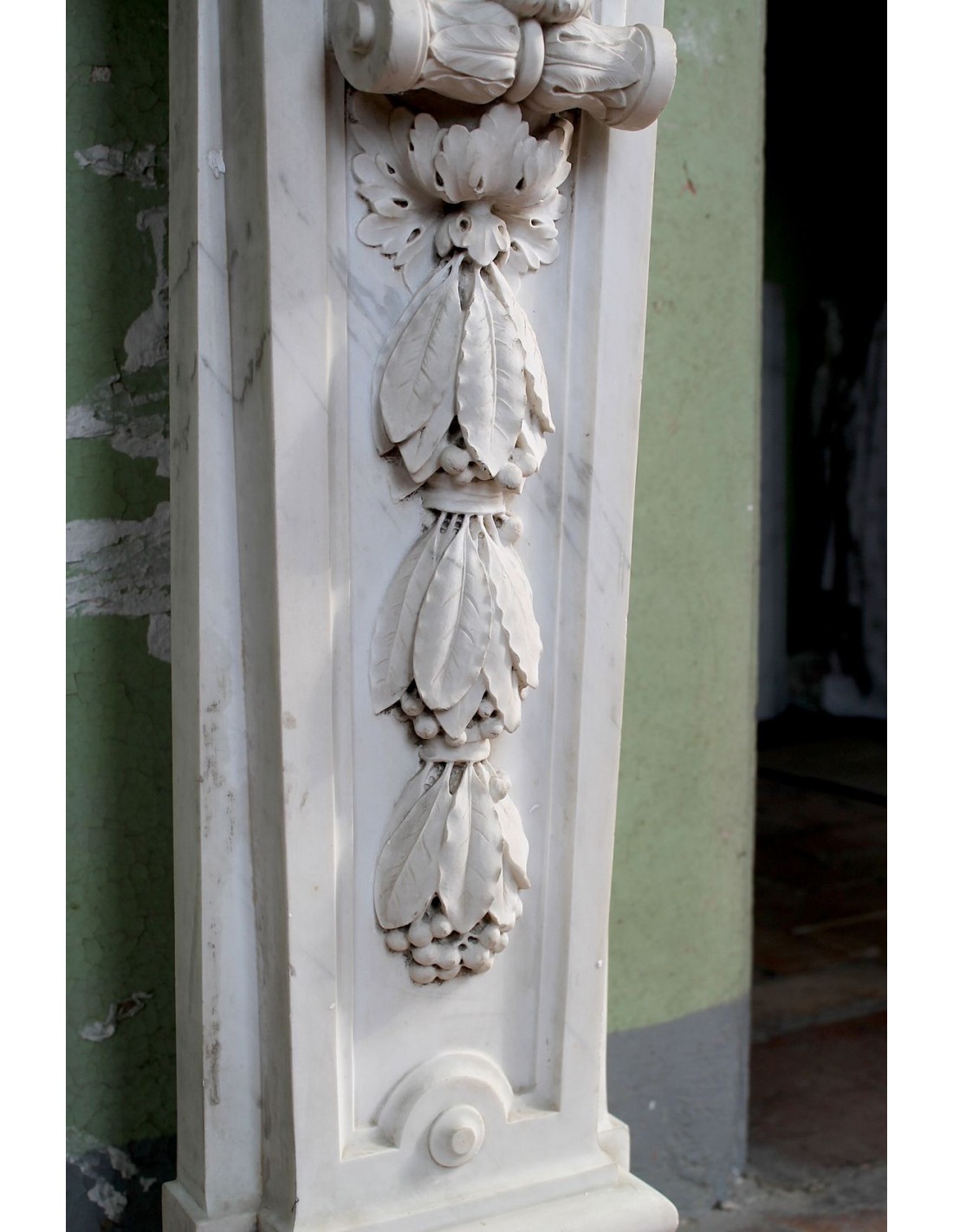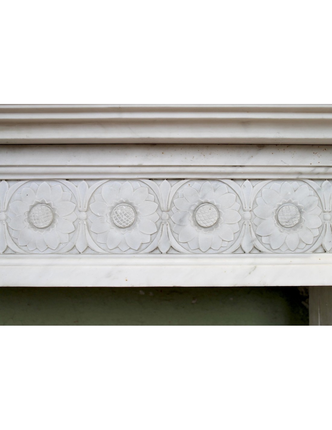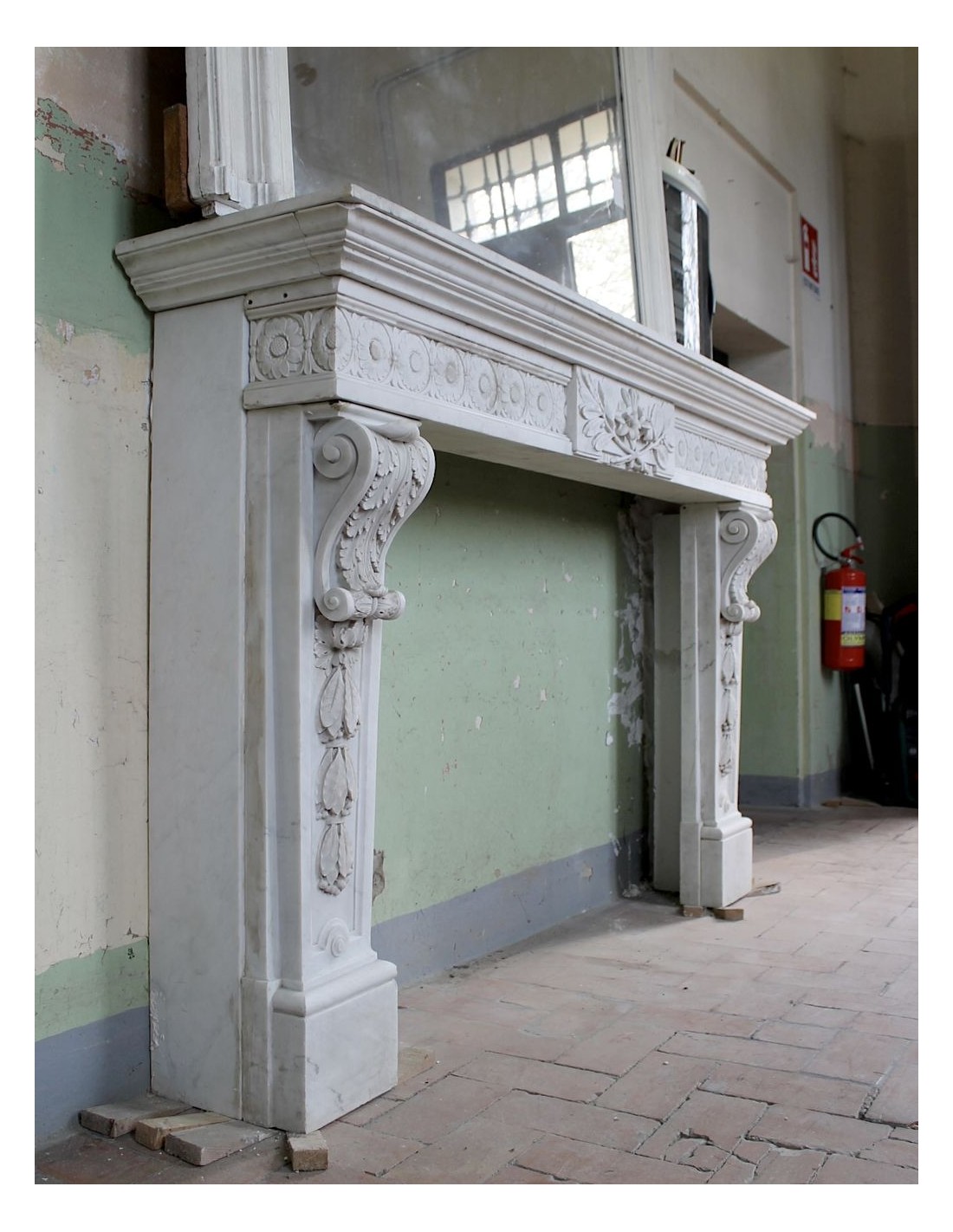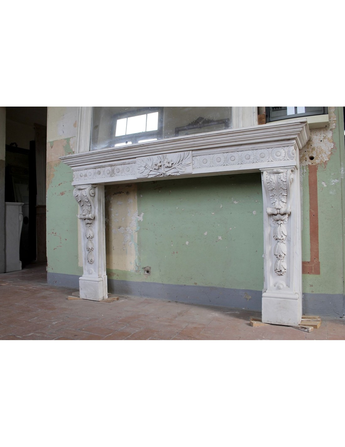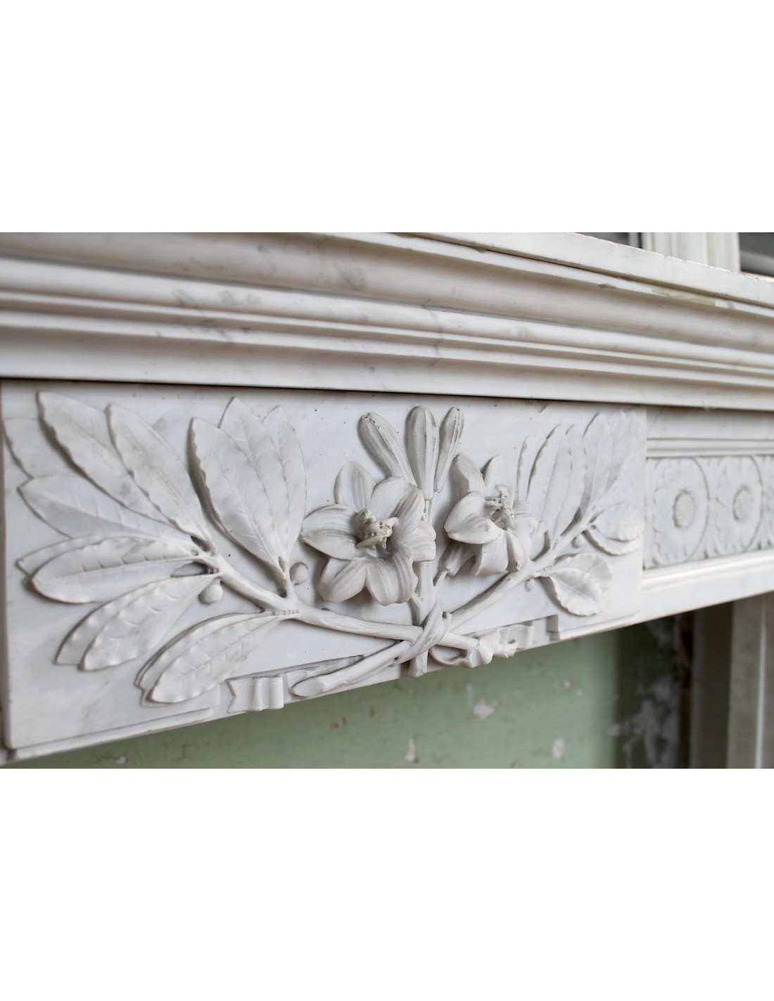IMPORTANT AND MONUMENTAL LOUIS XVI FIREPLACE MANTEL IN NOBLE WHITE STATUARY CARRARA MARBLE, EXCELLENT CONSERVATION, PROVENANCE LYON, ITALIAN SCULPTURE.