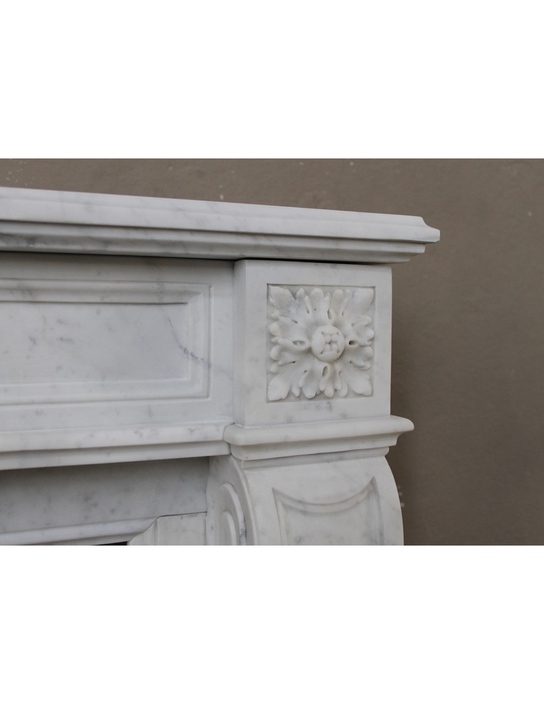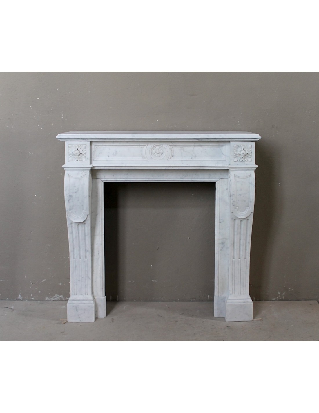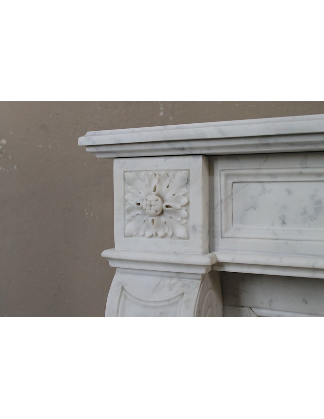 Antique Louis XVI fireplace mantel sculpted out of white Carrara marble. This authentic mantel piece is decorated with floral sculptures, roses and fleurs-de-lis.