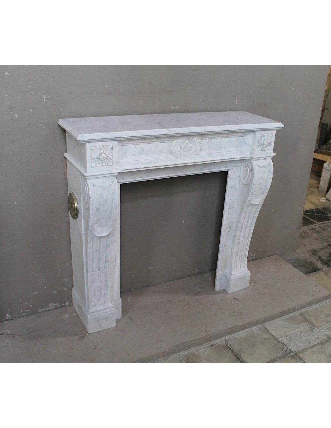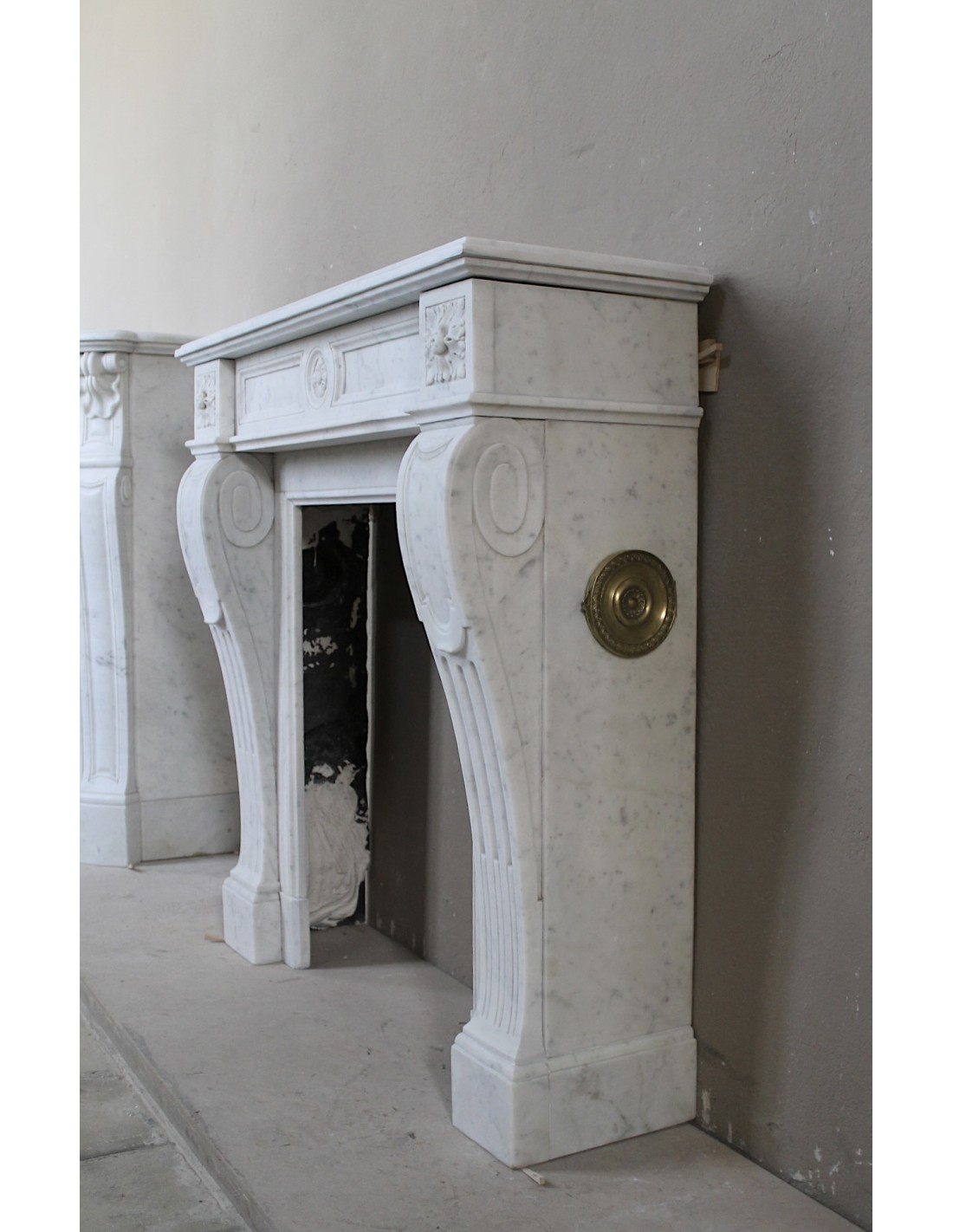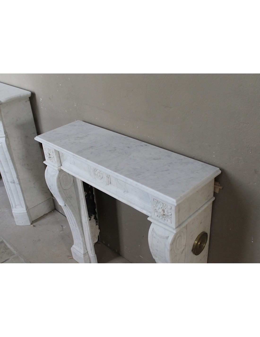 Antique Louis XVI fireplace mantel sculpted out of white Carrara marble. This authentic mantel piece is decorated with floral sculptures, roses and fleurs-de-lis.