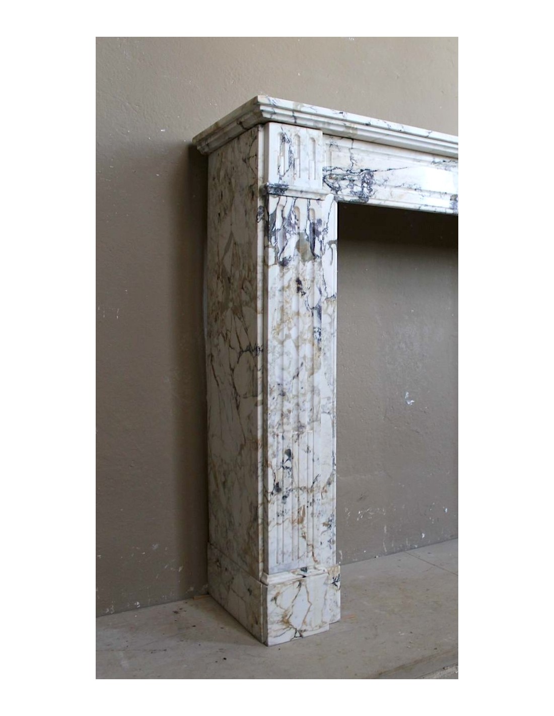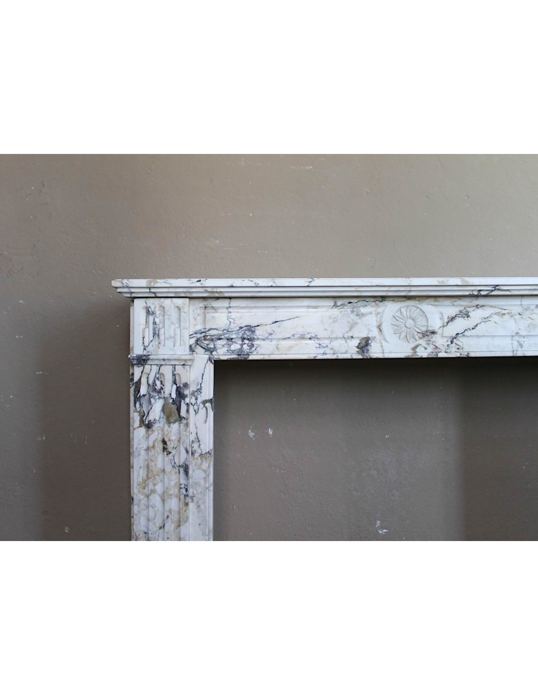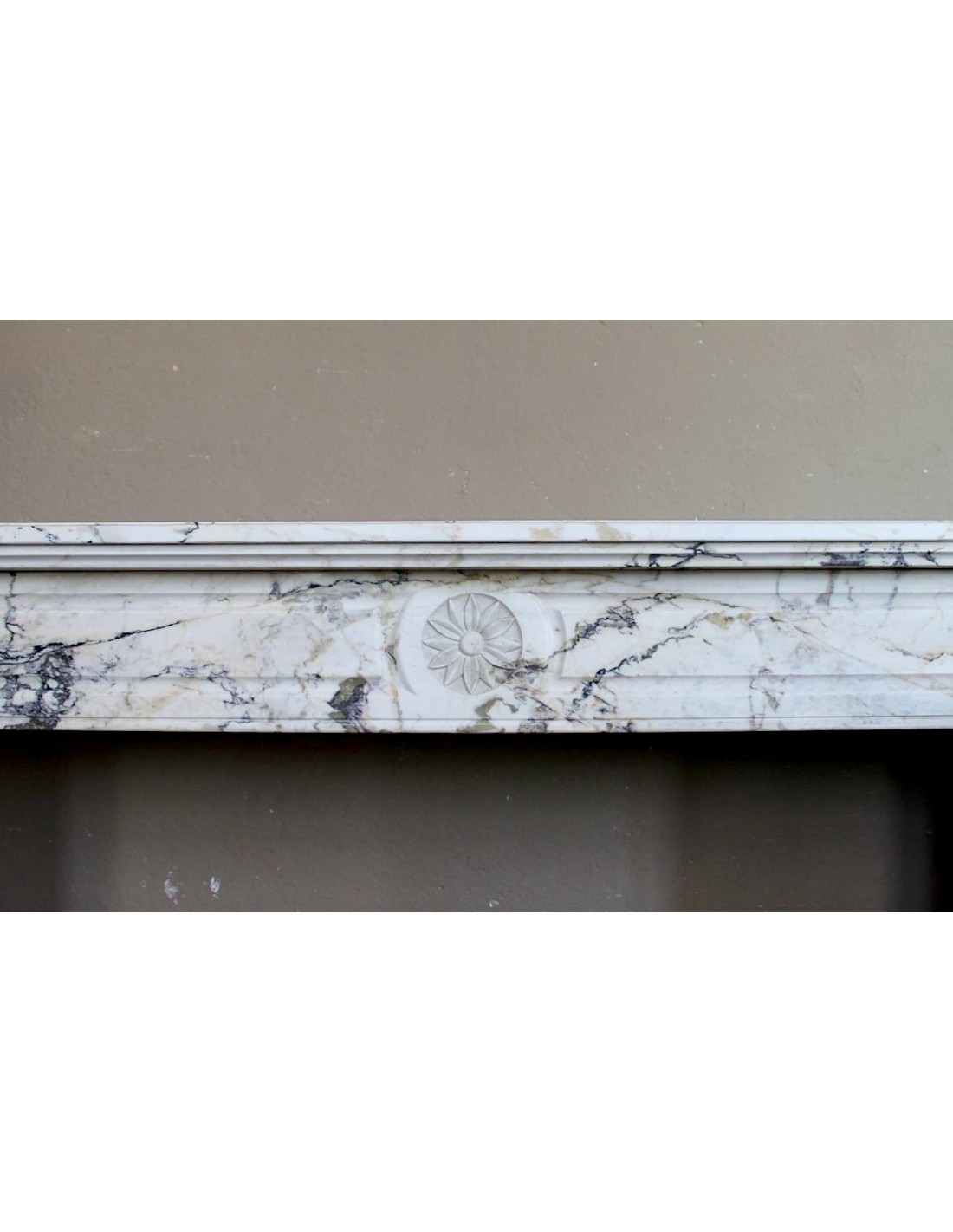 THIS MANTEL HAS THE SAME ARCHITECTURAL LAYOUT AS THE MORE CLASSIC (AND MUCH MORE WIDESPREAD) LOUIS XVI “CANNELURE,” BUT DIFFERS FROM THIS MODEL IN THAT, IN THE CENTER OF THE FRIEZE, INSTEAD OF A SMOOTH OR COMPLETELY FLUTED SURFACE AS ALL “CANNELURE” FIREPLACES HAVE, IT BEARS A VERY GRACEFUL SCULPTURE DEPICTING ONE OF THE MOST HONORED FLOWERS IN THE ANCIENT FIREPLACE WORLD, THE DAISY, HERE IN ITS DUAL FUNCTION: